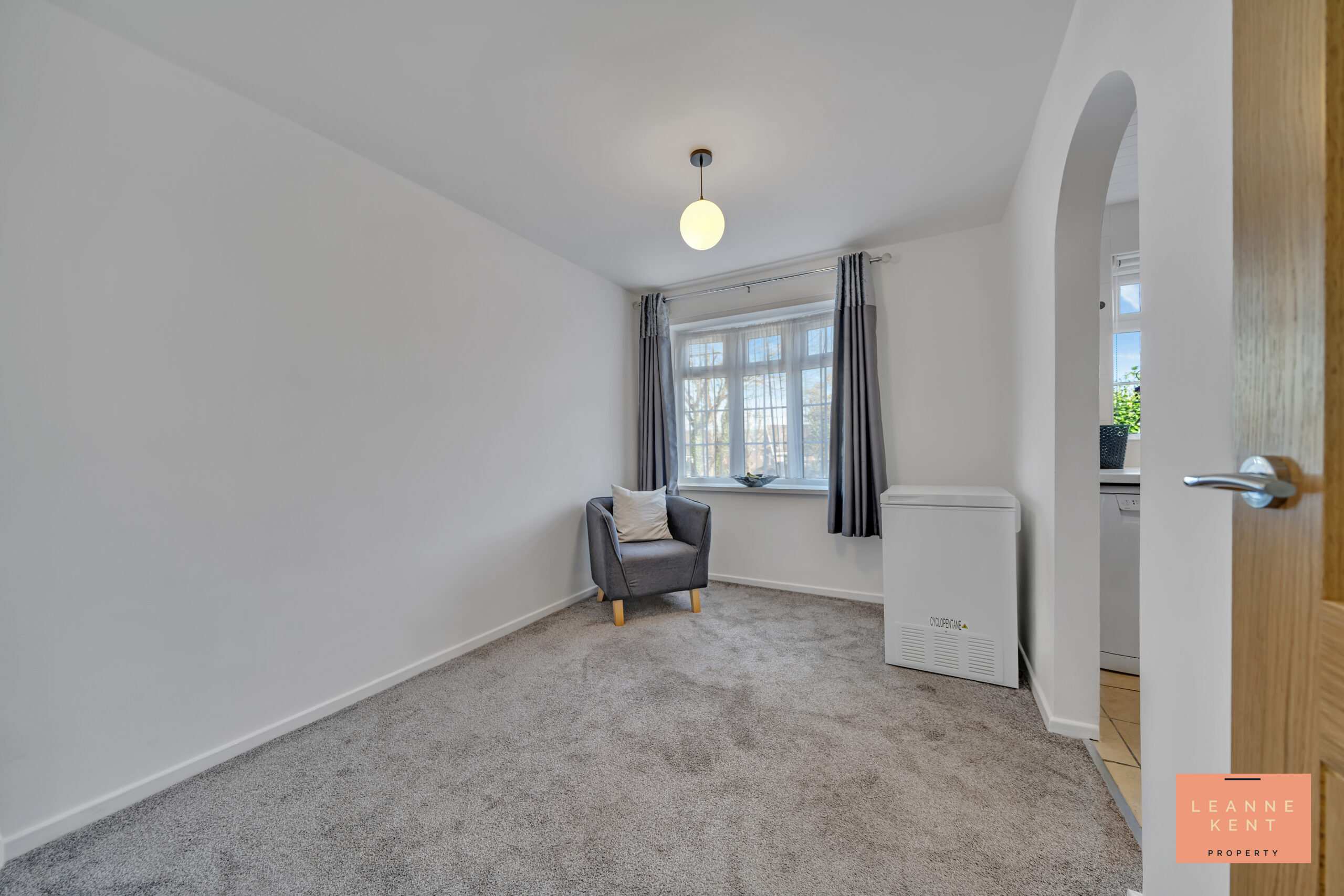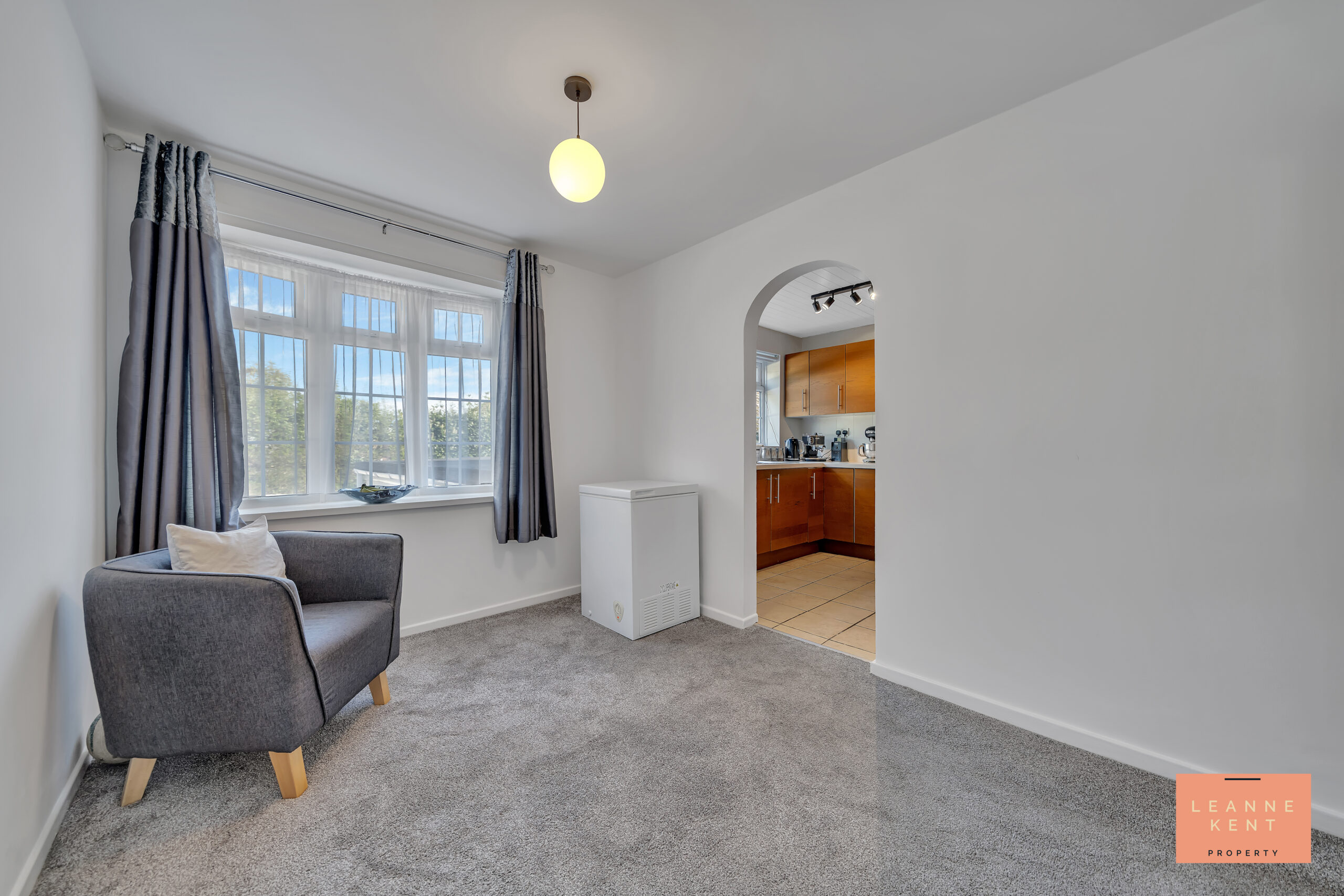 The dining room is easily accessible from the kitchen courtesy of an arch connecting the two. The room is tastefully finished with a modern grey carpet and white walls. A large front bay window ensures plenty of natural light during the day. The room further benefits from a radiator and multiple power sockets.