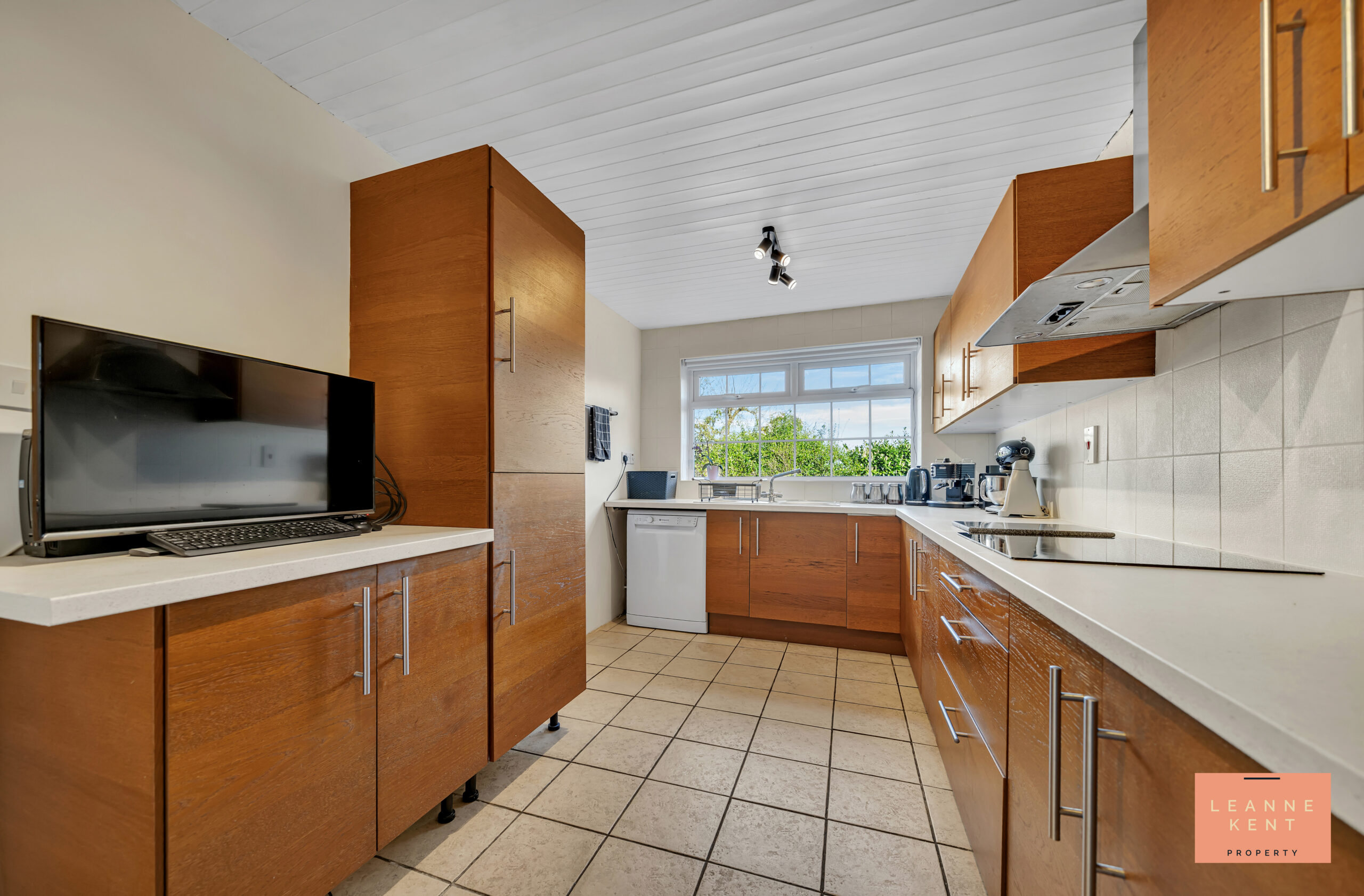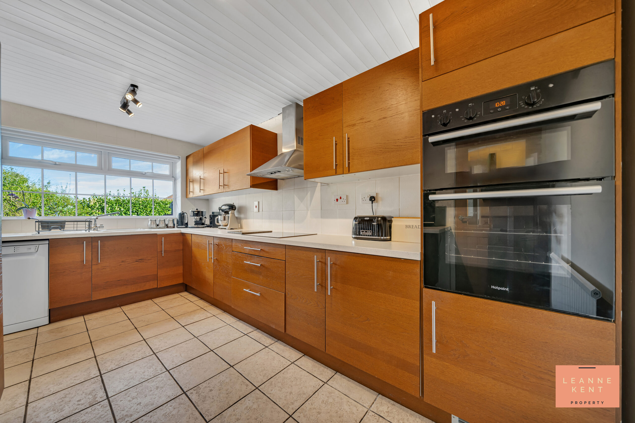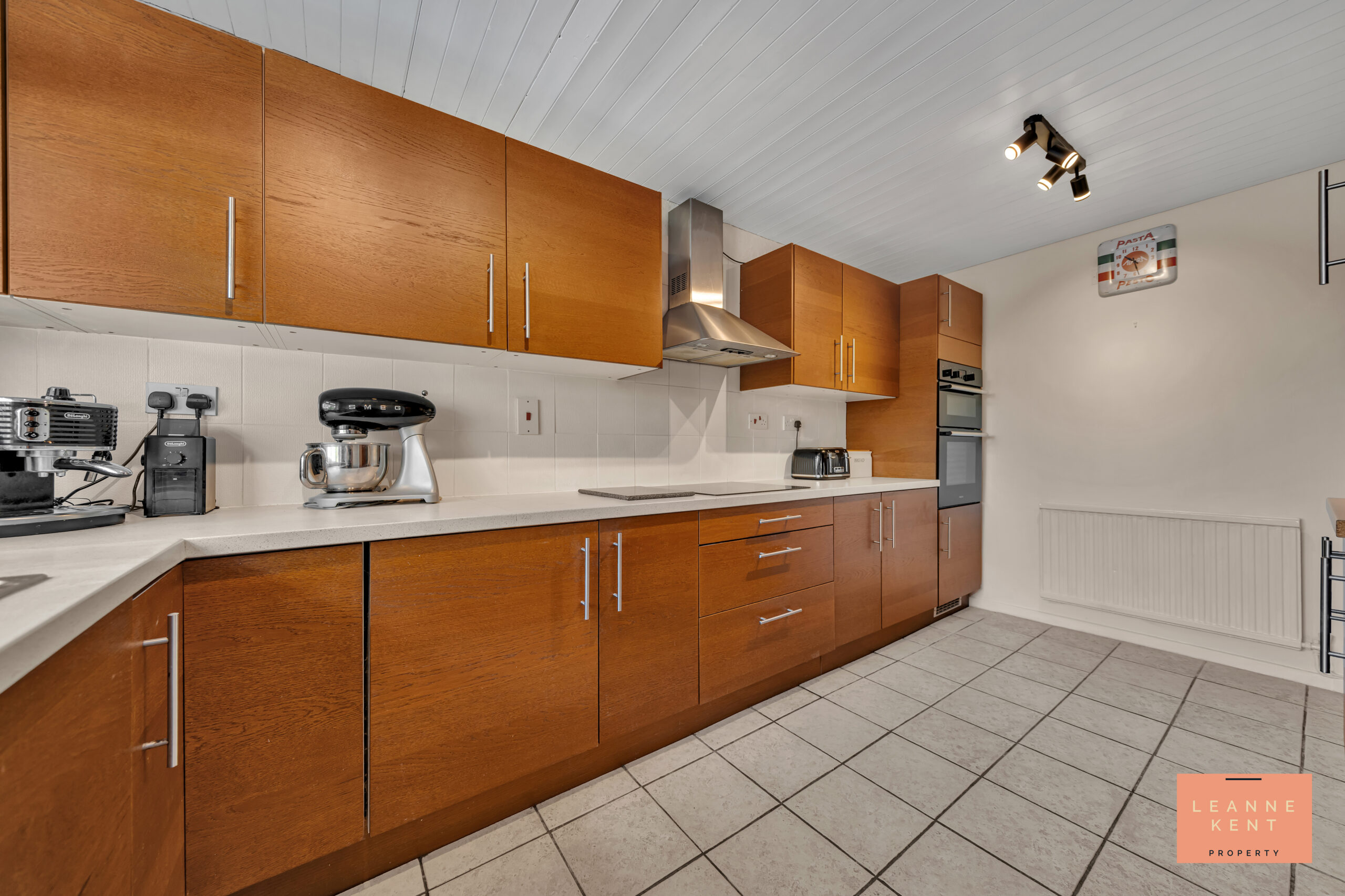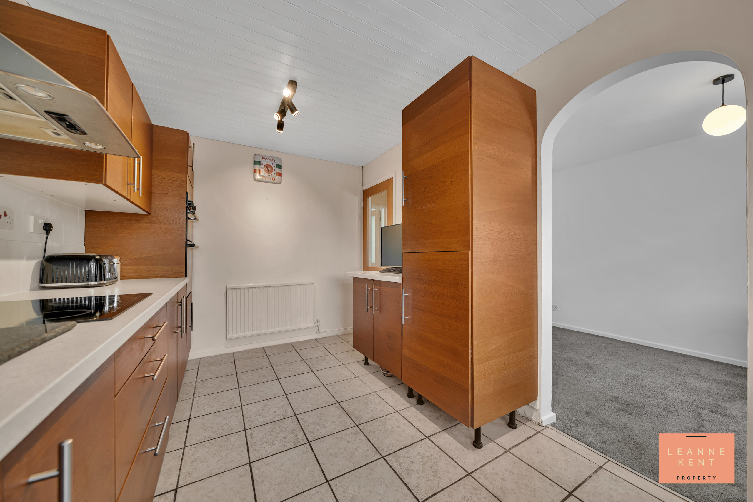 The kitchen diner is beautifully presented and is modern and stylish. Light-coloured floor tiles are complemented by light decor. The kitchen cabinets are finished in a stylish wood colour and complemented with a light cream modern worktop. The integrated hob sits below a modern extractor hood, whilst an oven and microwave integrate into the cabinetry. The kitchen sink sits below a large window. There is ample worktop and cupboard space in this kitchen, and also integrated appliances. An arch leads into a reception room, which would make an ideal dining room.
