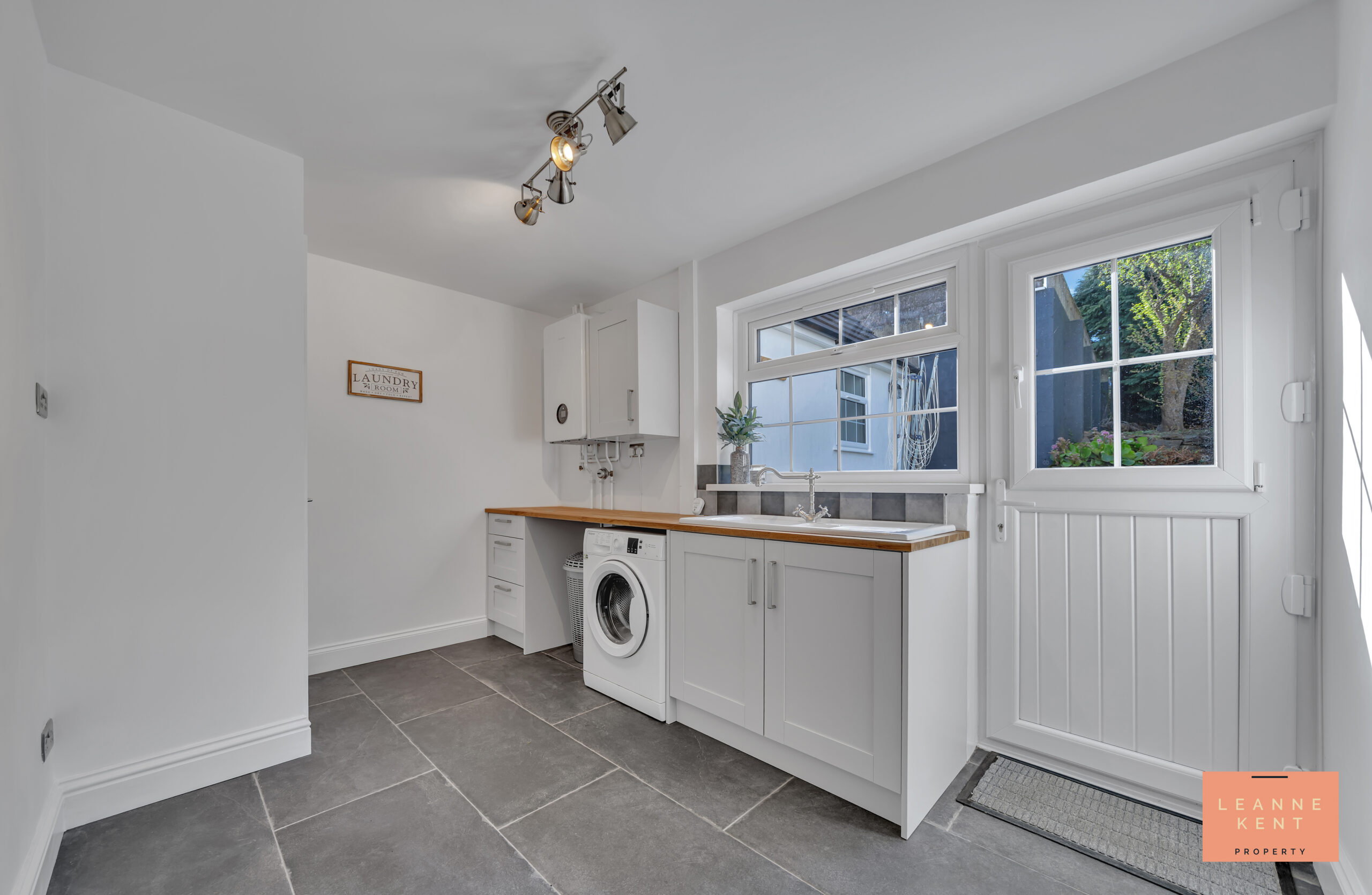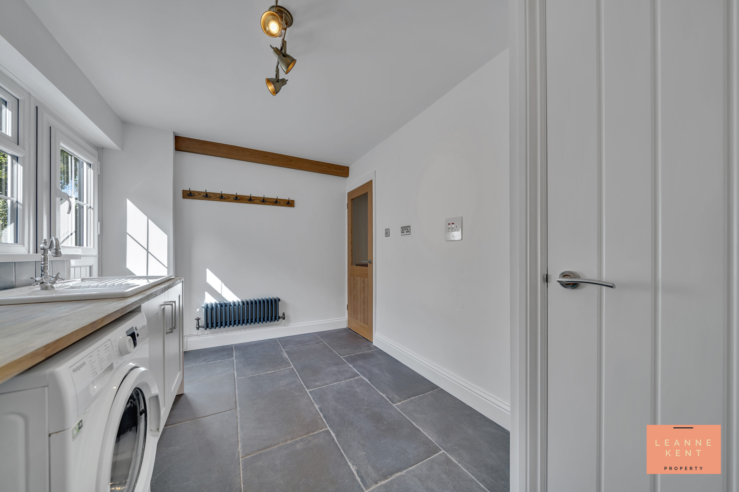 The property benefits from a good-sized utility room, which is tastefully finished with slate floor tiles and white decor. On one side is a worktop with cabinets, complete with a sink. There is also plumbing for a washing machine under the worktop. The sink sits below a large window, whilst next to it is a stable-style door, so you can open the top half when you just need fresh air to filter in. In one corner is a large cupboard. The rooms further benefit from a radiator, coat hooks and multiple power sockets.