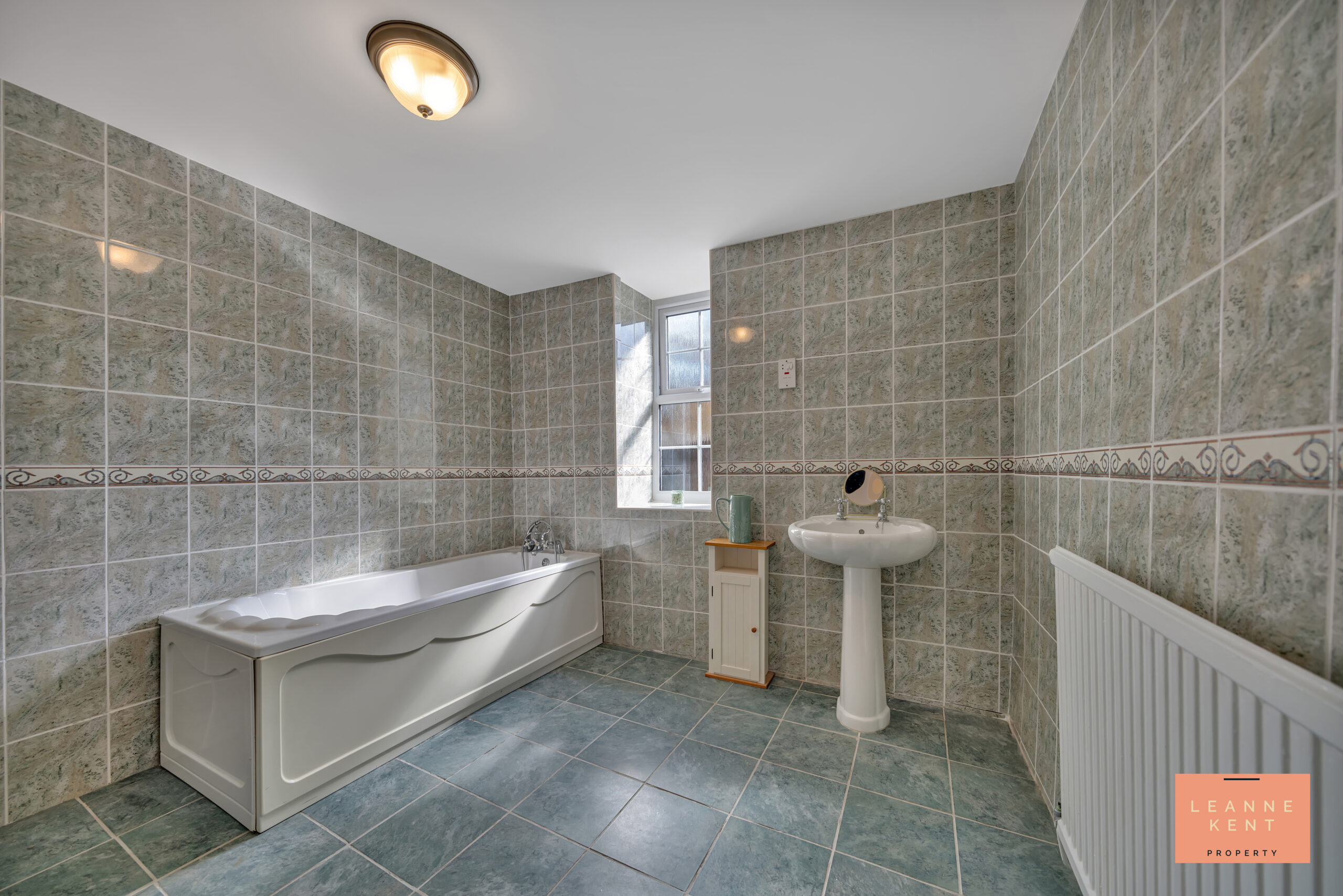 The ground-floor bathroom is located in the historic part of the building and supports the three bedrooms located close by. The room is finished with decorative floor and wall tiles. In one corner is a bath, and next to this is a hand basin. The room further benefits from a frosted window and a radiator.