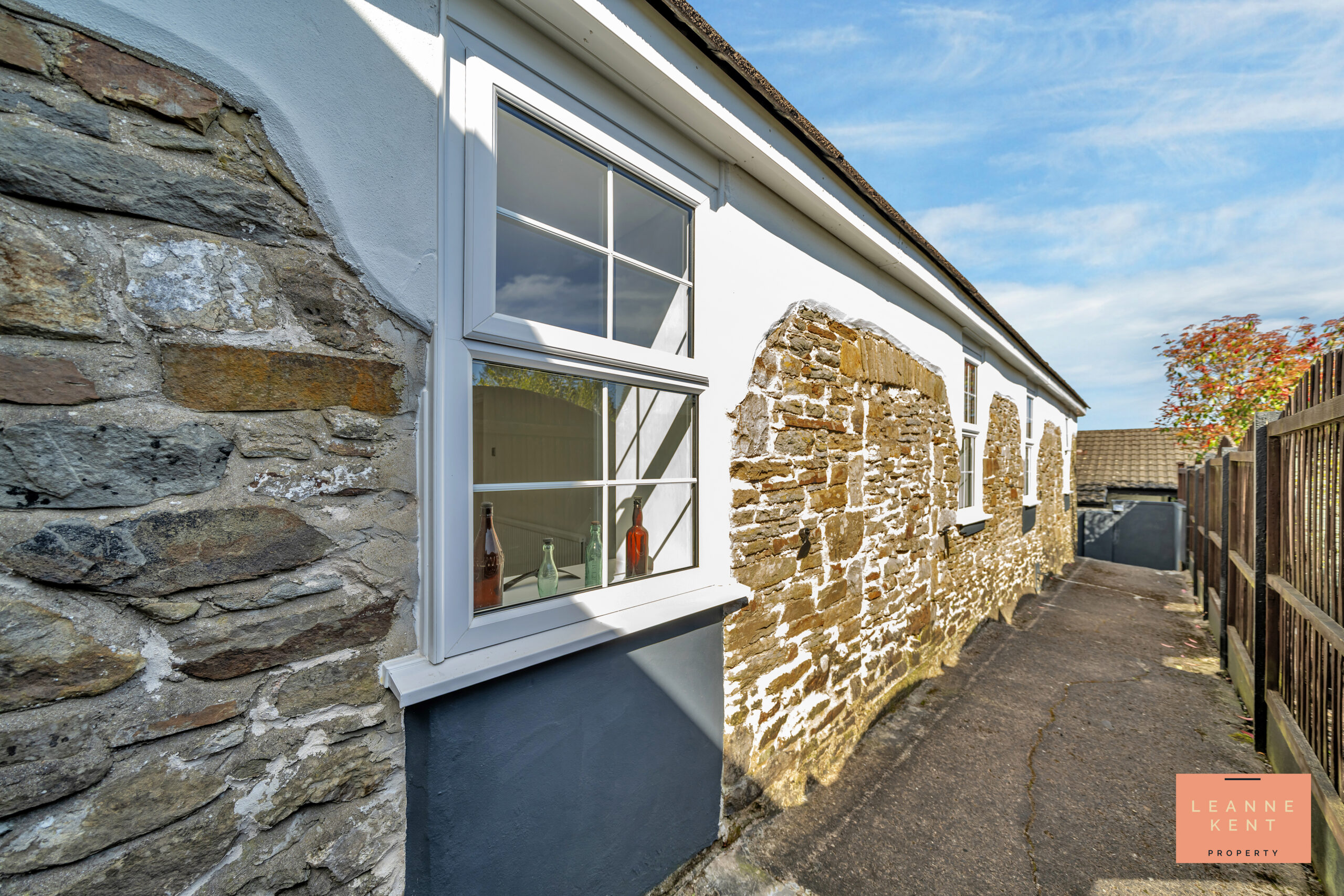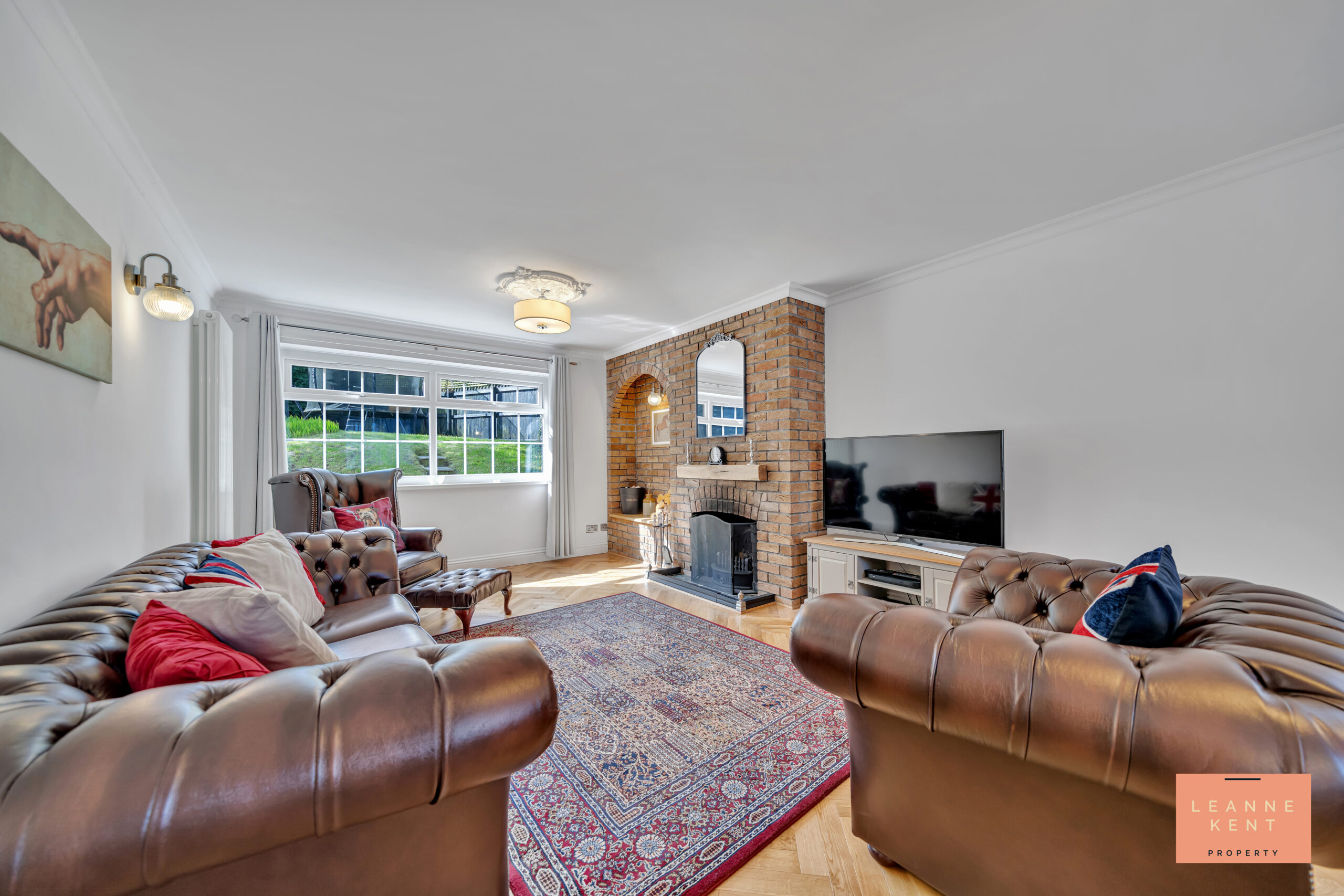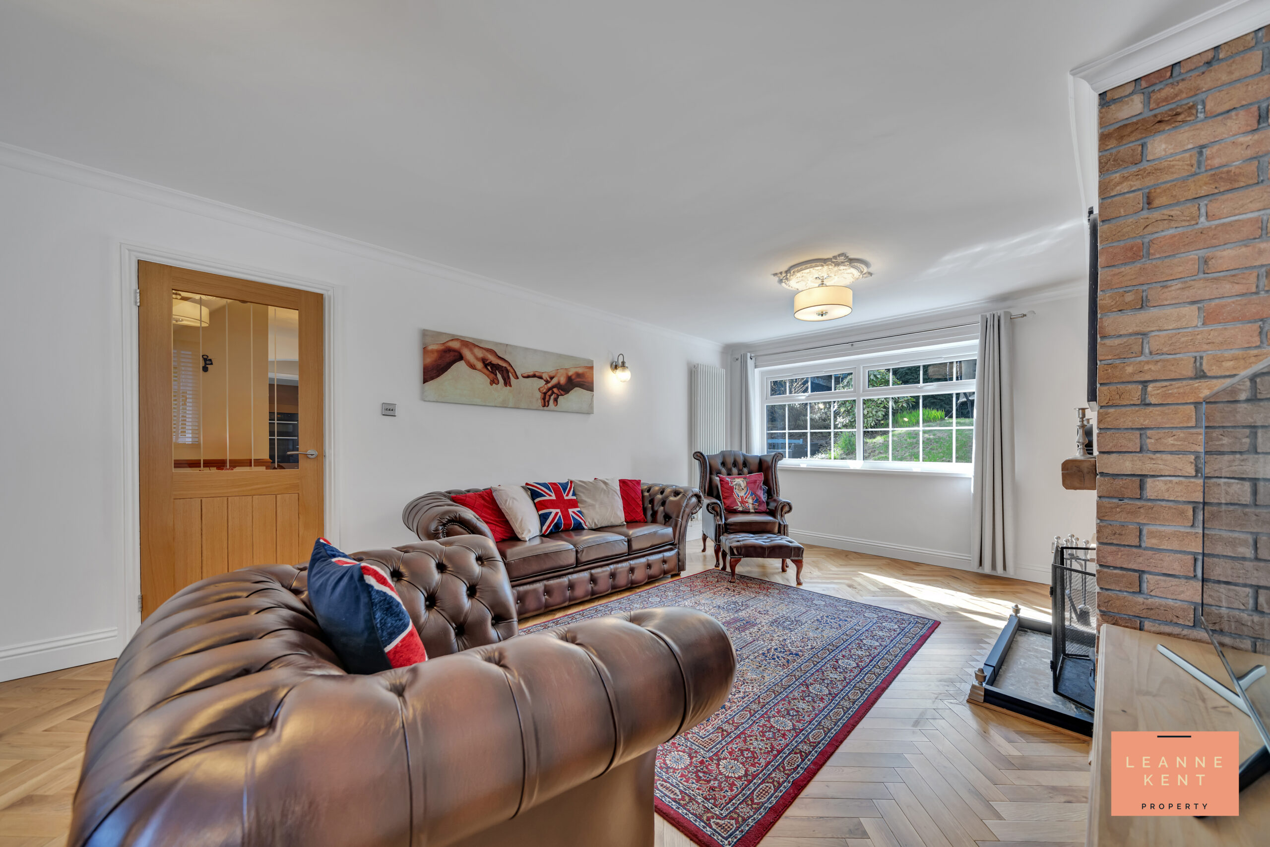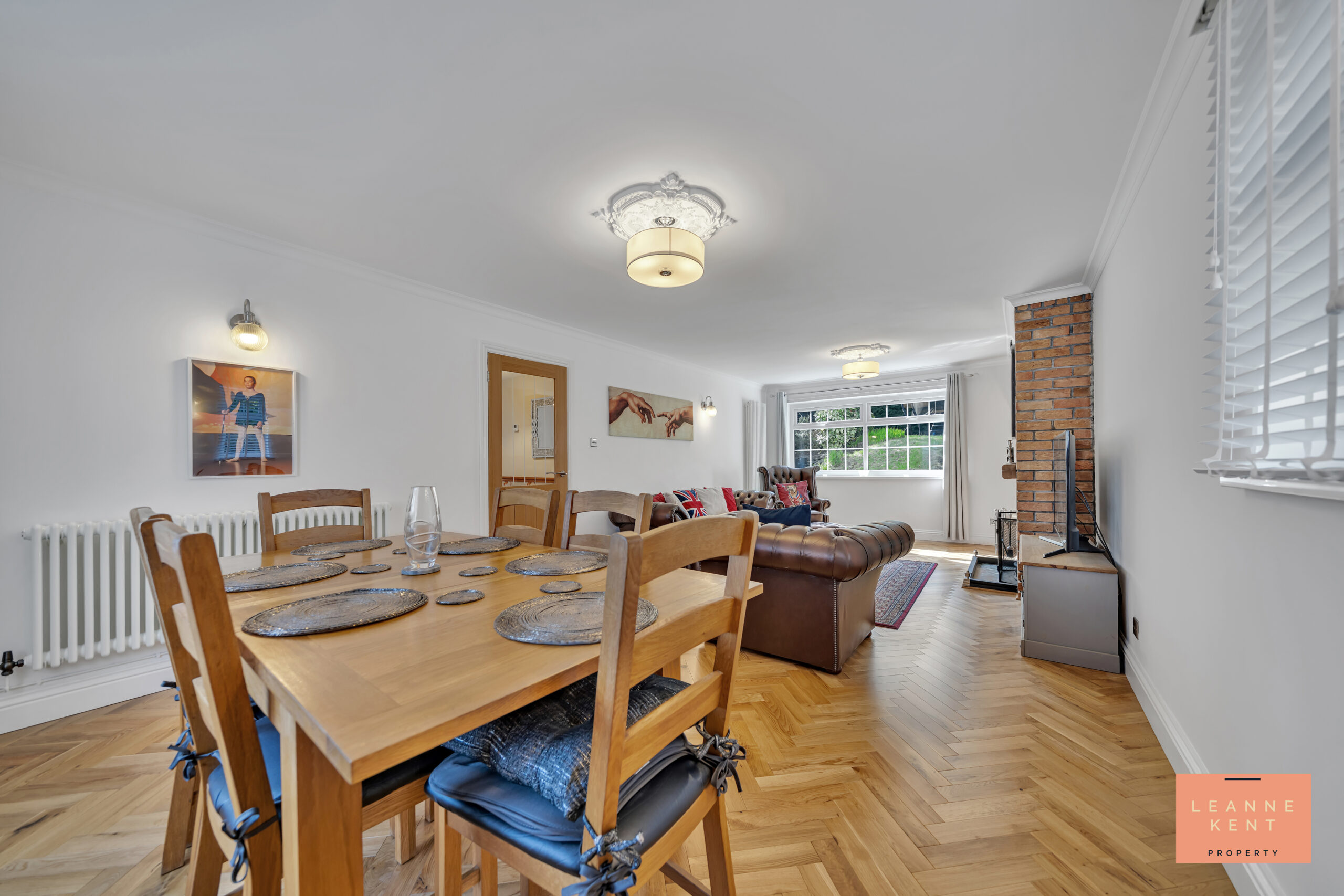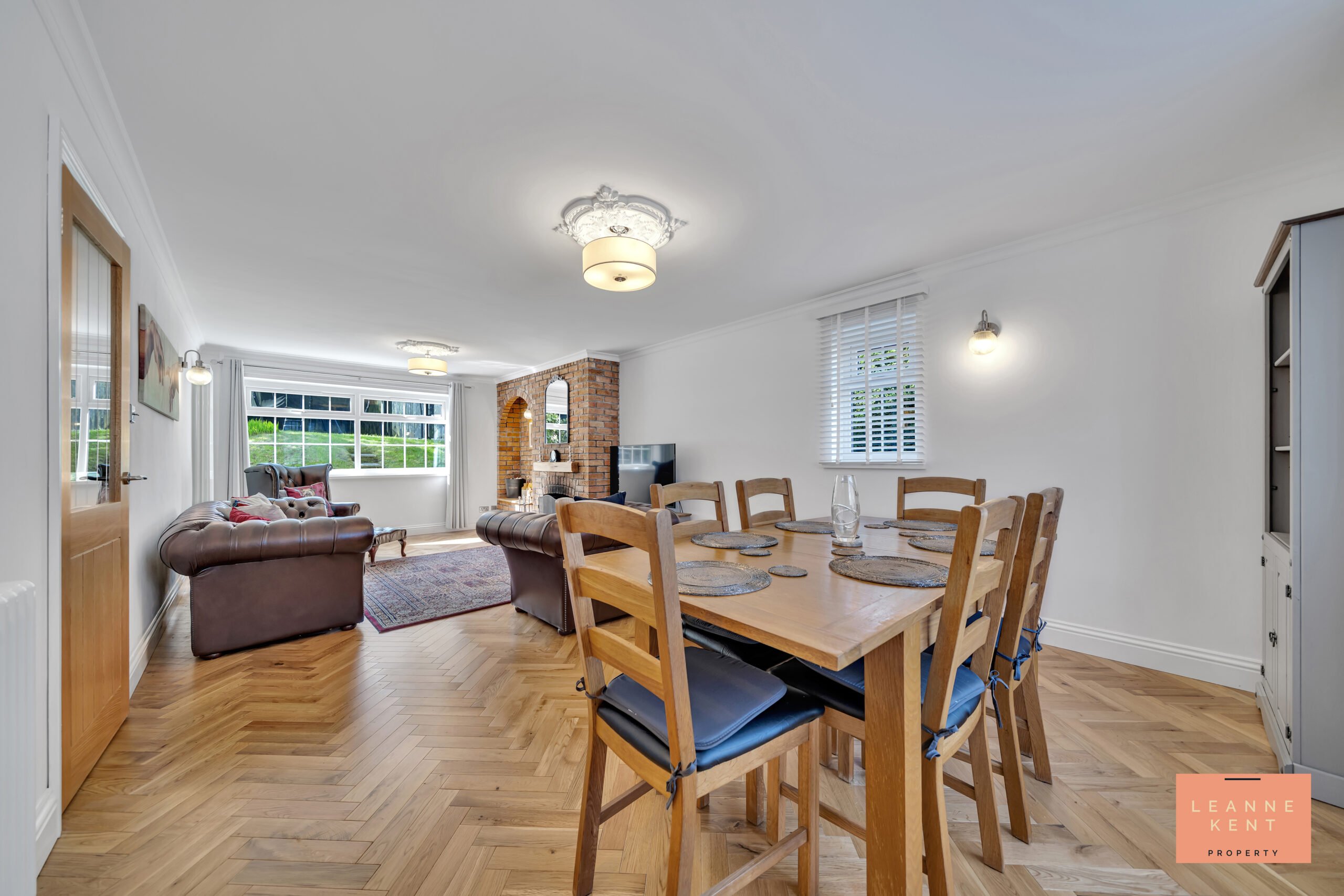 The lounge diner is spacious and beautifully presented. The room is full of character and charm, and finished with beautiful herringbone-style flooring and white walls. Large windows at the front and the back allow natural light to flood the room during the day. A third side window ensures even more natural light. The room is spacious enough to serve as both a lounge and a dining room. The lounge area benefits from an exposed brick feature wall, which includes a decorative arch with a shelf underneath, and then a working character fireplace. The room further benefits from two decorative radiators and multiple power sockets.