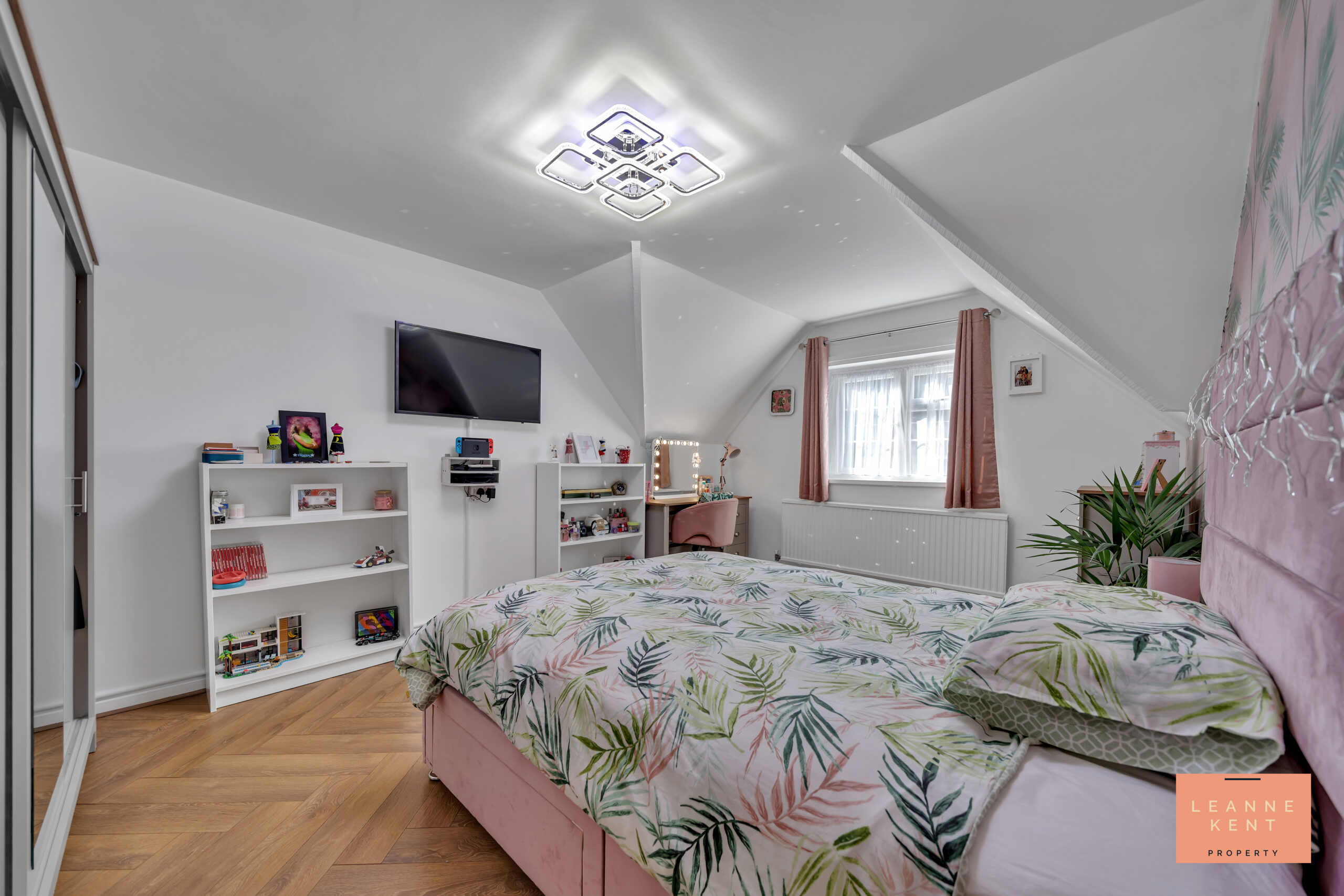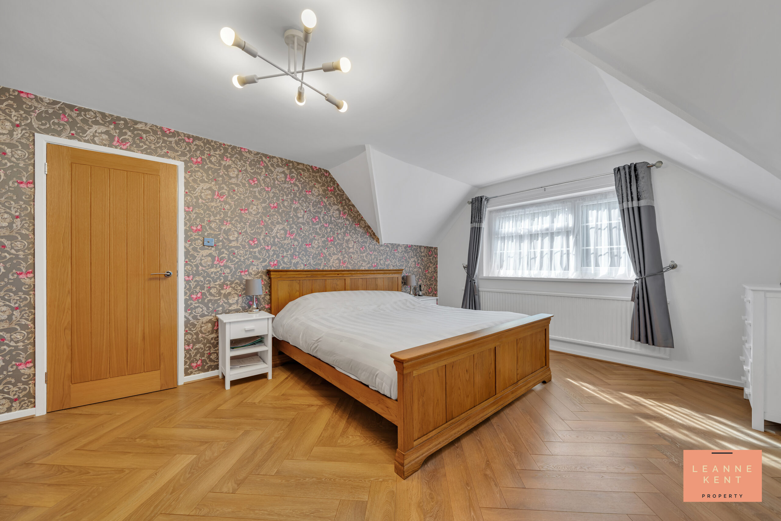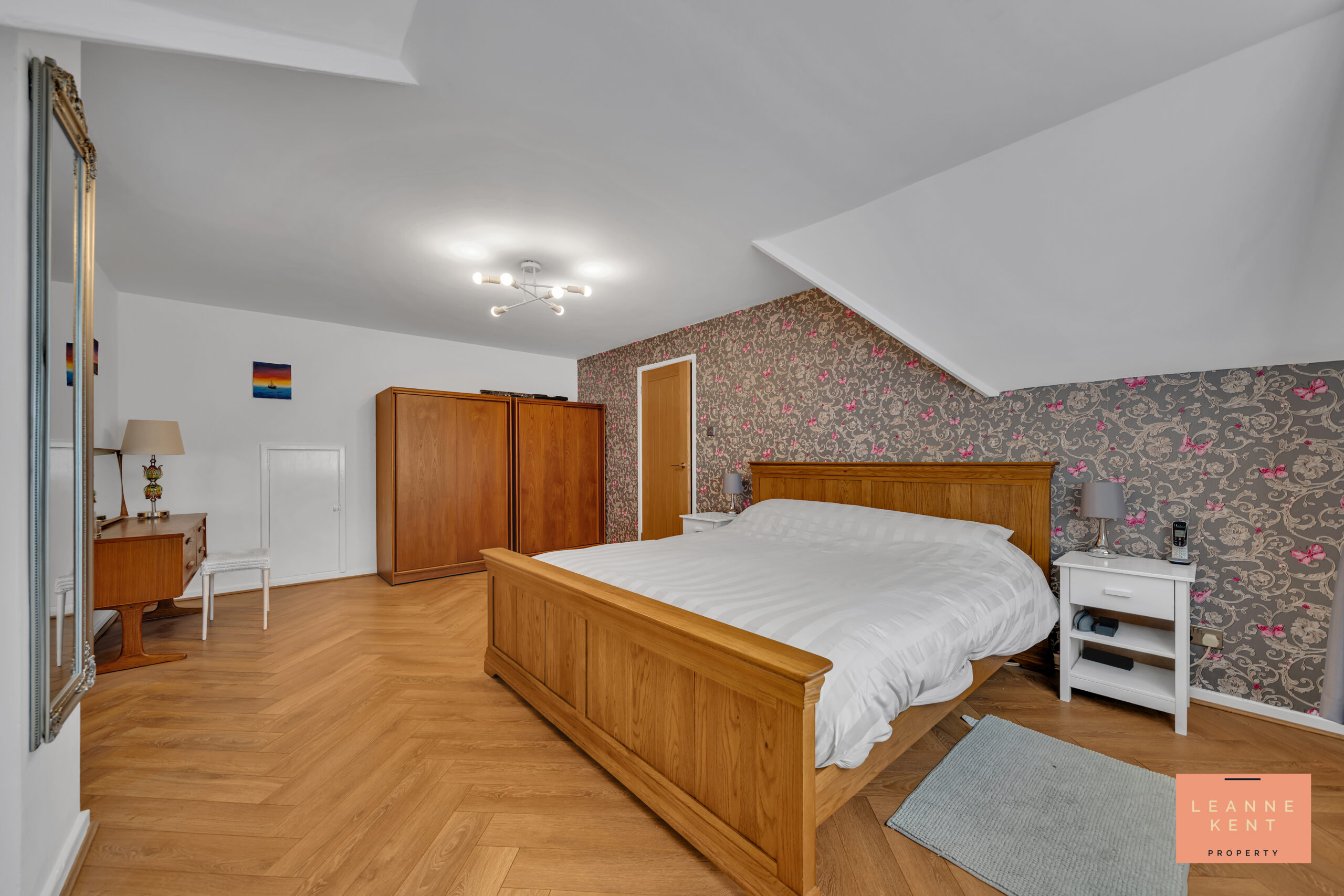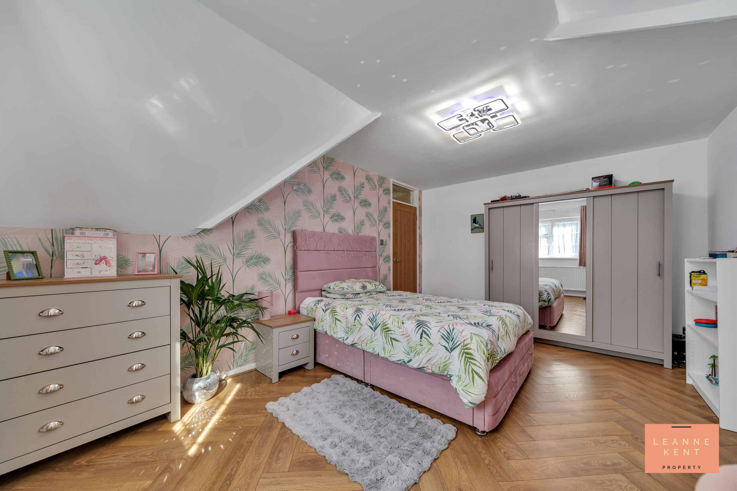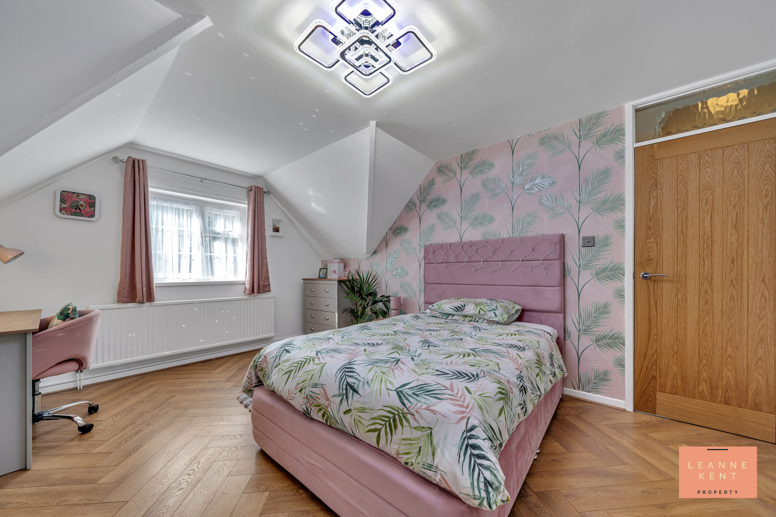 Bedroom two is located on the first floor close to the main bedroom. The room is beautifully presented with parquet flooring and white decor. One wall serves as a feature and is finished with stylish pink-and-silver wallpaper. A large window allows natural light to filter in during the day and offers views over the garden. The room further benefits from a radiator and multiple power sockets.