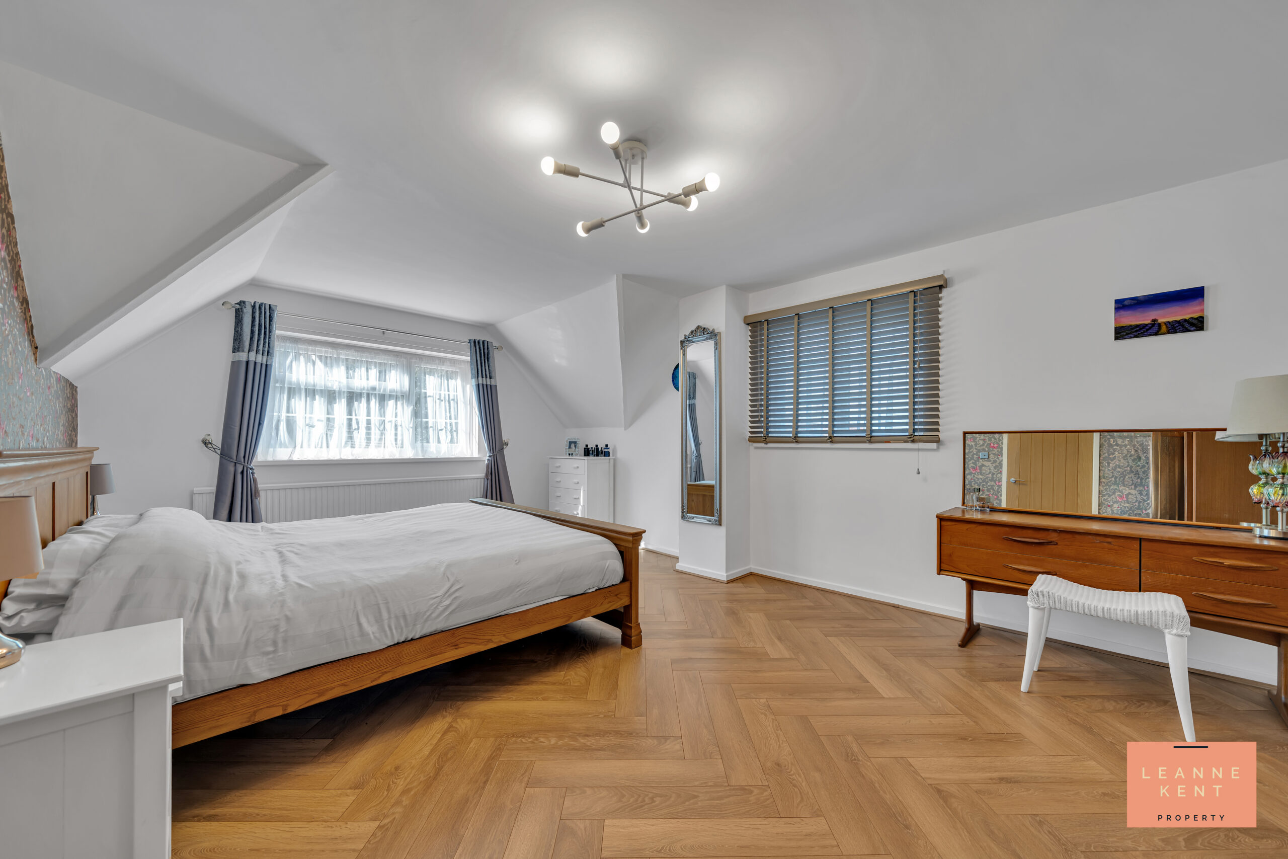 Bedroom one is located in the new part of the house on the first floor. The room is beautifully presented, with stunning herringbone-style wood flooring and white decor. One wall is finished with stylish wallpaper, which adds depth and colour to the room. A large window lets natural light flood the room during the day and offers views of the beautiful garden. There is access to eaves storage, but the room is large enough for a large bed and associated bedroom furniture. The room further benefits from a radiator and multiple power sockets.