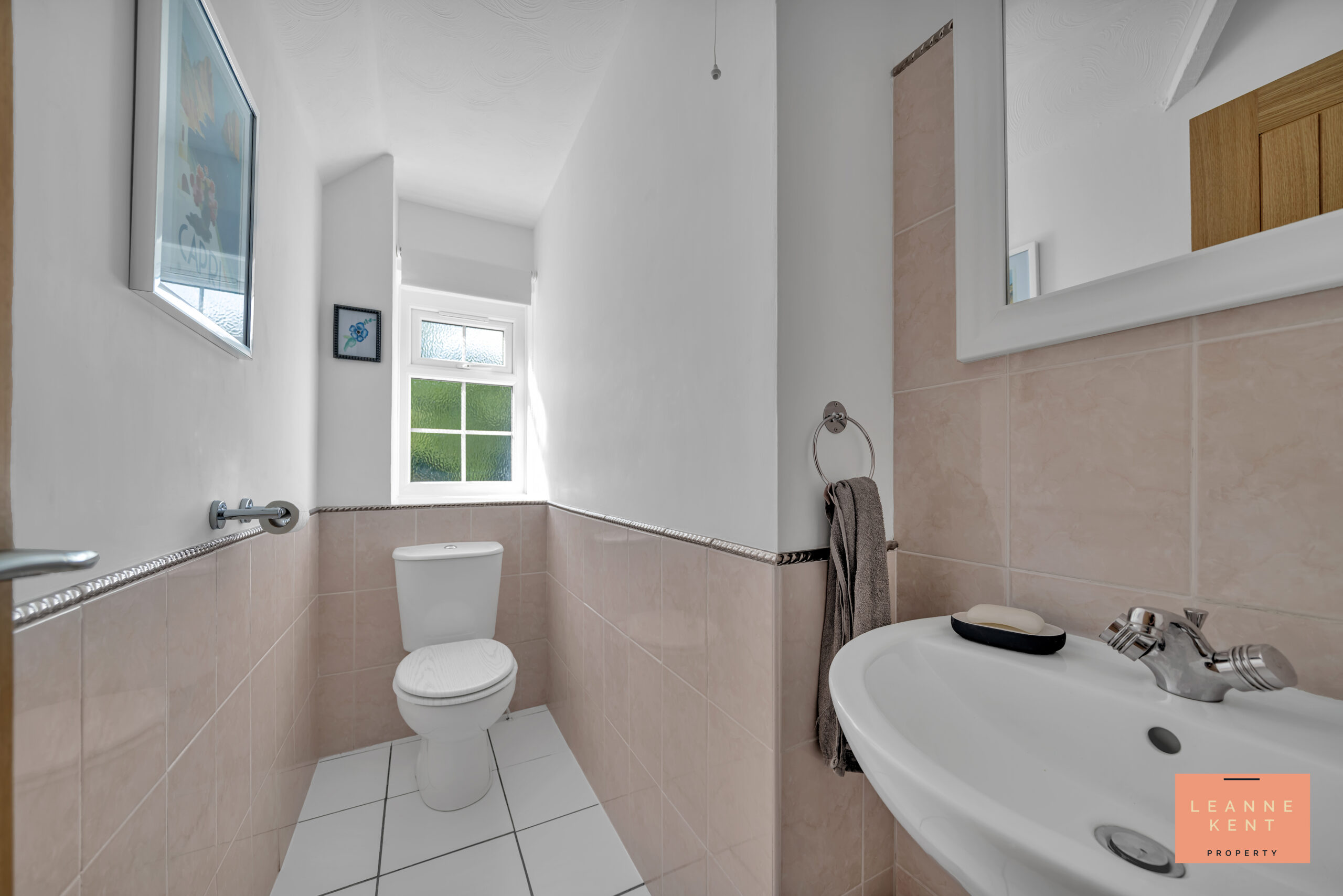 The upstairs WC is located next to the family bathroom and is tastefully finished with white floor tiles and white walls with decorative pink wall tiles beneath. The room includes a modern toilet and a hand basin.