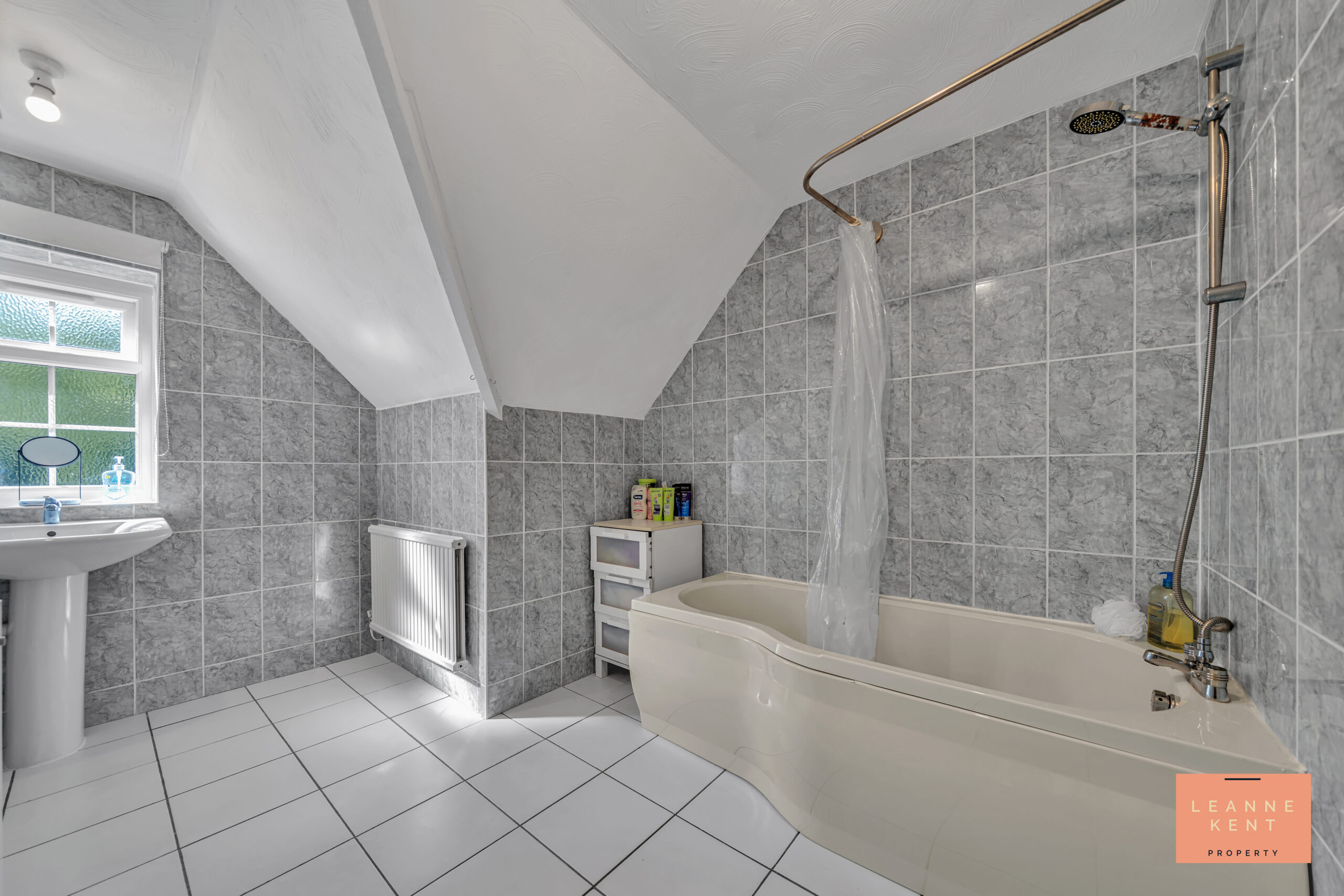 The main family bathroom is located between bedrooms one and two, and is a good-sized bathroom. The bathroom is finished with white floor tiles and decorative grey wall tiles. A bath sits in one corner, complete with an overhead shower. The hand basin sits below a frosted window. The toilet is separate for convenience.