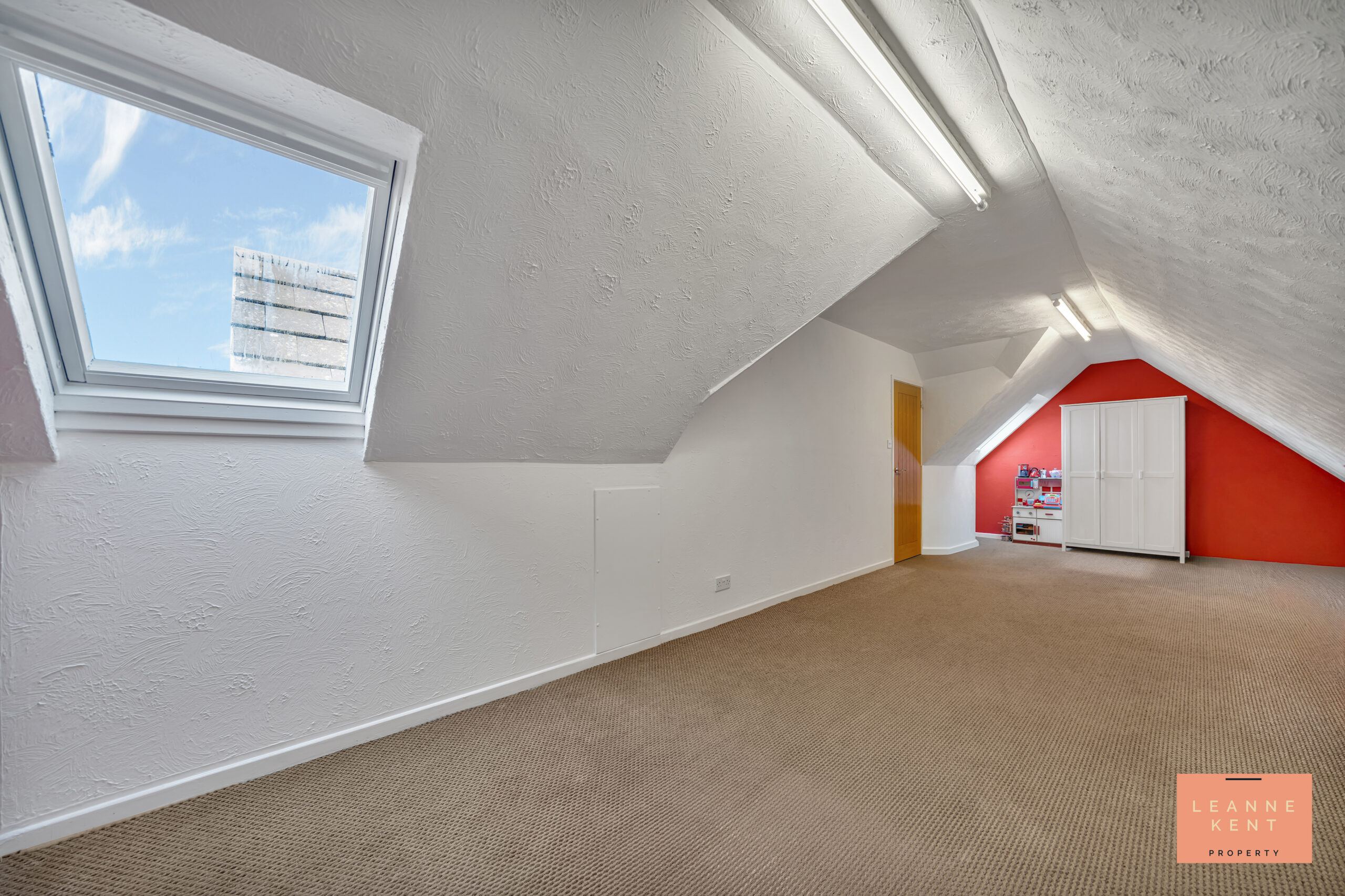Located on the first floor within the Barn section of the home is this large reception room, which leads to a bedroom. This room could be used for many reasons, including a great lounge area for an older child, due to being connected to a bedroom. The room is tastefully finished with a brown carpet, white decor and two skylights.