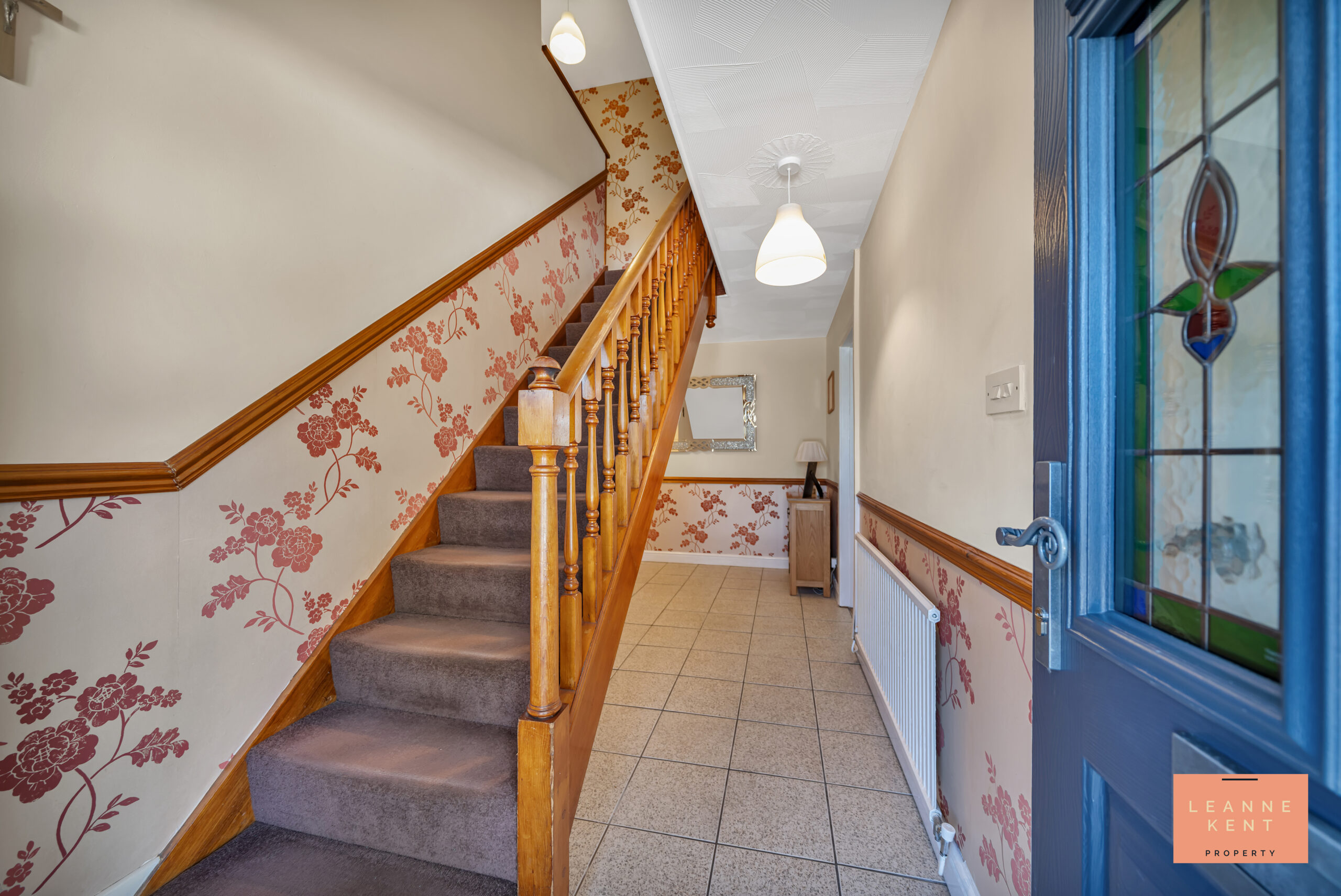 The entrance hall is tastefully finished and welcomes you into the amazing character property, which is full of charm and history. As you enter, you are met with well-maintained floor tiles and a combination of neutral decor with flower-inspired wallpaper. On the left, stairs lead up to the first floor and are carpeted in brown with a natural wood balustrade. The entrance hall bends to the left and allows access to multiple rooms in this spacious property.
