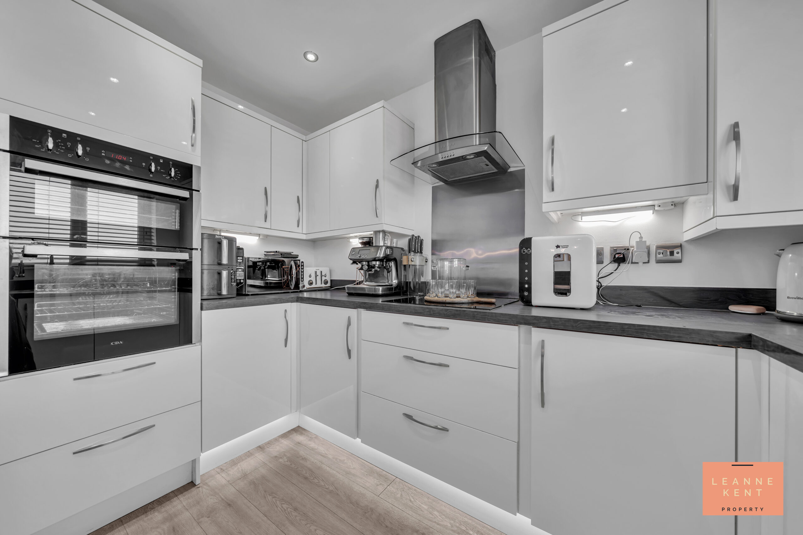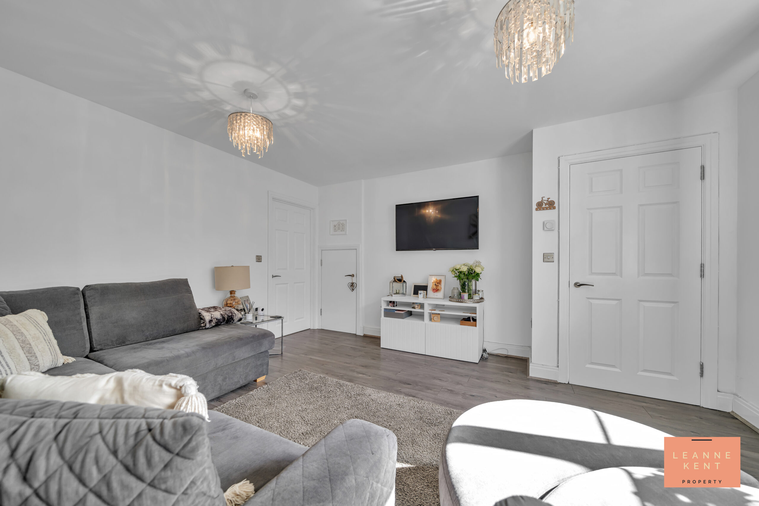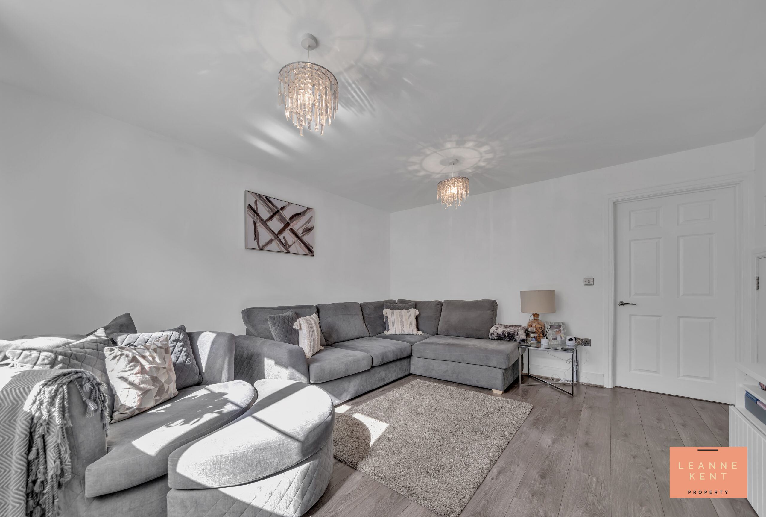 The lounge is beautifully presented and finished with stylish grey wood-effect flooring and white decor. A large window to the front allows natural light to flood the room during the day. In one corner is a useful cupboard, ideal for storing household items. The room is a good size and offers plenty of options for furniture placement. The room further benefits from a radiator and multiple power sockets.