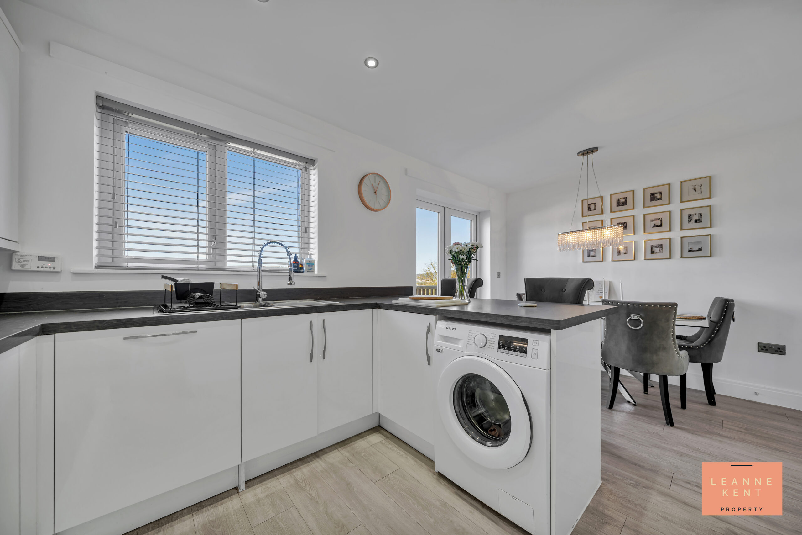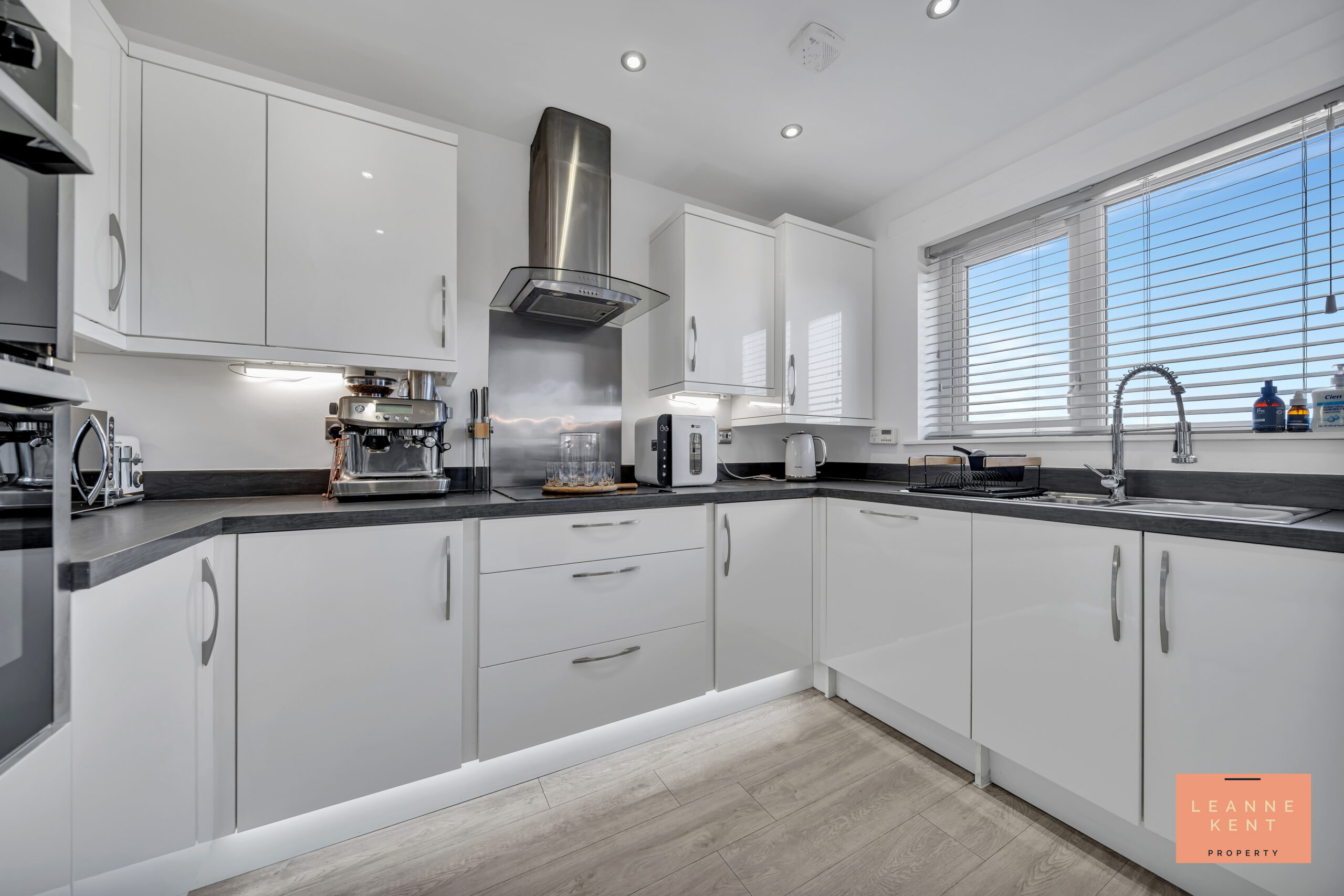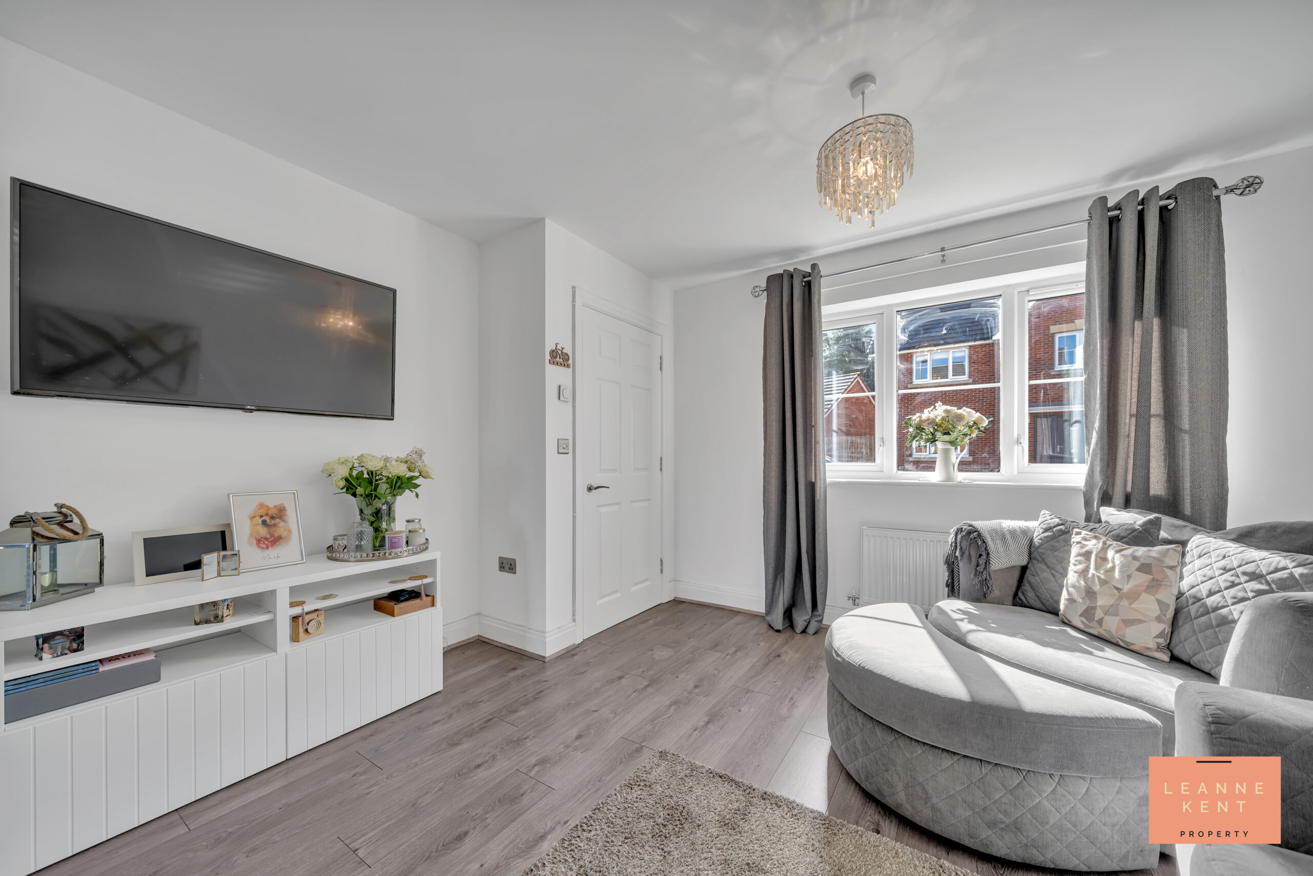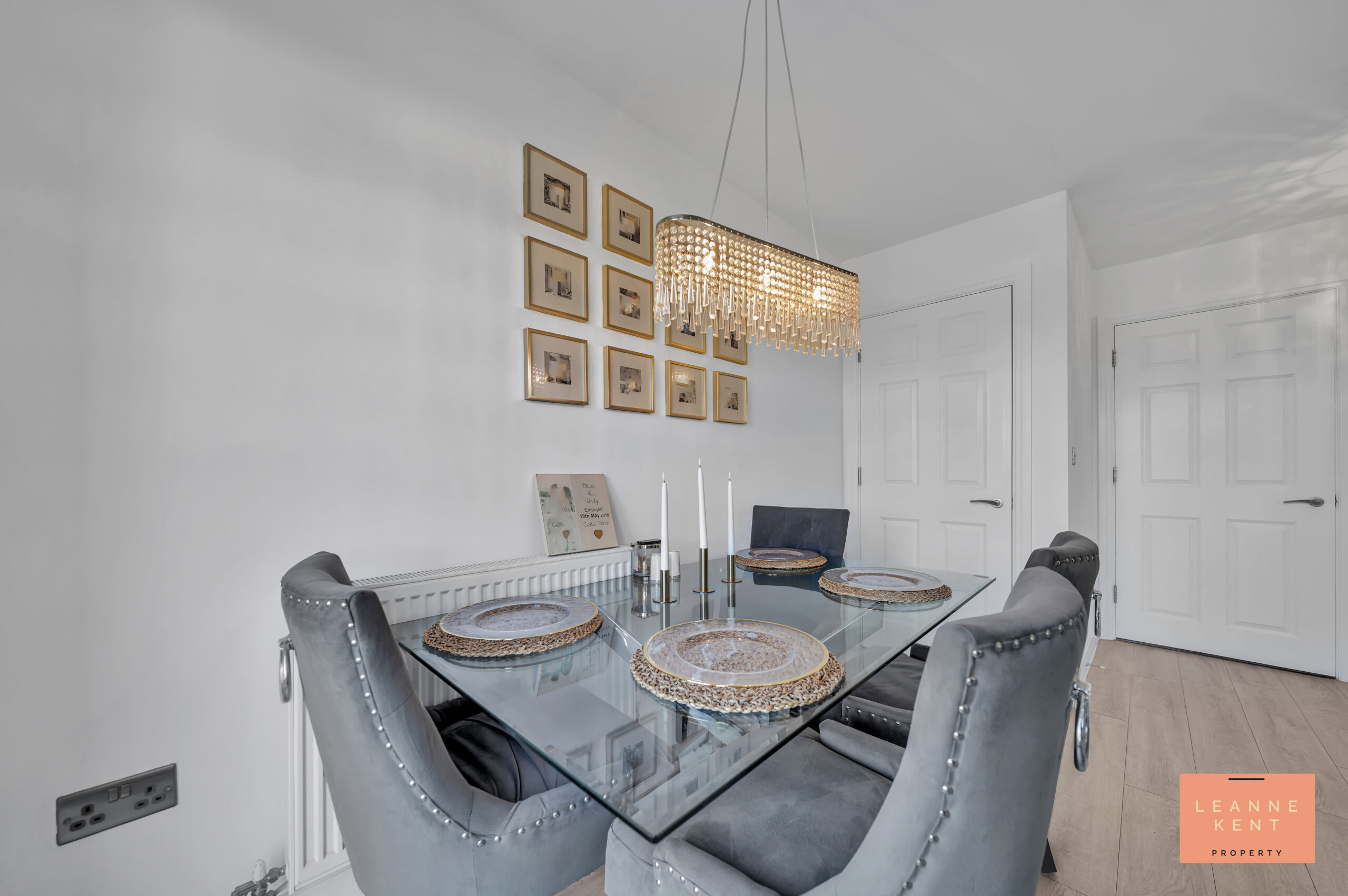 The lounge is beautifully presented and finished with stylish grey wood-effect flooring and white decor. A large window to the front allows natural light to flood the room during the day. In one corner is a useful cupboard, ideal for storing household items. The room is a good size and offers plenty of options for furniture placement. The room further benefits from a radiator and multiple power sockets.