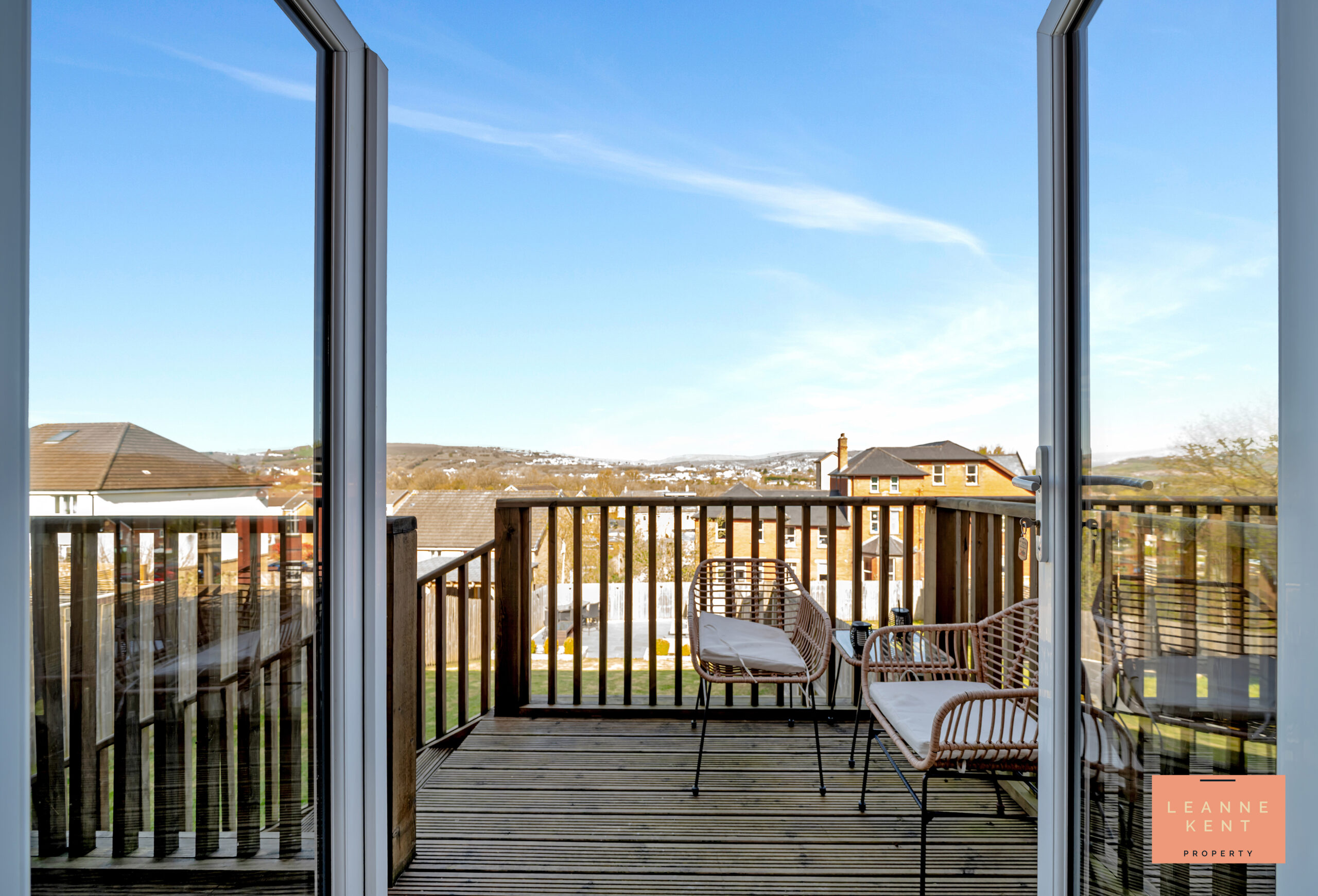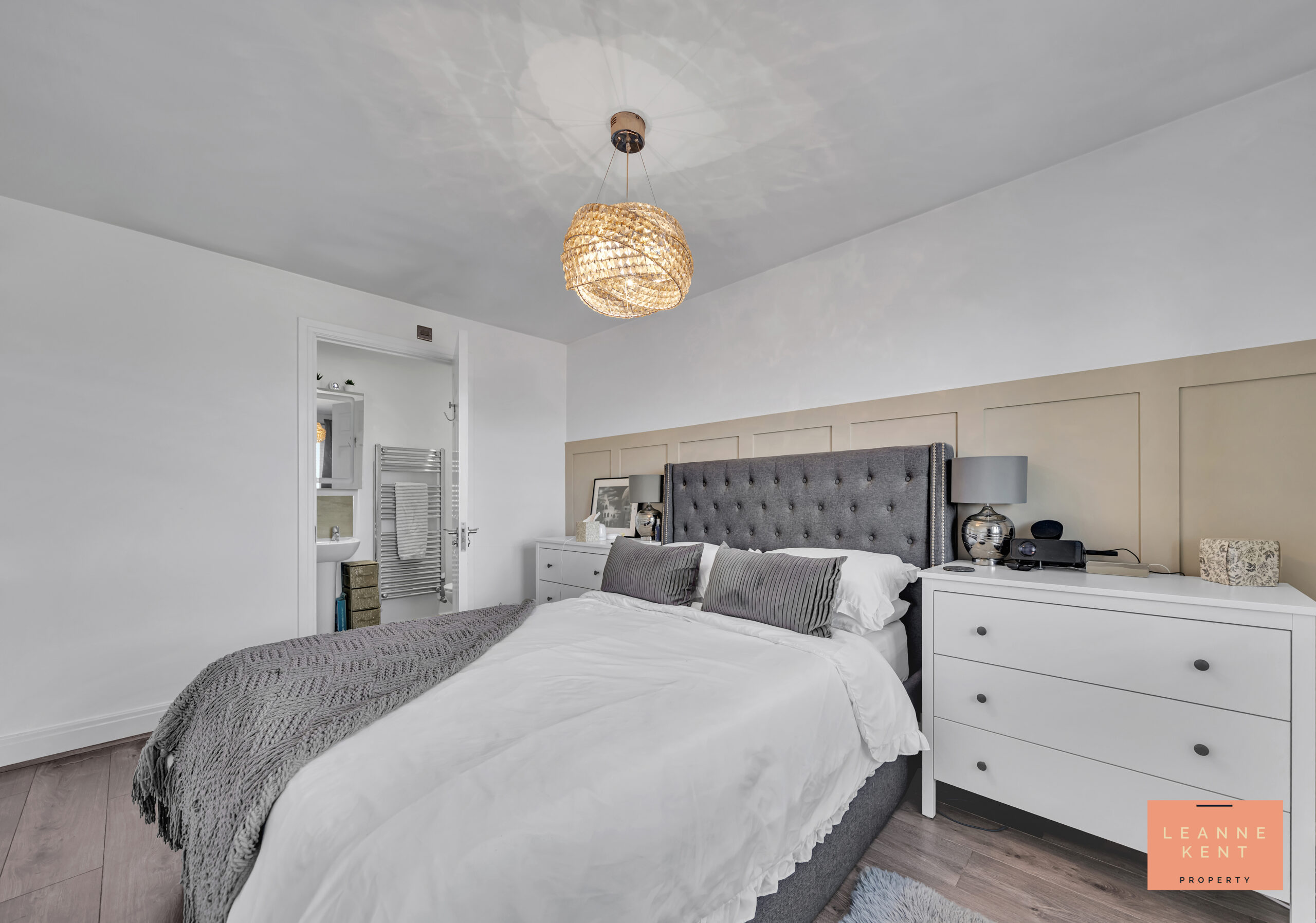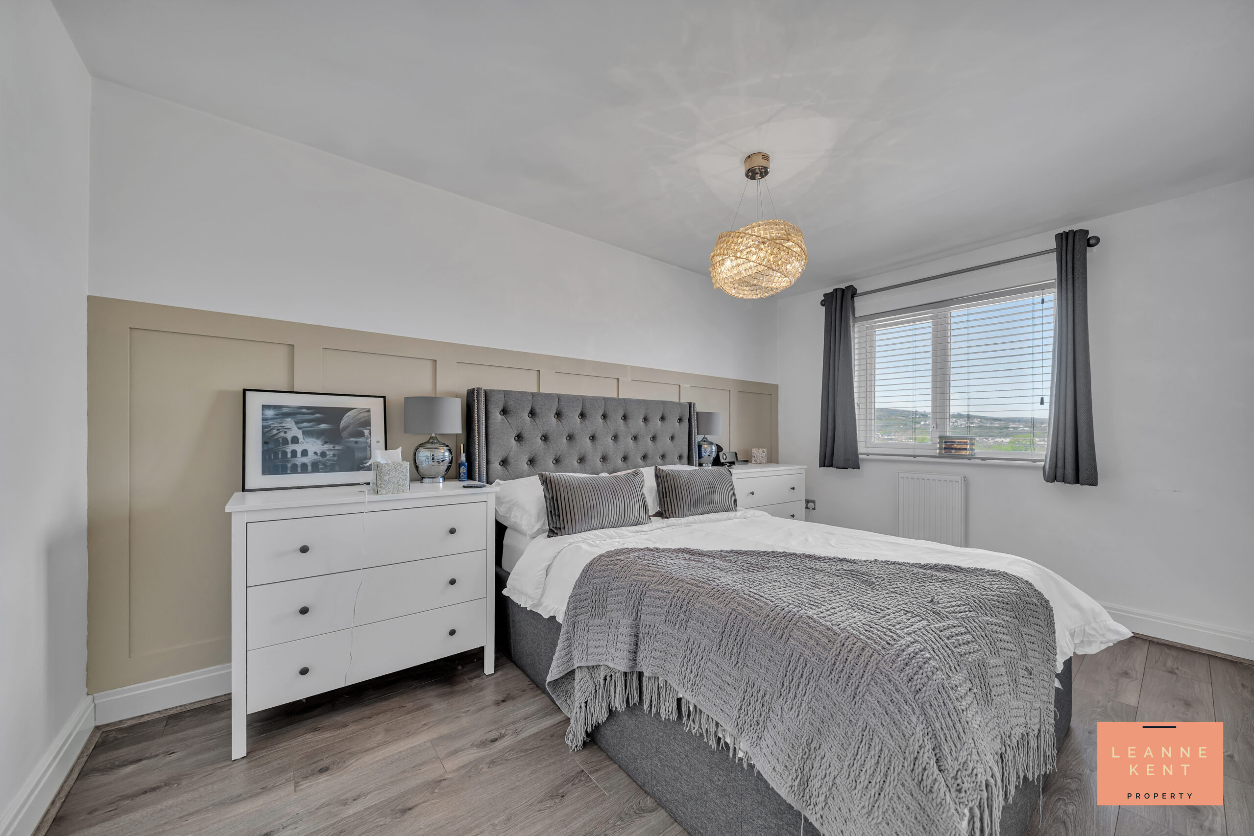 Bedroom one is located at the rear of the property and is a good-sized room. The room is tastefully finished with light grey wood-effect flooring and white decor. On one wall is stylish cream-finished panelling, which adds depth and colour to the room. A large window offers magnificent views of the garden and Caerphilly, with far-reaching vistas. The bedroom also benefits from its own en suite bathroom. The room further benefits from a radiator and multiple power sockets.