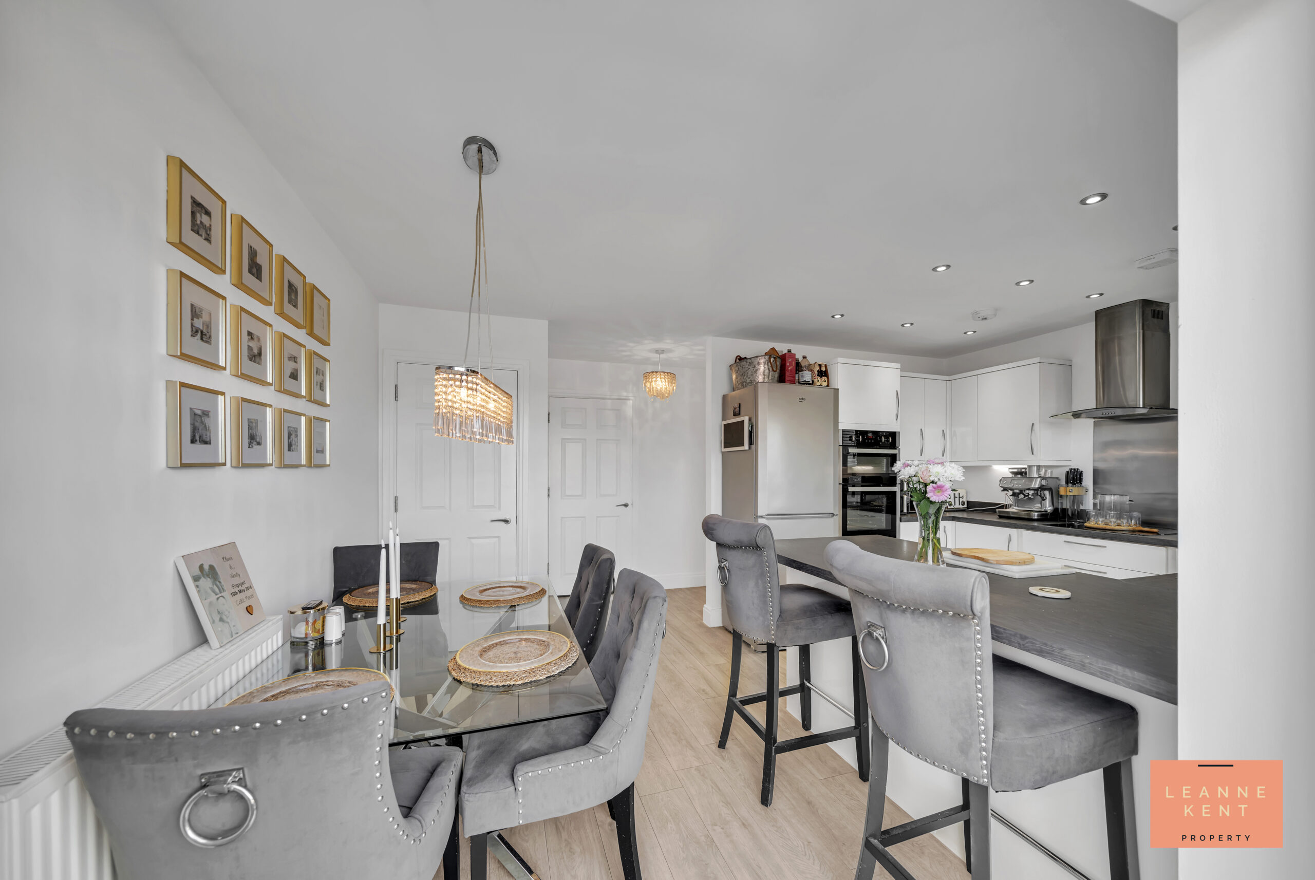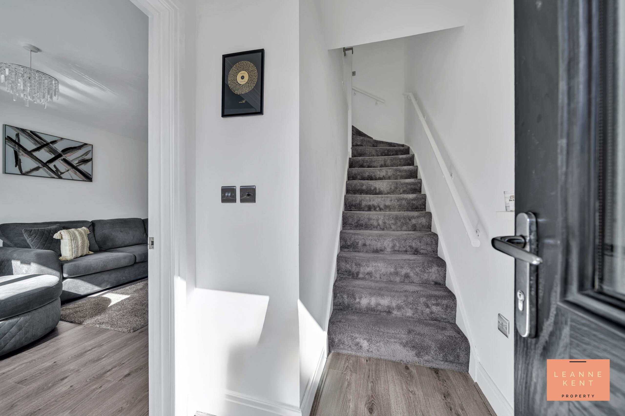 As you step into this beautiful home, you are met with an entrance hall which is tastefully finished with grey wood-effect flooring and white walls. Stairs lead to the first floor and are laid with a modern grey carpet.