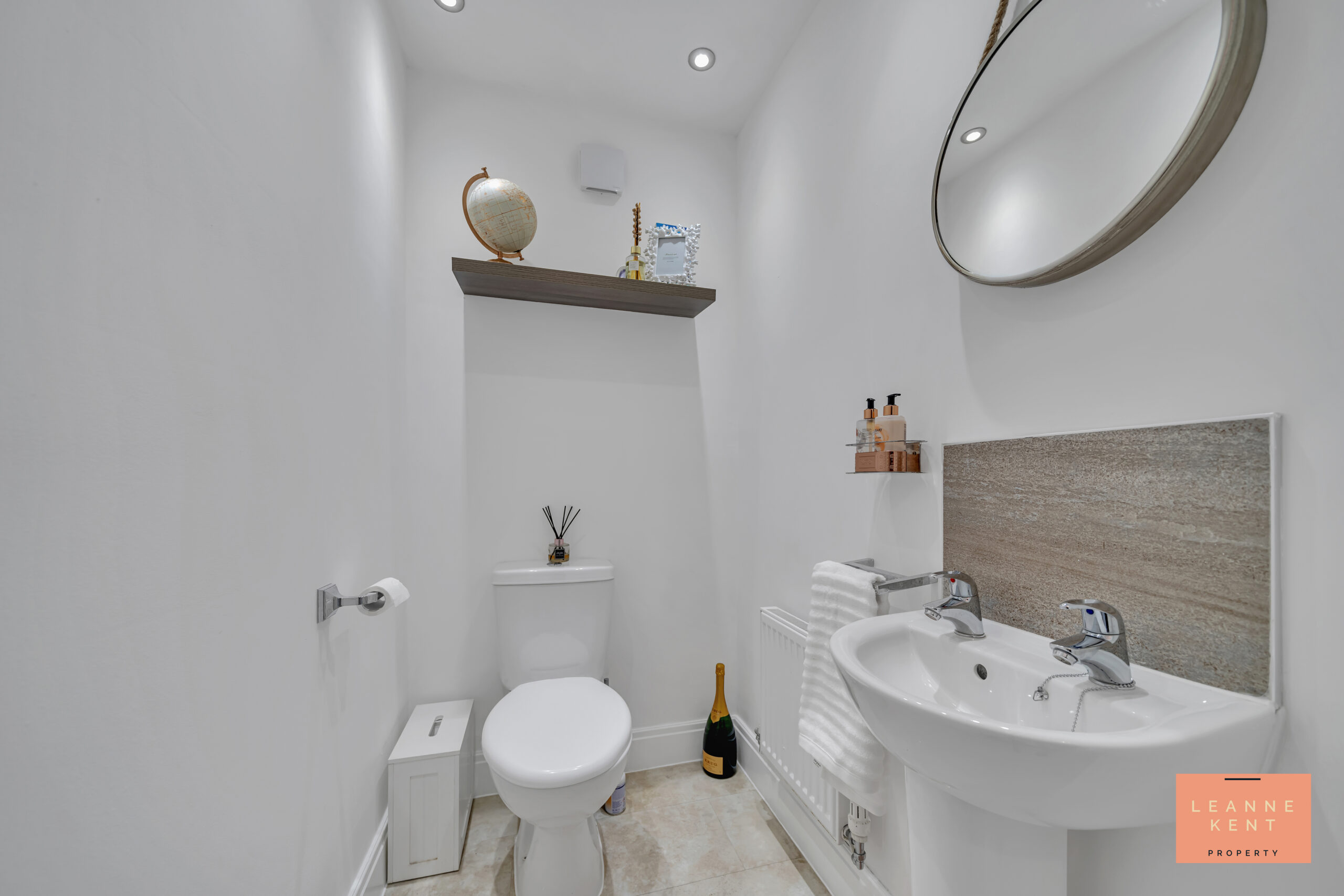 The property benefits from a downstairs WC which is tastefully finished with stylish flooring and white walls. A modern hand basin sits to one side with a brown splashback, and there is also a modern toilet.