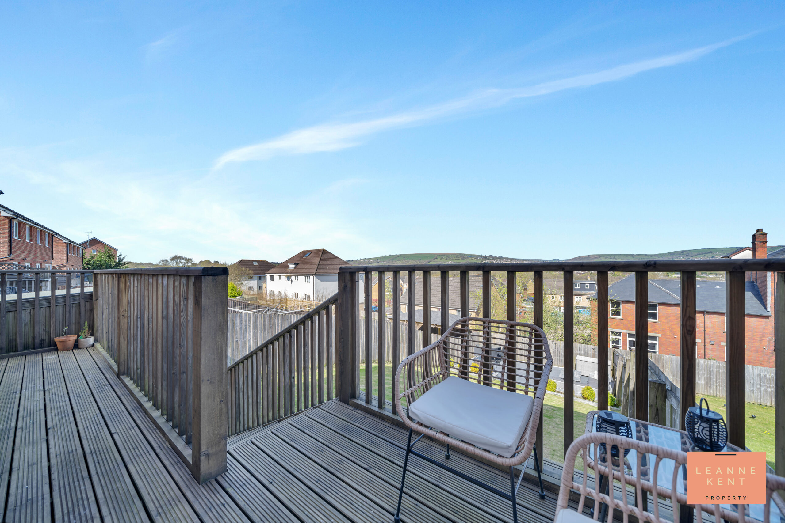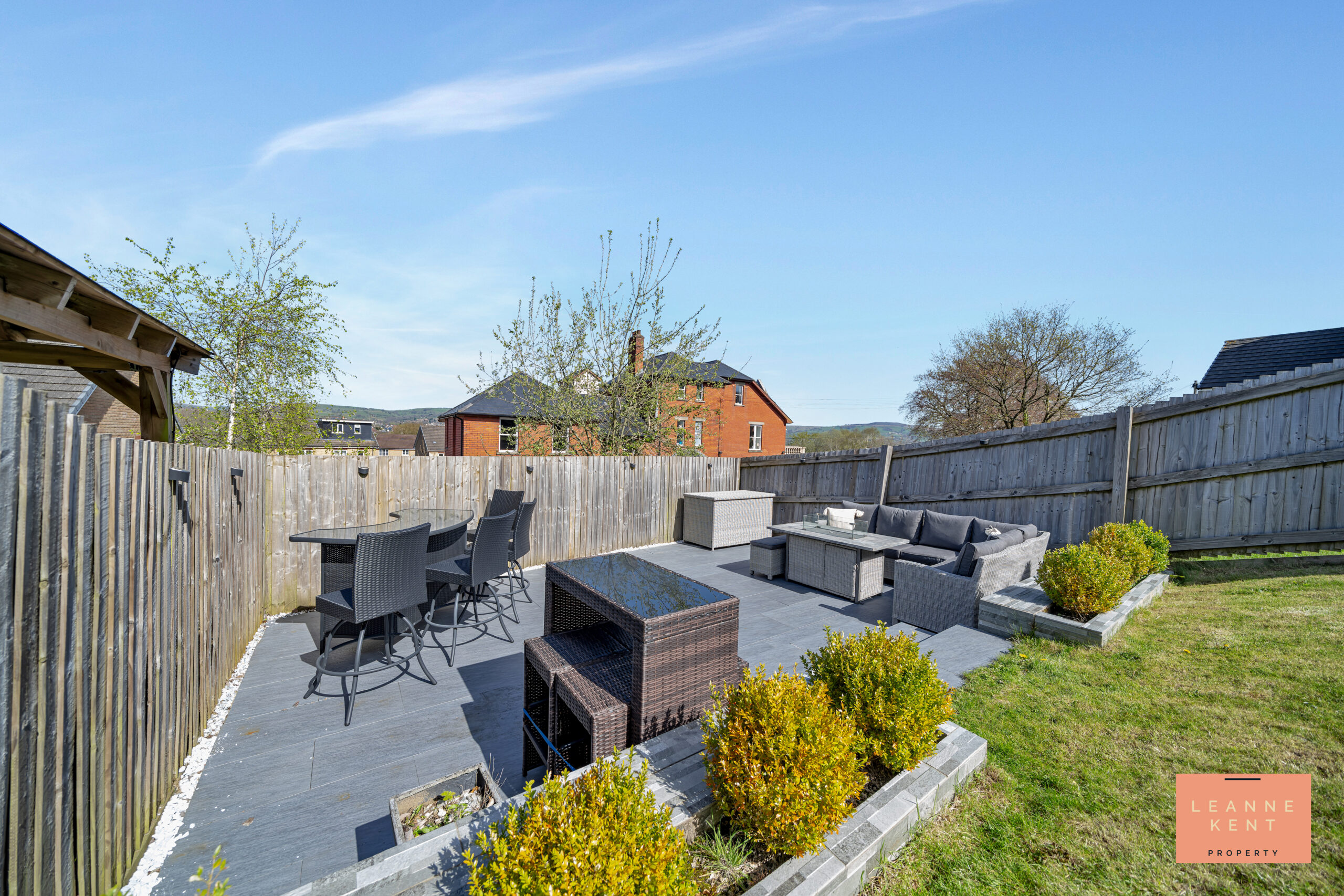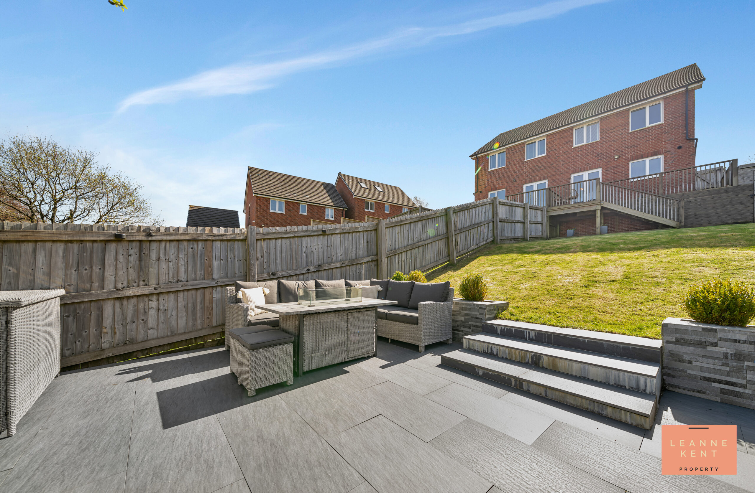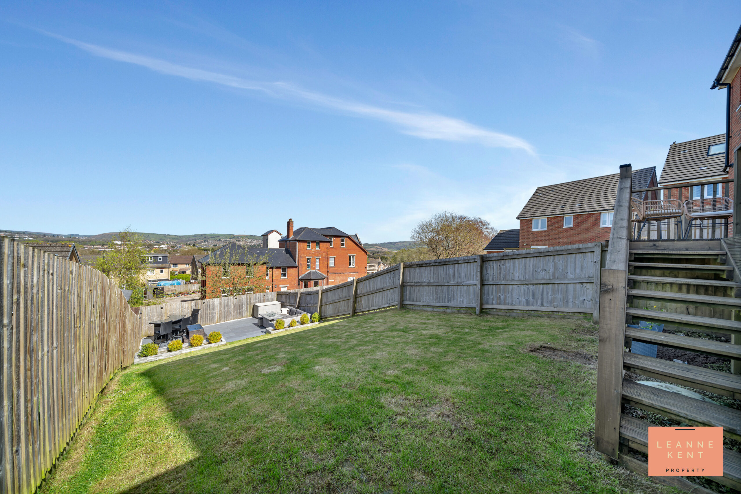 The outside space is a true highlight of this property. From the back of the house, you are greeted with an elevated decked area, ideal for relaxing and enjoying the far-reaching views. Steps lead down to the main garden, which features a large, well-maintained lawn, perfect for children to play or for garden parties. At the bottom of the garden, a beautifully presented patio area, laid with grey porcelain tiling, offers ample space for outdoor seating and entertaining. There is useful storage under the elevated decked area, including a shed, providing plenty of space for garden tools and equipment. A gate offers convenient access to the front of the property, where you will find a driveway with space for two vehicles. This impressive outdoor space combines practicality with style, making it perfect for those who enjoy spending time outdoors.