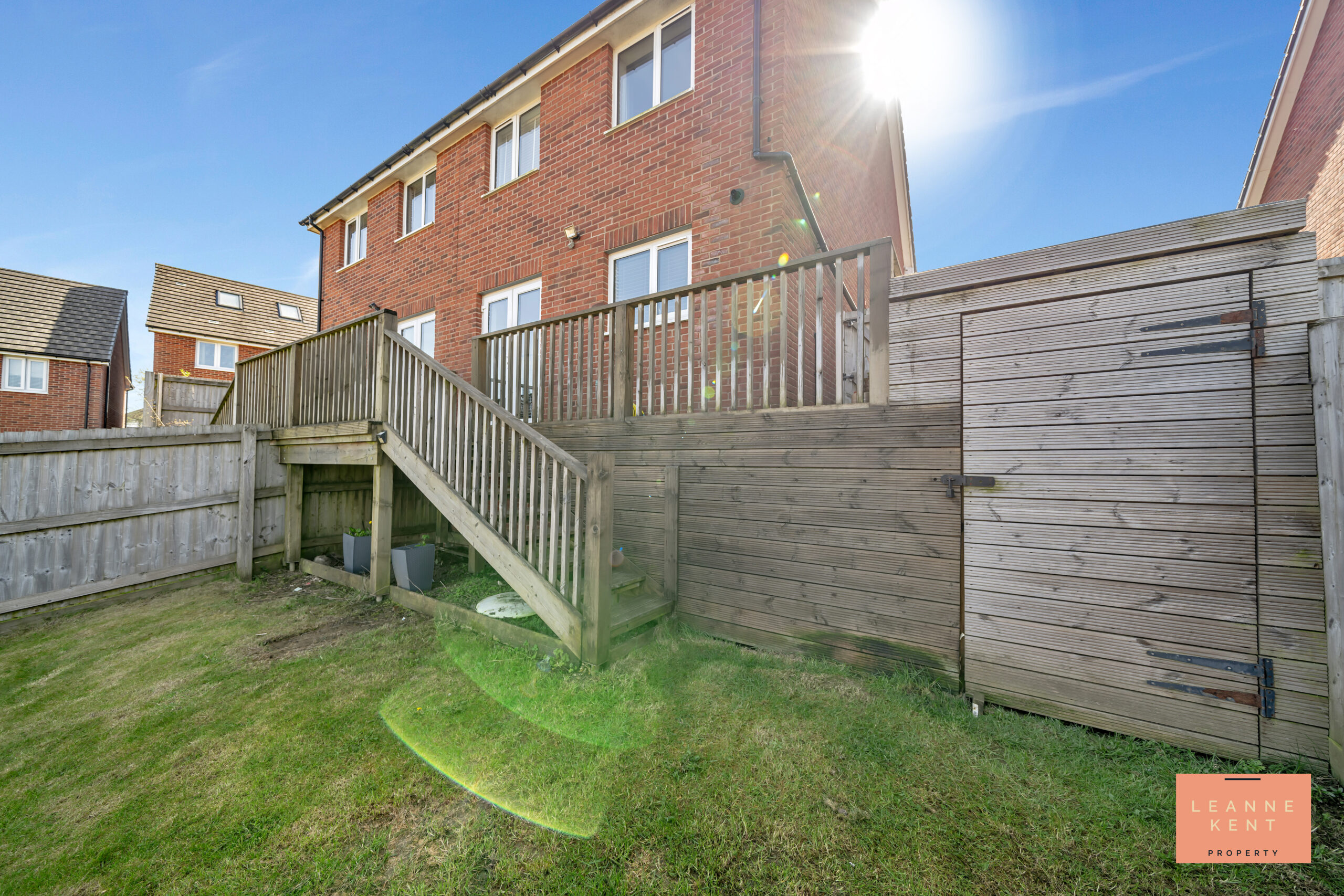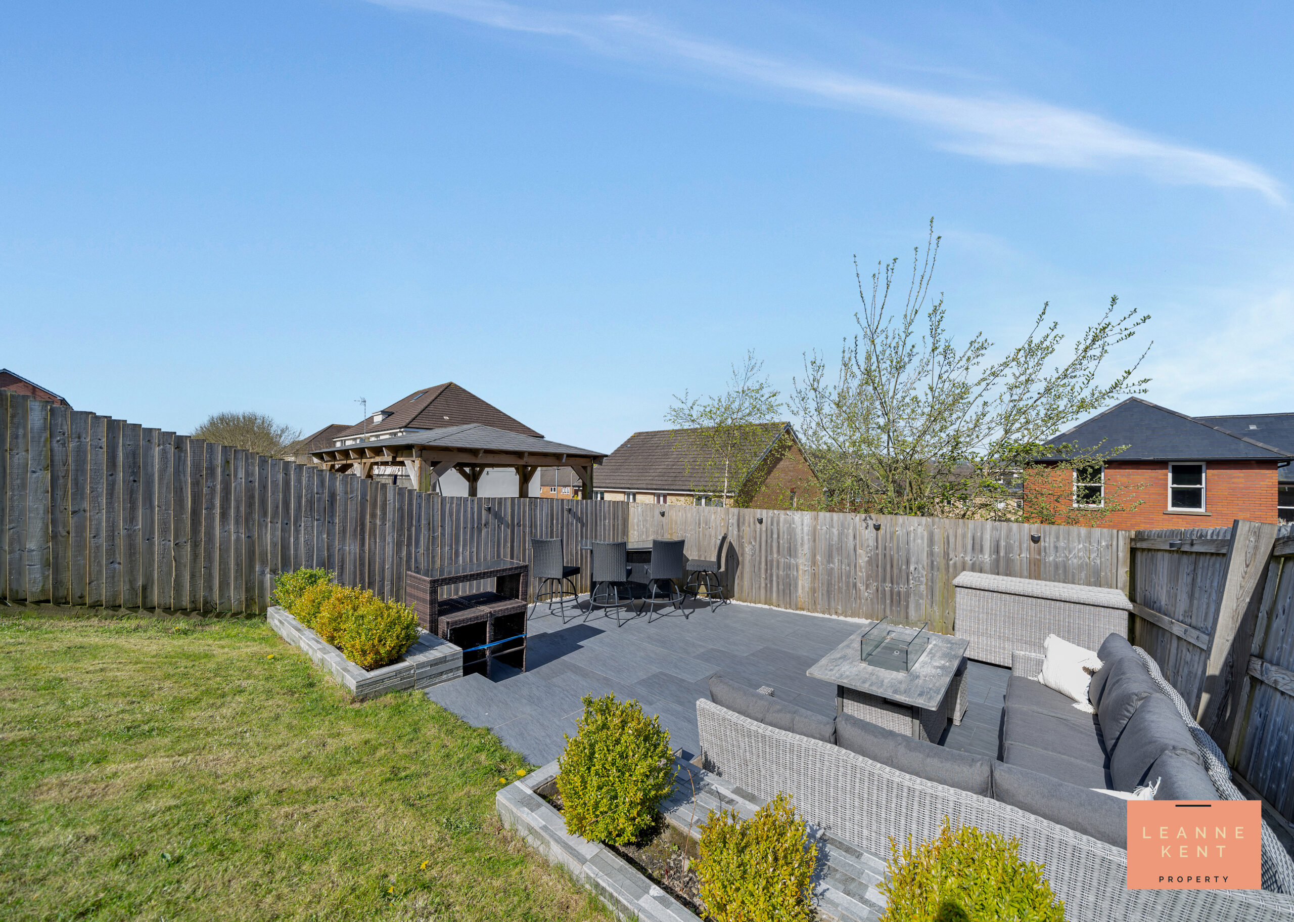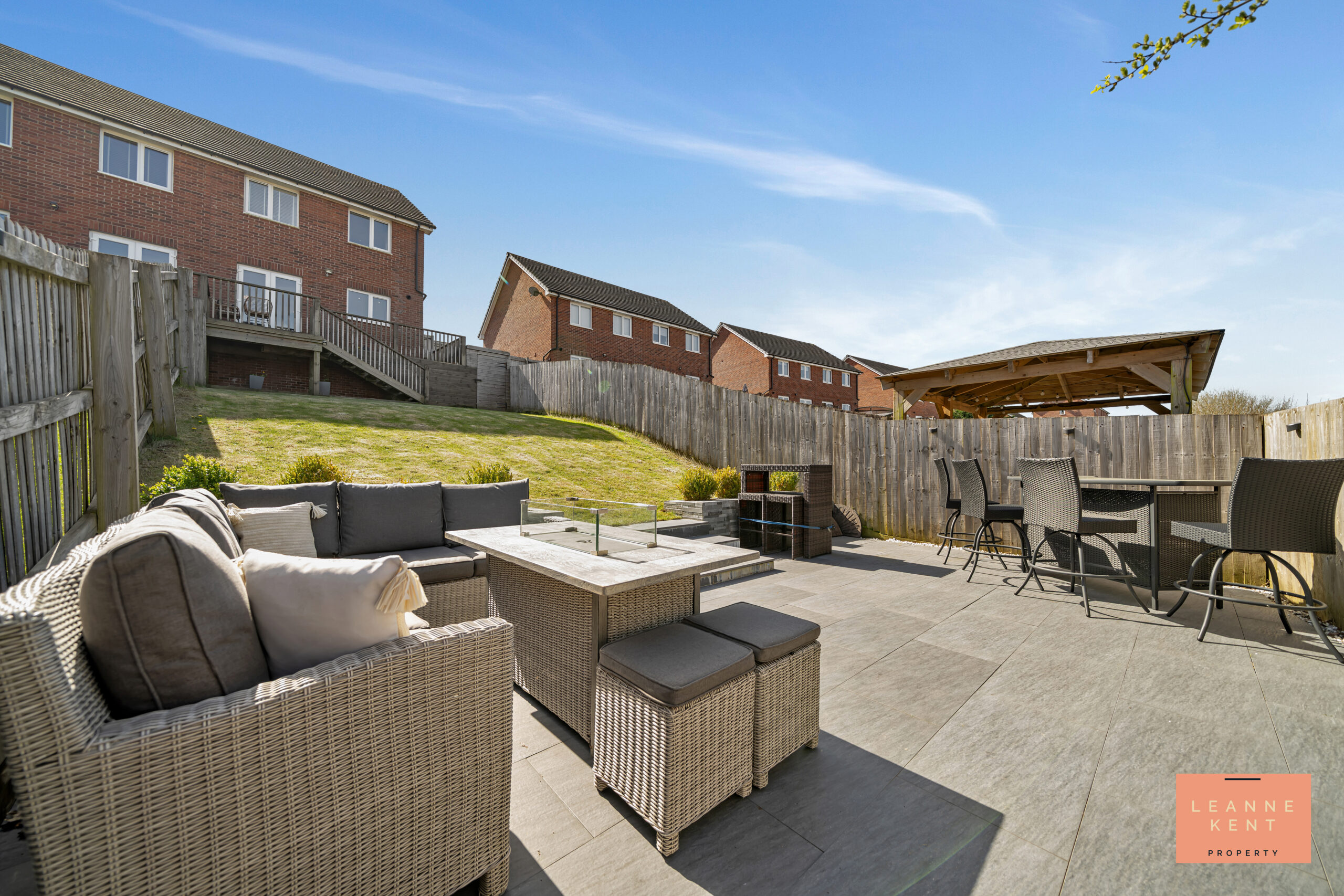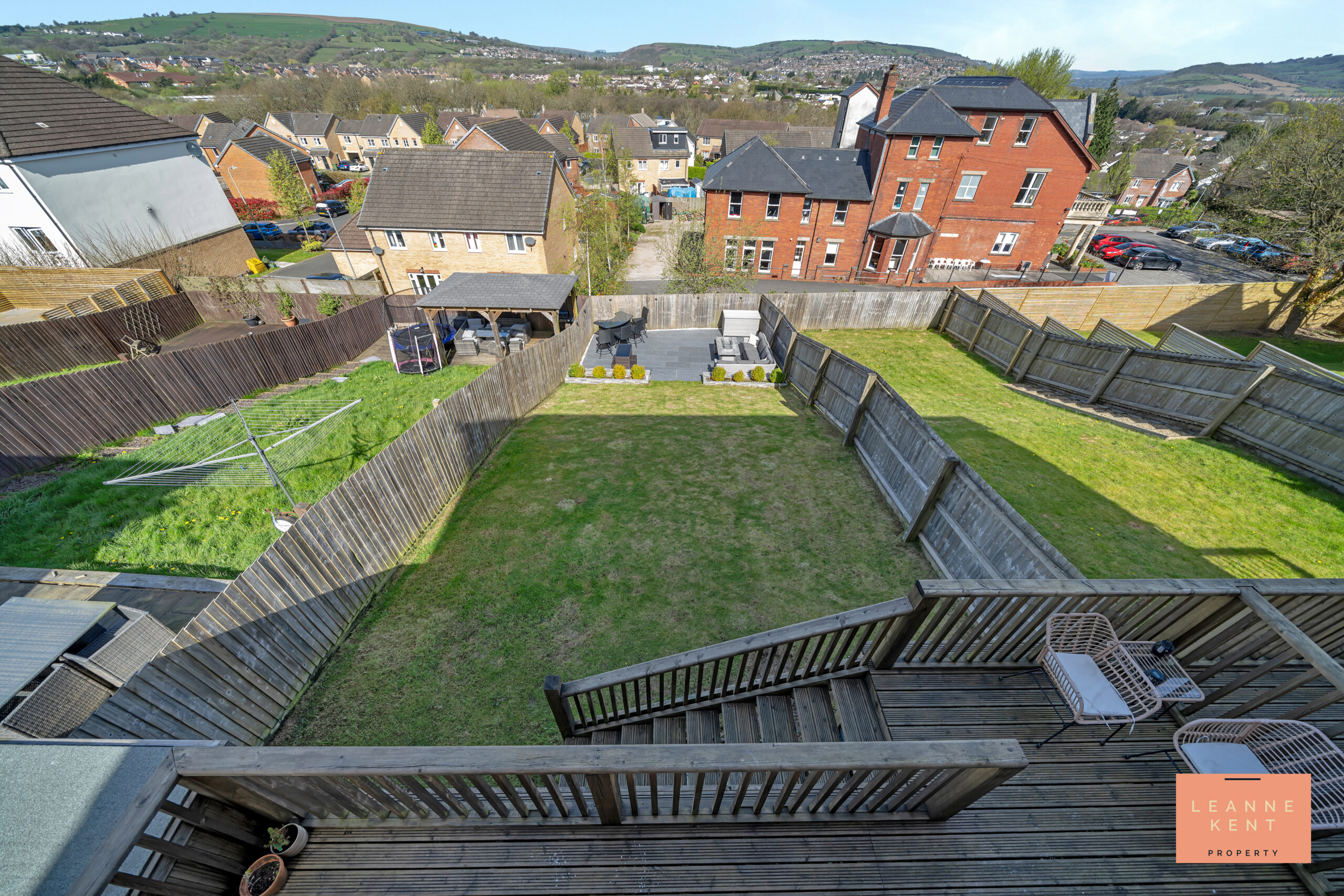The outside space is a true highlight of this property. From the back of the house, you are greeted with an elevated decked area, ideal for relaxing and enjoying the far-reaching views. Steps lead down to the main garden, which features a large, well-maintained lawn, perfect for children to play or for garden parties. At the bottom of the garden, a beautifully presented patio area, laid with grey porcelain tiling, offers ample space for outdoor seating and entertaining. There is useful storage under the elevated decked area, including a shed, providing plenty of space for garden tools and equipment. A gate offers convenient access to the front of the property, where you will find a driveway with space for two vehicles. This impressive outdoor space combines practicality with style, making it perfect for those who enjoy spending time outdoors.