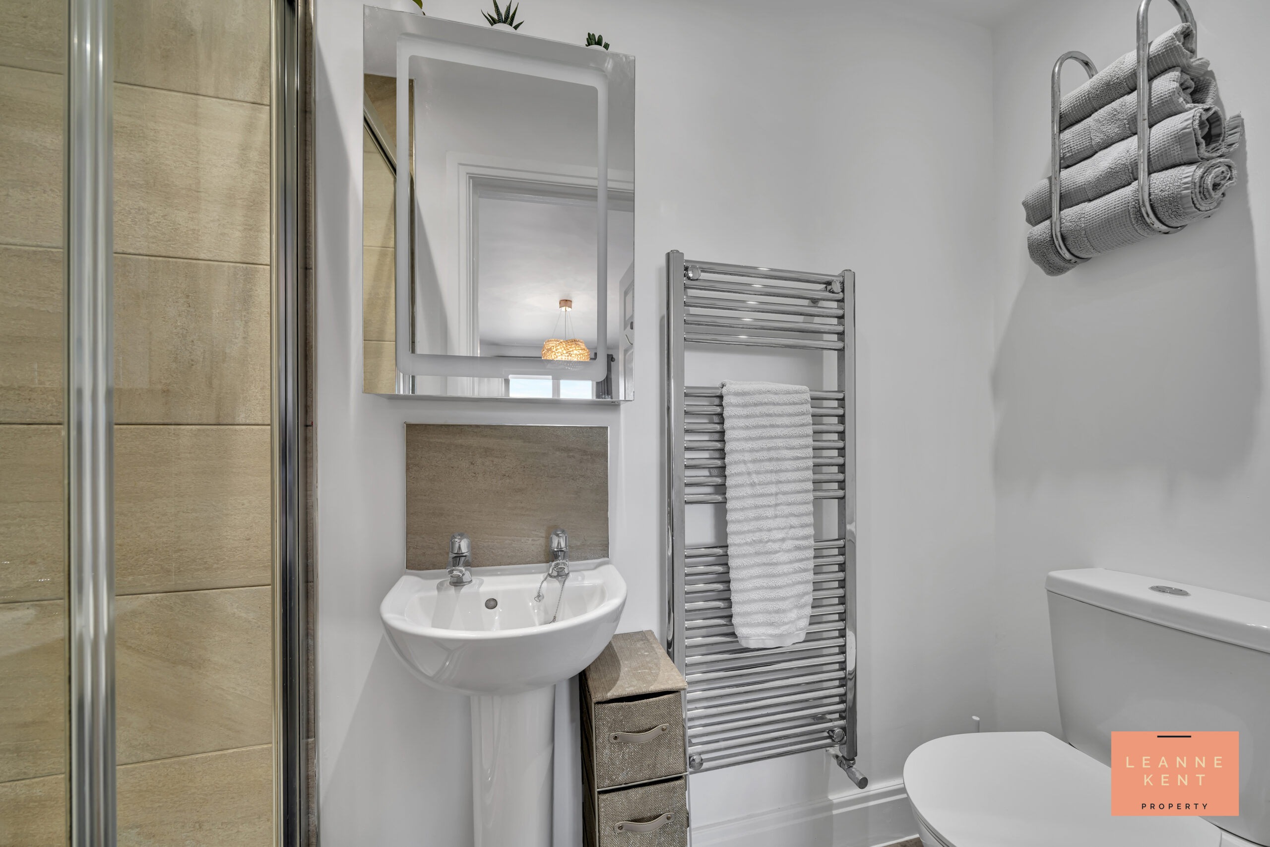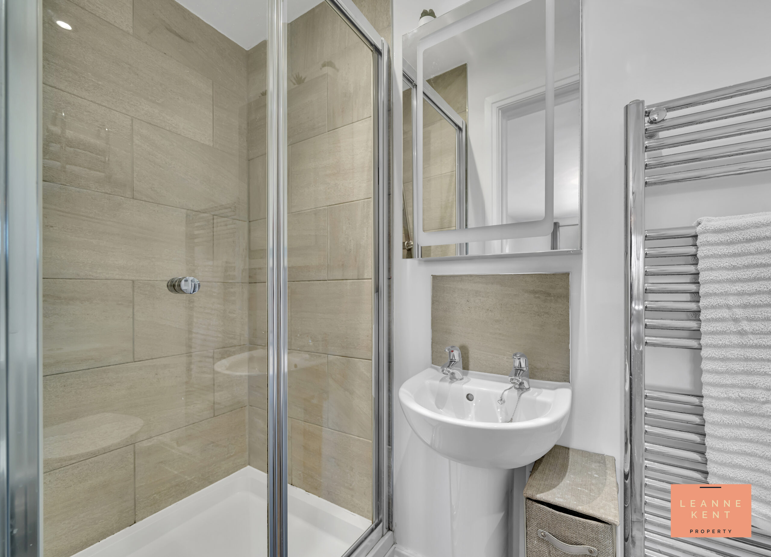 The en suite is beautifully presented and includes a walk-in shower complete with stylish wall tiling. There is also a modern toilet, a hand basin and a chrome heated towel rail.