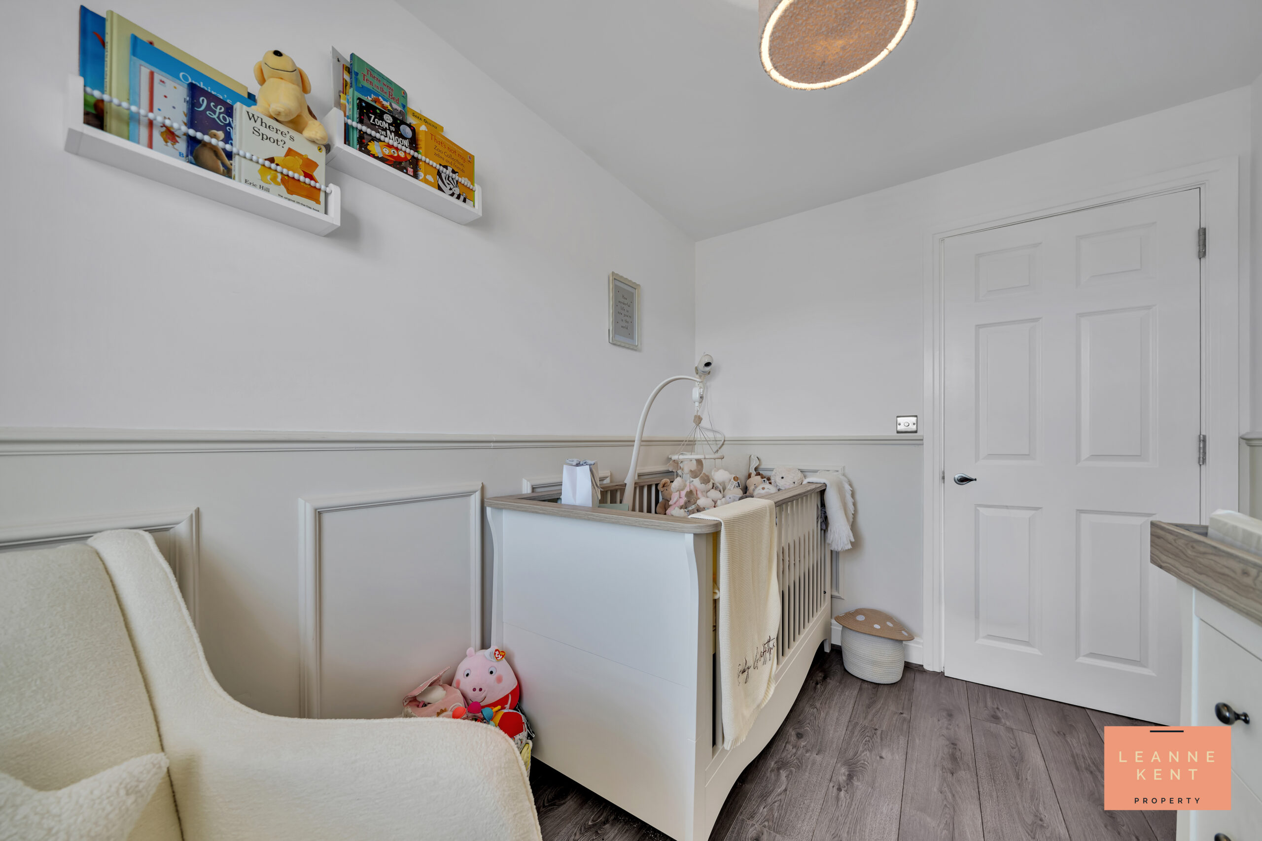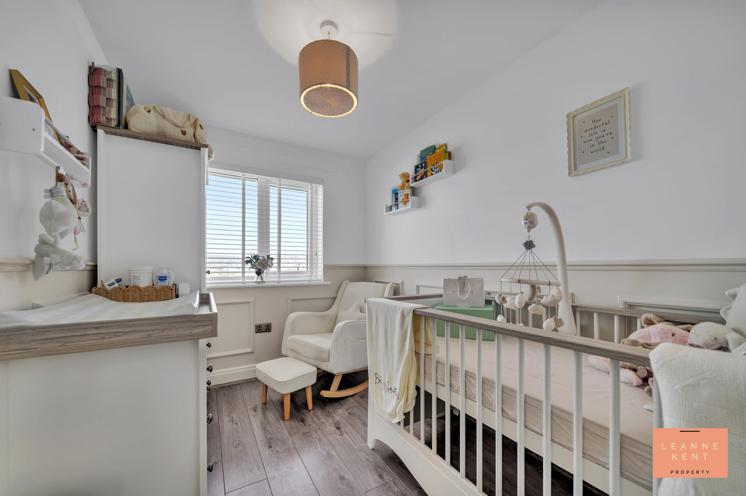 Bedroom three is located at the rear of the property and is tastefully finished with wood-effect flooring and white decor. The walls also feature stylish wall panelling finished in a light colour, adding depth and style to the room. A window allows natural light to flood the room whilst also offering exceptional views. The room further benefits from a radiator and multiple power sockets.