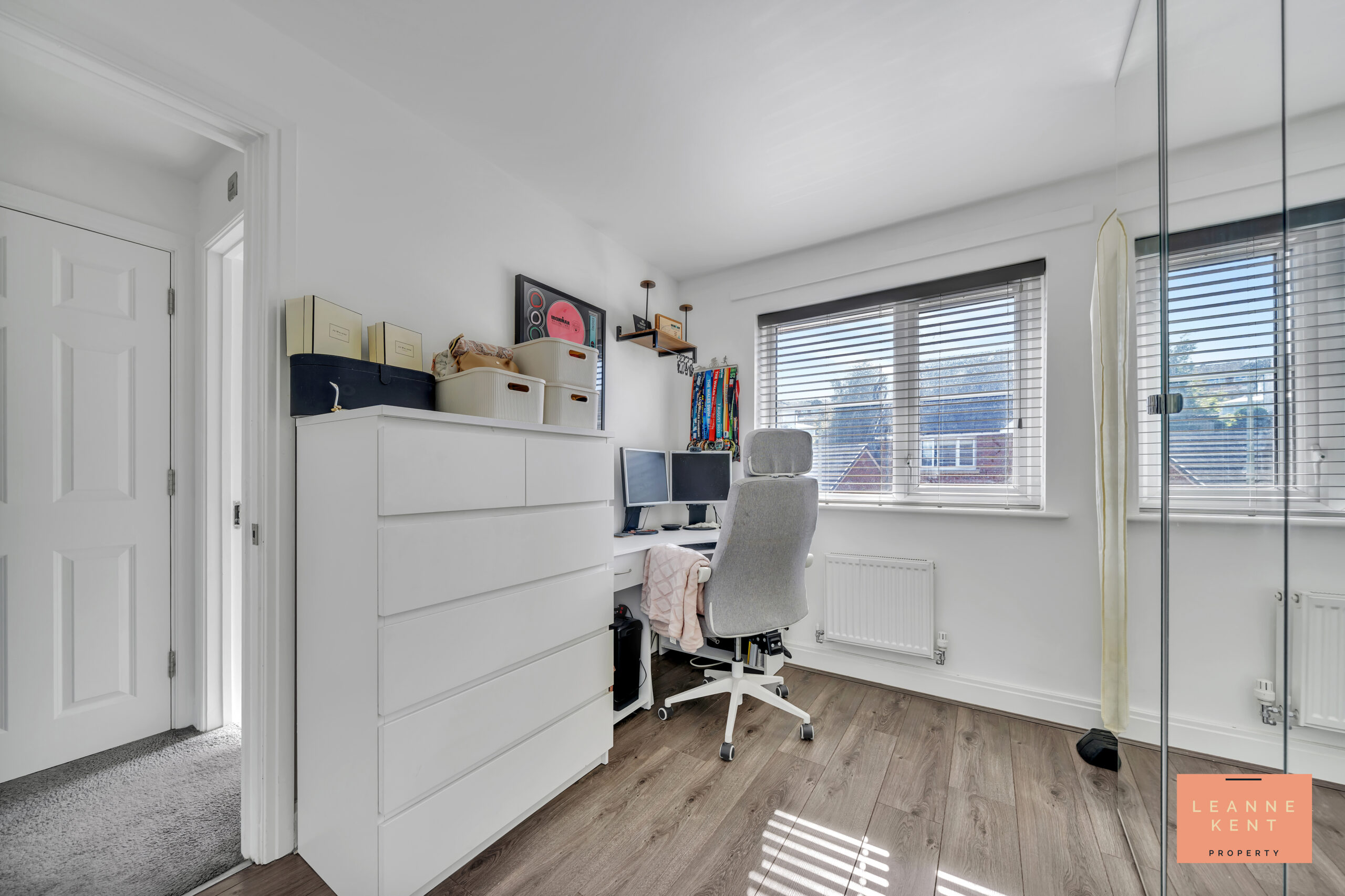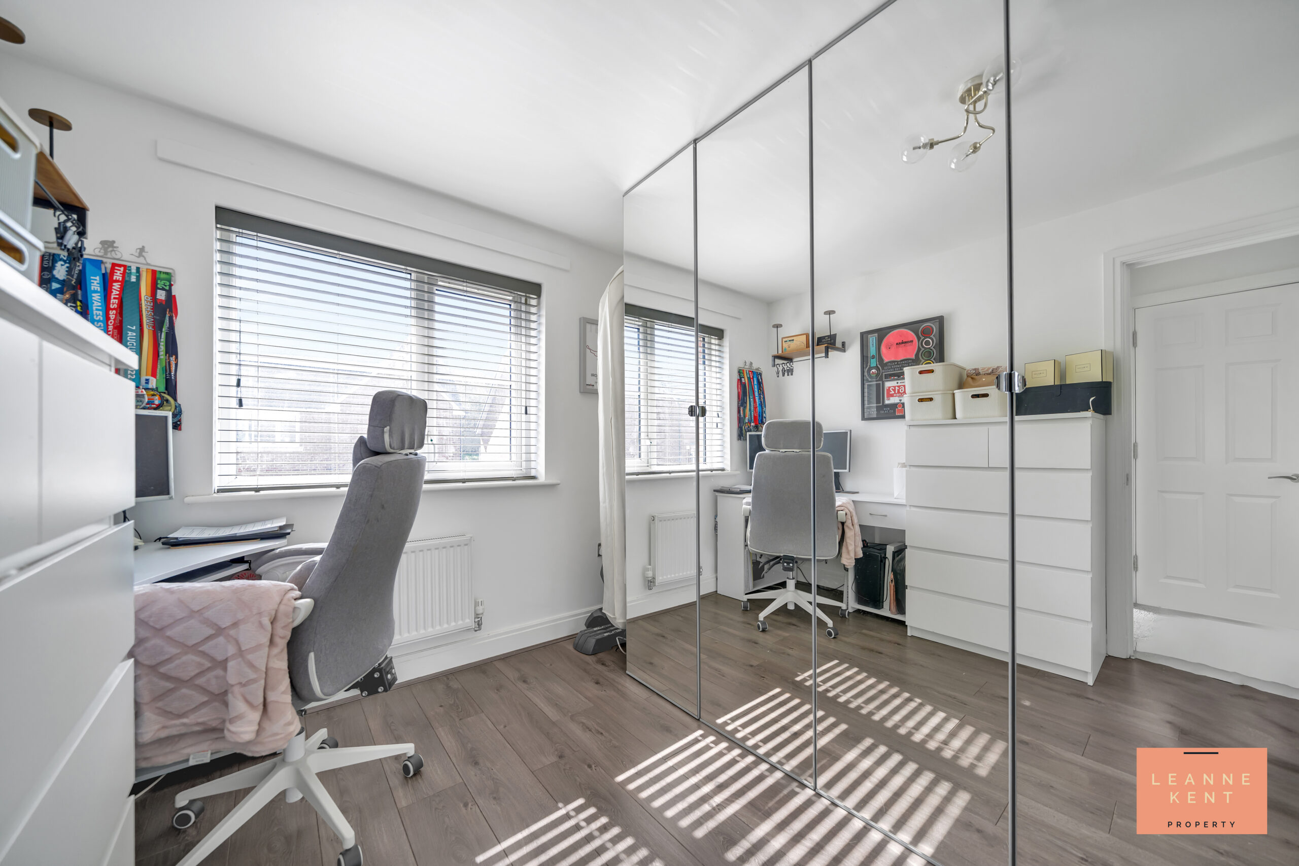 Bedroom two is located at the front of the property and is another good-sized room. The room is tastefully finished with modern wood-effect flooring and white decor. On one side of the room are wardrobes with mirrored doors. To the front is a window which allows natural light to filter in during the day. The room further benefits from a radiator and multiple power sockets.