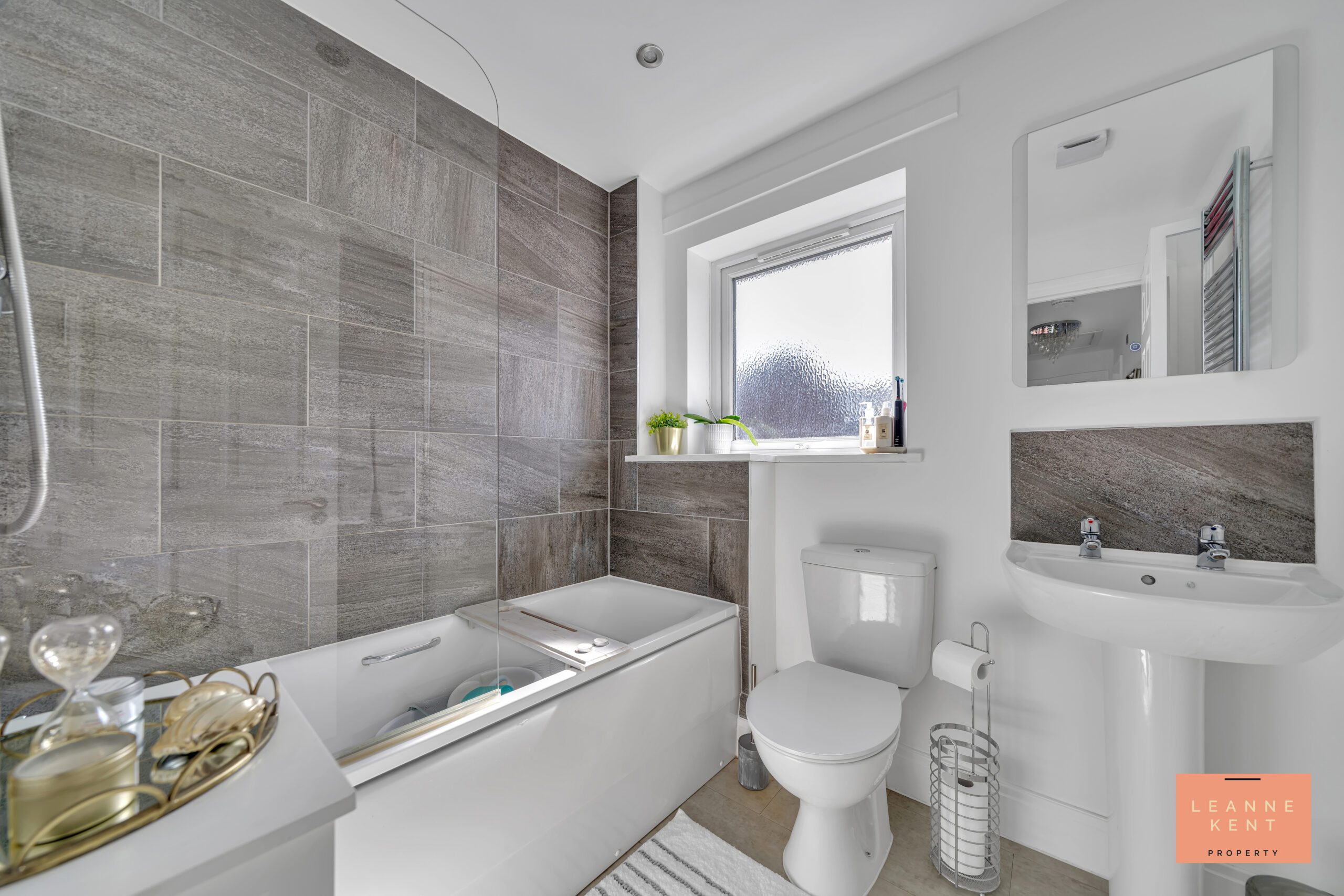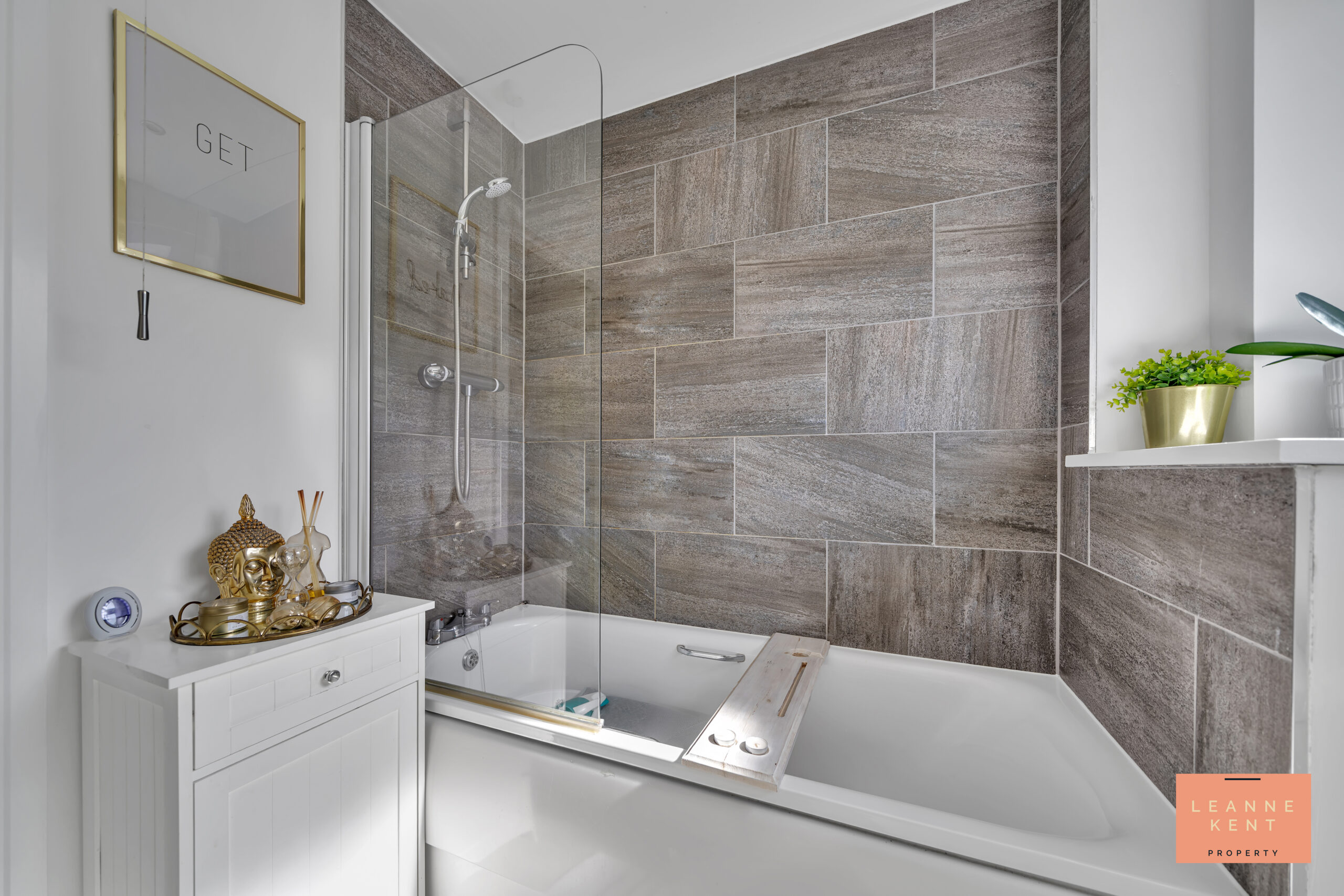 The family bathroom is beautifully presented, with light-coloured floor tiles and white decor. A bath on the left benefits from an overhead shower, a glass shower screen, and stylish wall tiling. Next to this is a modern toilet and a hand basin, which includes the same tiling as the bath for a splashback.