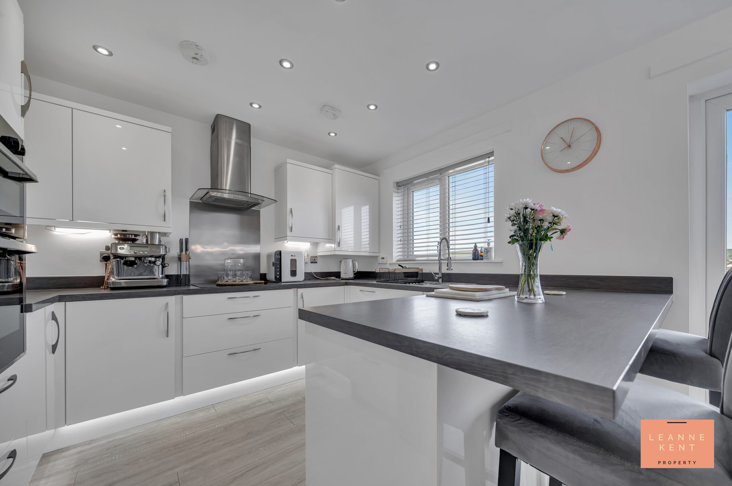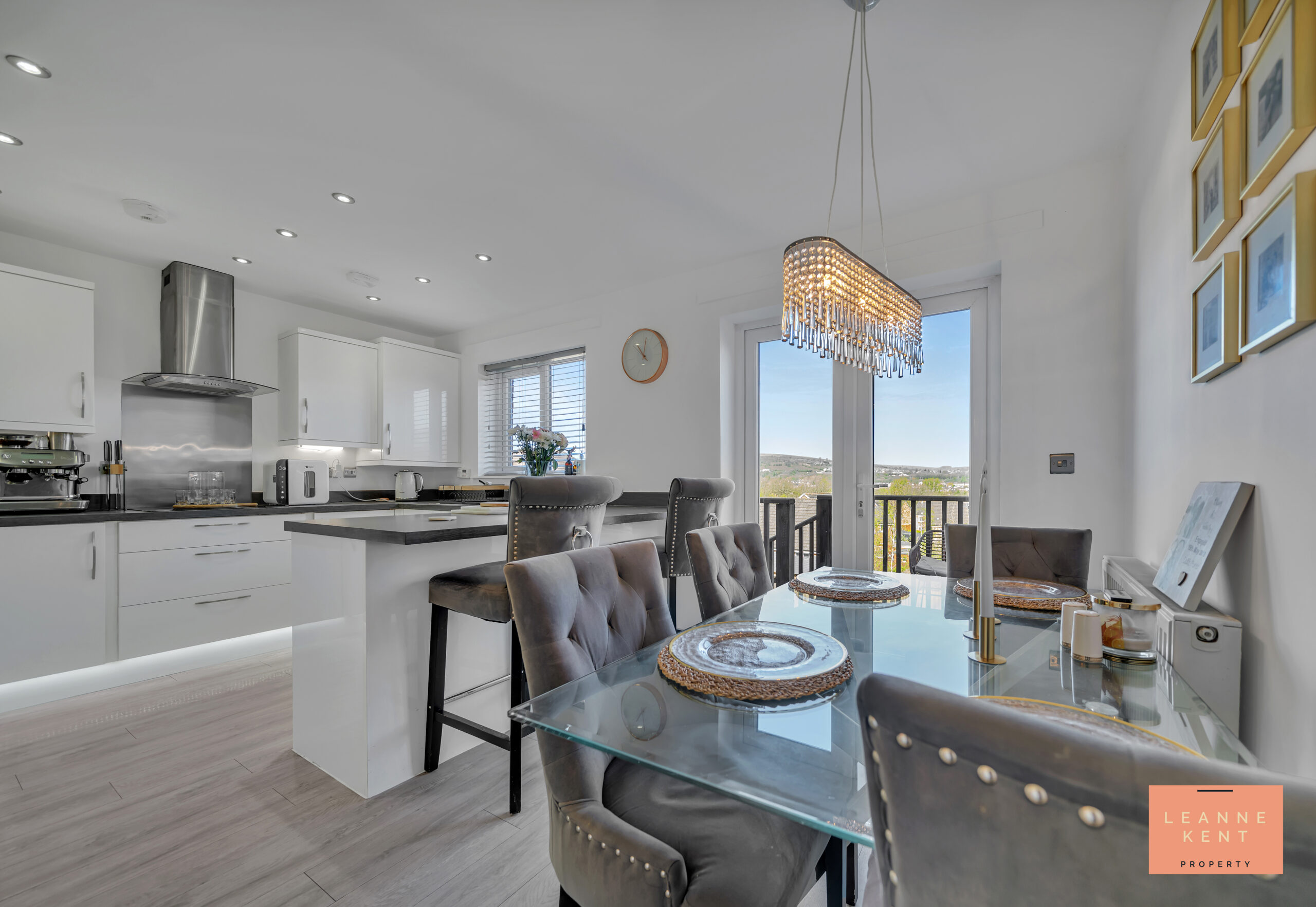 The spacious kitchen-diner is beautifully presented and offers a modern and stylish family space. The room is tastefully finished with stylish grey wood-effect flooring and white walls. On one side is the kitchen area, whilst on the other side is an area for a large dining table. The kitchen itself is finished with gloss white cabinets, which are complemented by a grey wood-effect worktop. The hob sits below a large extractor hood, which includes a stainless steel splashback. A double oven integrates perfectly into the cabinetry. The sink sits below a large window, which offers amazing views of the garden and the surrounding countryside. Below the sink is an integrated dishwasher, and there is also space for a washing machine and a large fridge freezer. There is also a breakfast bar, which is ideal for morning coffee or quick meals. By the dining area, French doors open up to magnificent views. In one corner is a large cupboard and there is also access to the downstairs WC.