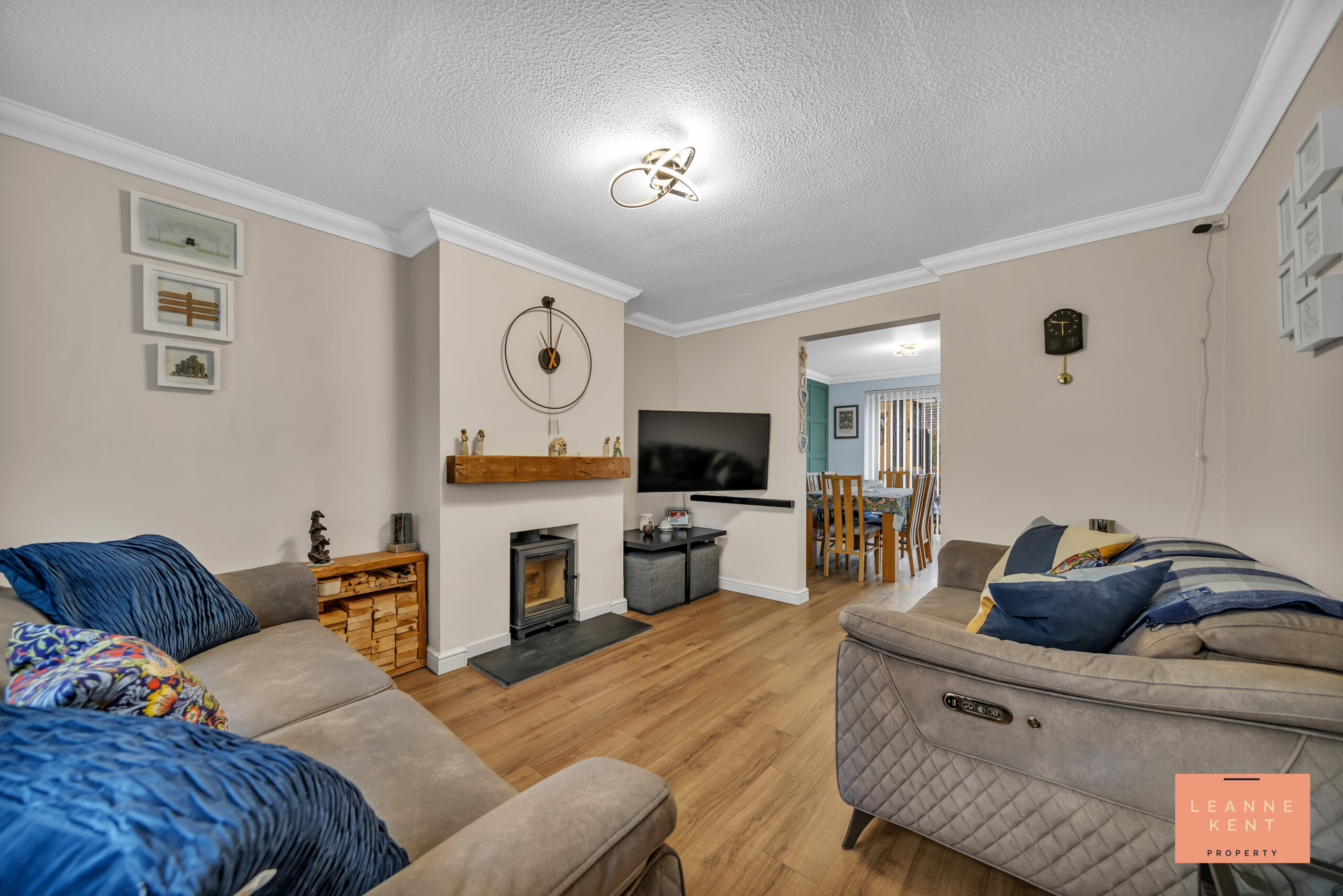 The lounge is tastefully finished with wood-effect flooring and neutral decor. To the front is a large window which bathes the room in natural light during the day. A feature chimney breast includes a wood-burner and a slate hearth. An opening leads into the beautiful kitchen diner. The room further benefits from a radiator and multiple power sockets.