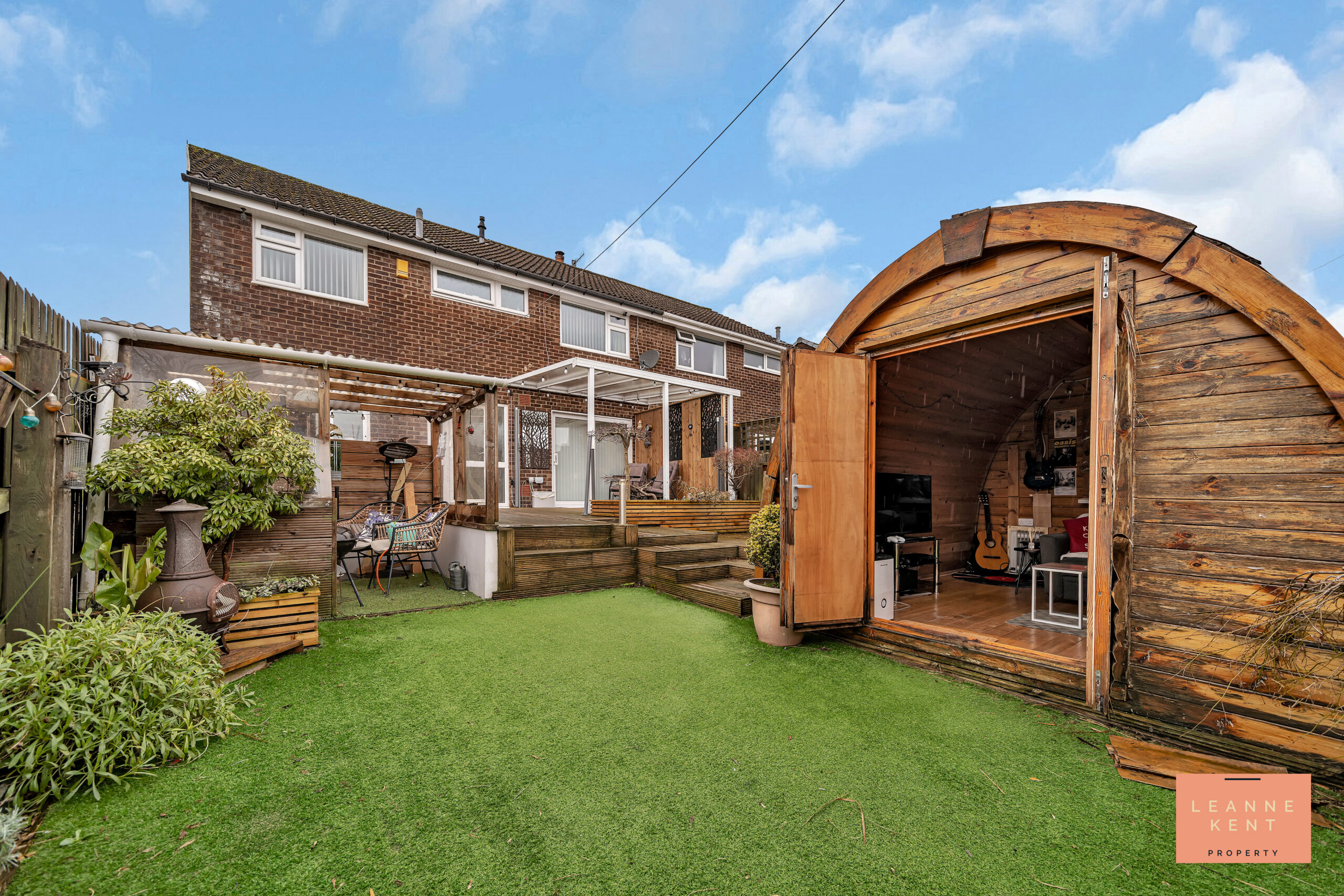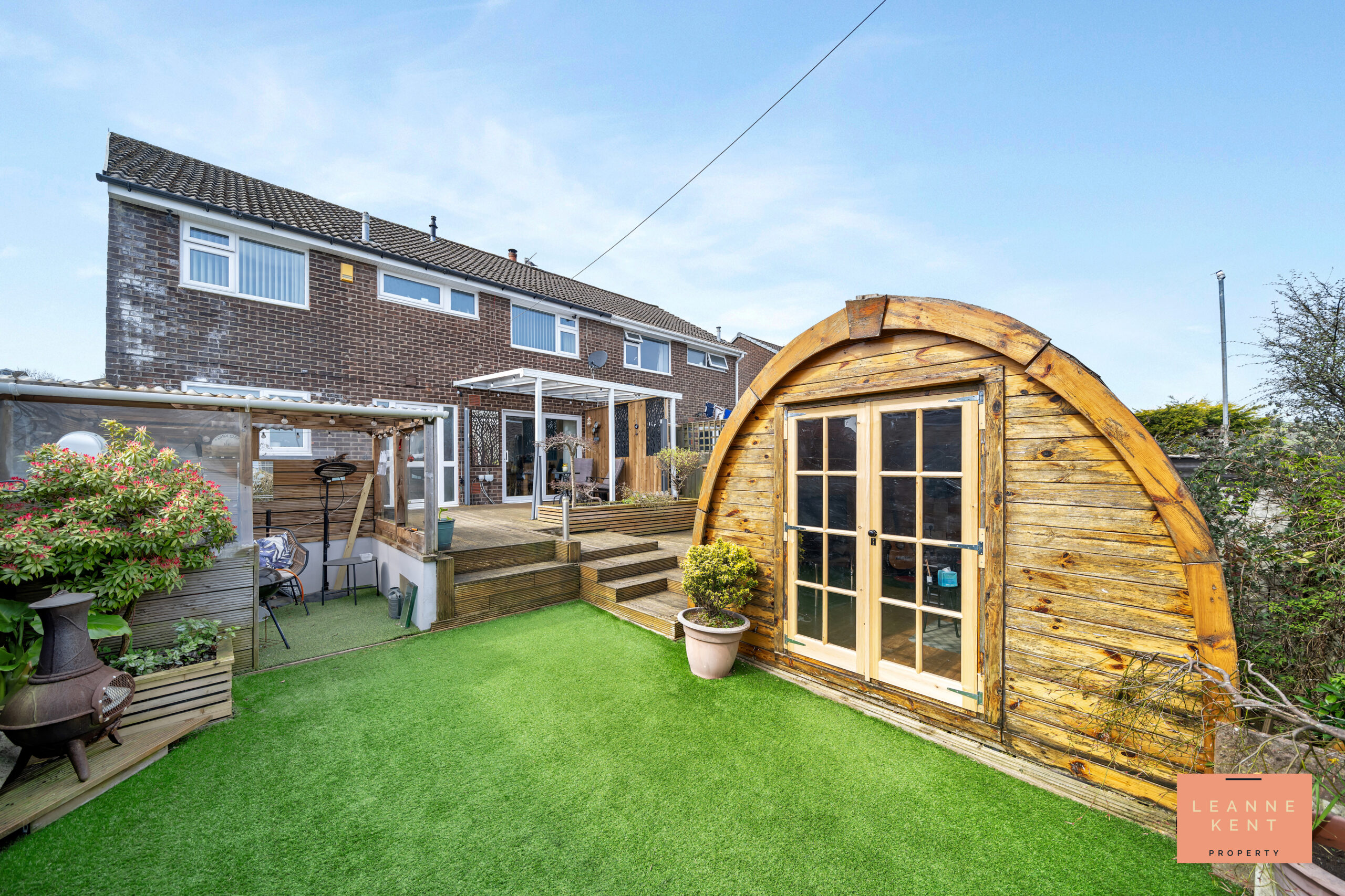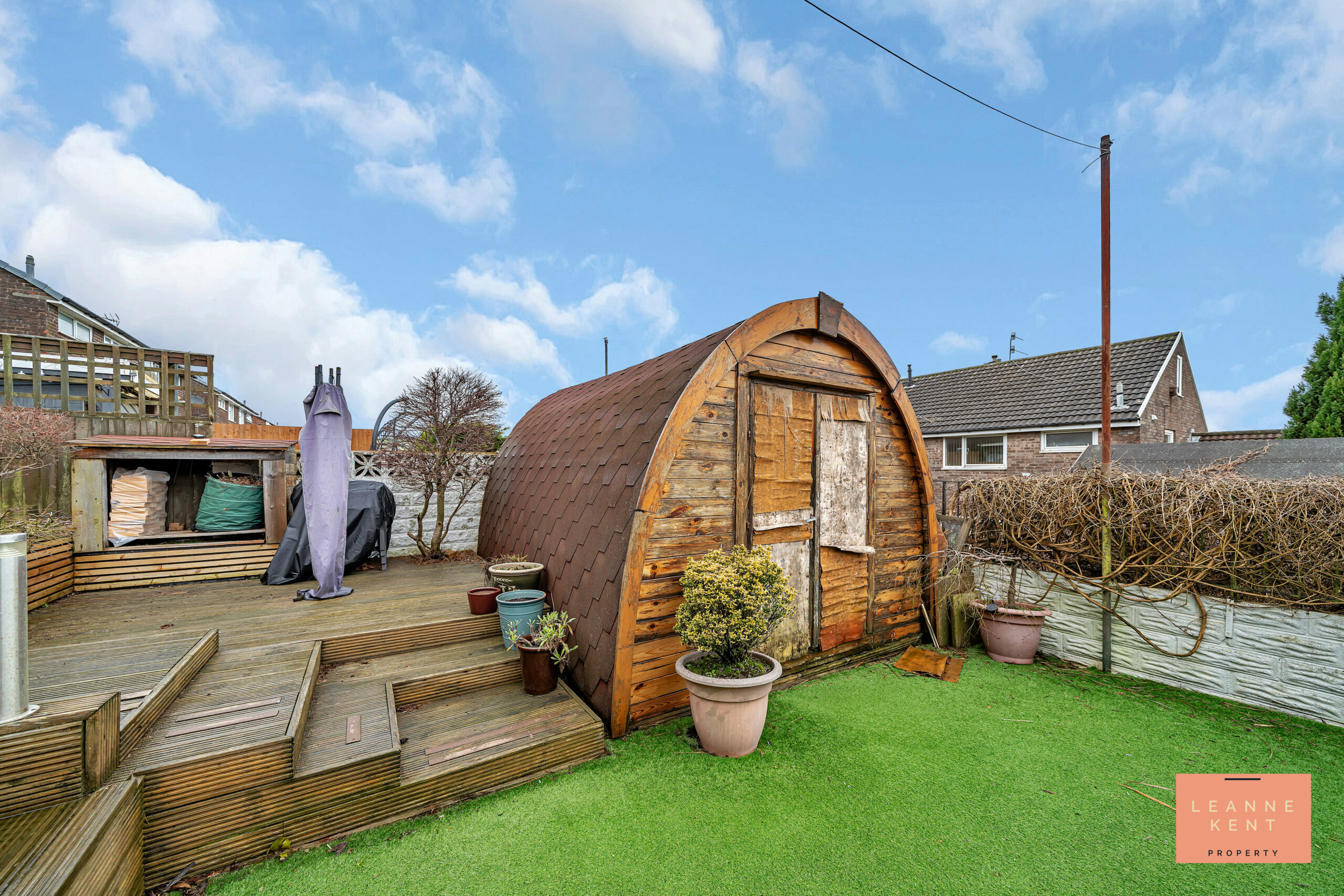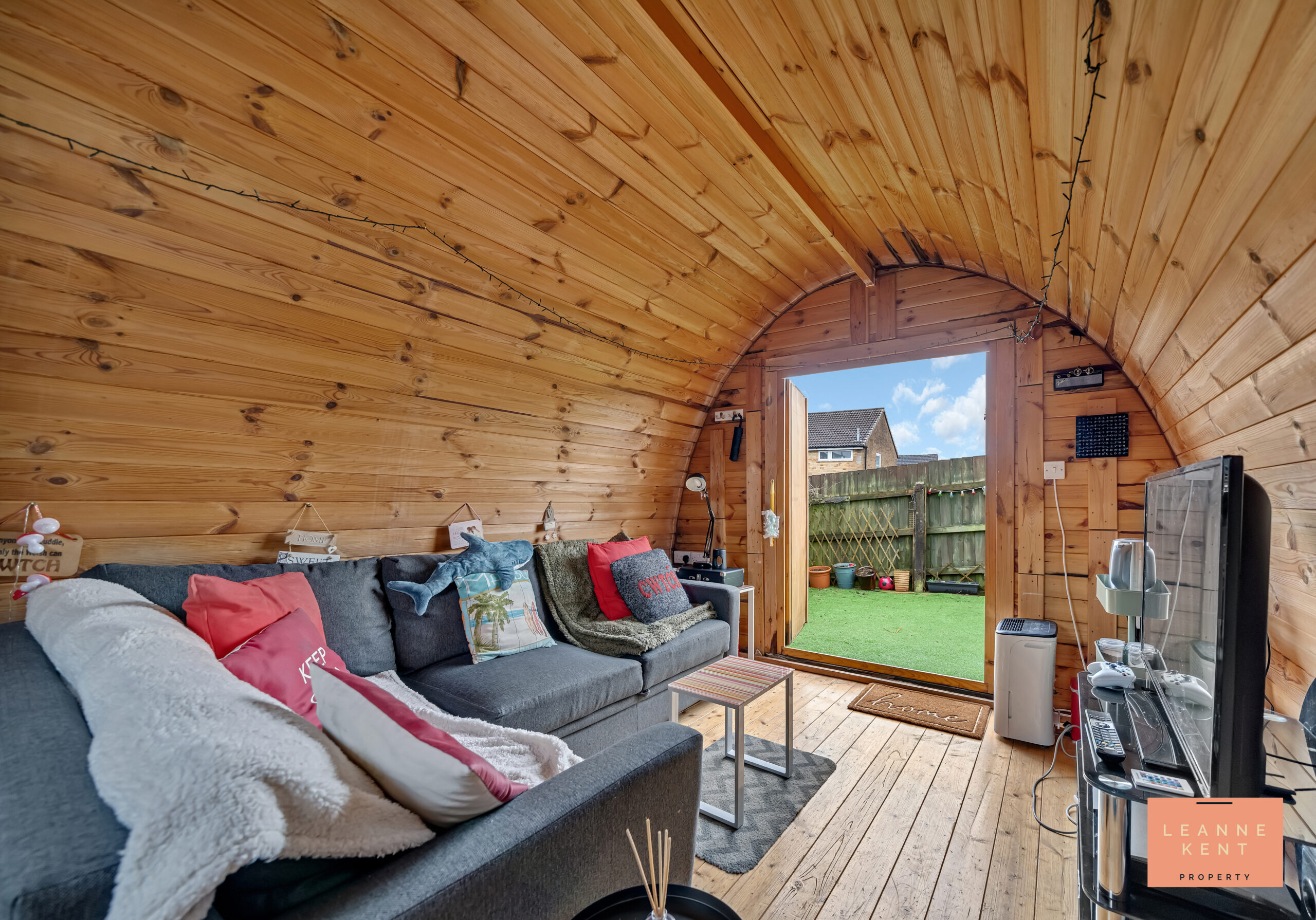 The garden is a true delight and offers multiple areas from where to enjoy this outdoor space. As you step from the back of the house you are greeted with a large patio area finished with wood decking, with part of it benefiting from an overhead covering. The decked area is relatively large, which provides multiple places to sit and relax. From here, there is an area laid with artificial grass, which is ideal for children or pets. Next to this is an amazing pod which offers a cosy space to enjoy all year round. There is also a covered BBQ area meaning you can enjoy a BBQ all year round. This is a great garden for spending time with family or entertaning guests. There is also a side gate for convenience.
