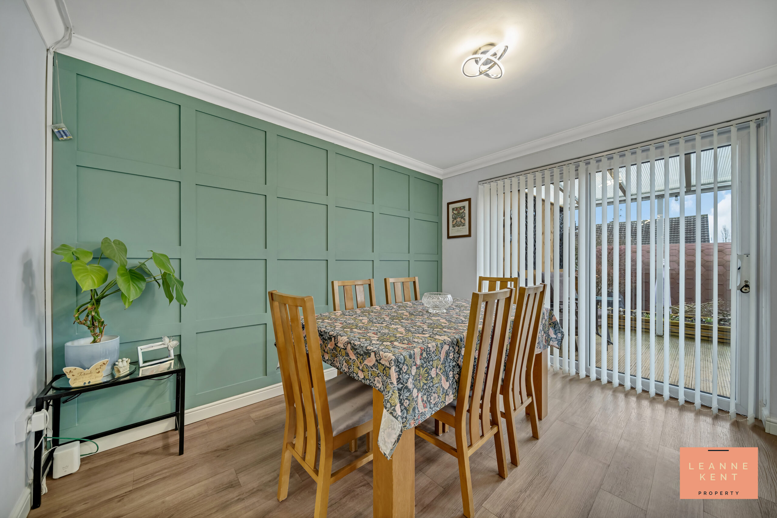 The dining area is open-plan with the kitchen, making it a great space to relax with family or entertain guests. Beautiful wood flooring runs through from the lounge, and the walls are finished in a soft blue-grey colour. On one wall is stunning character panelling finished in a soft green. Sliding doors lead out to the garden. The room further benefits from a radiator and multiple power sockets.