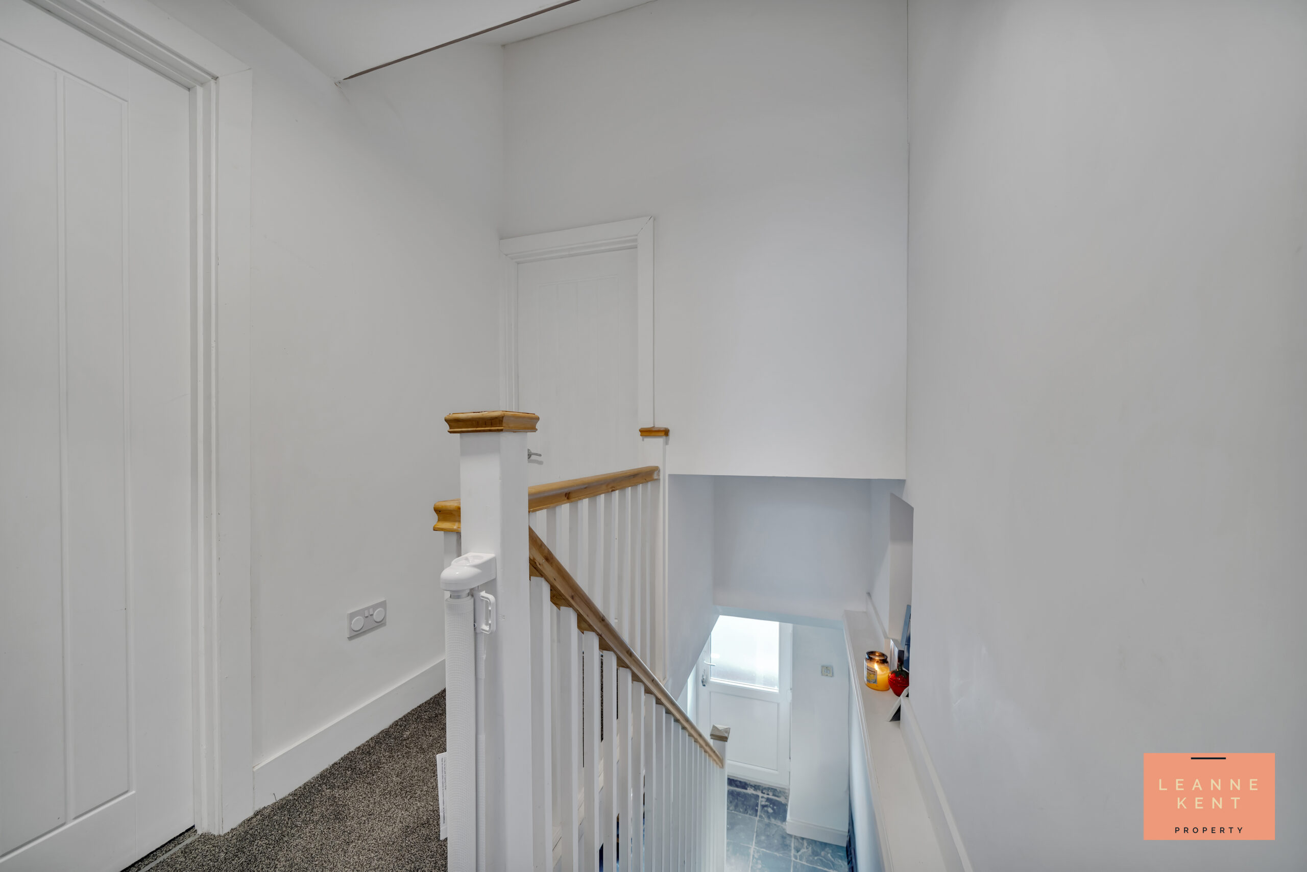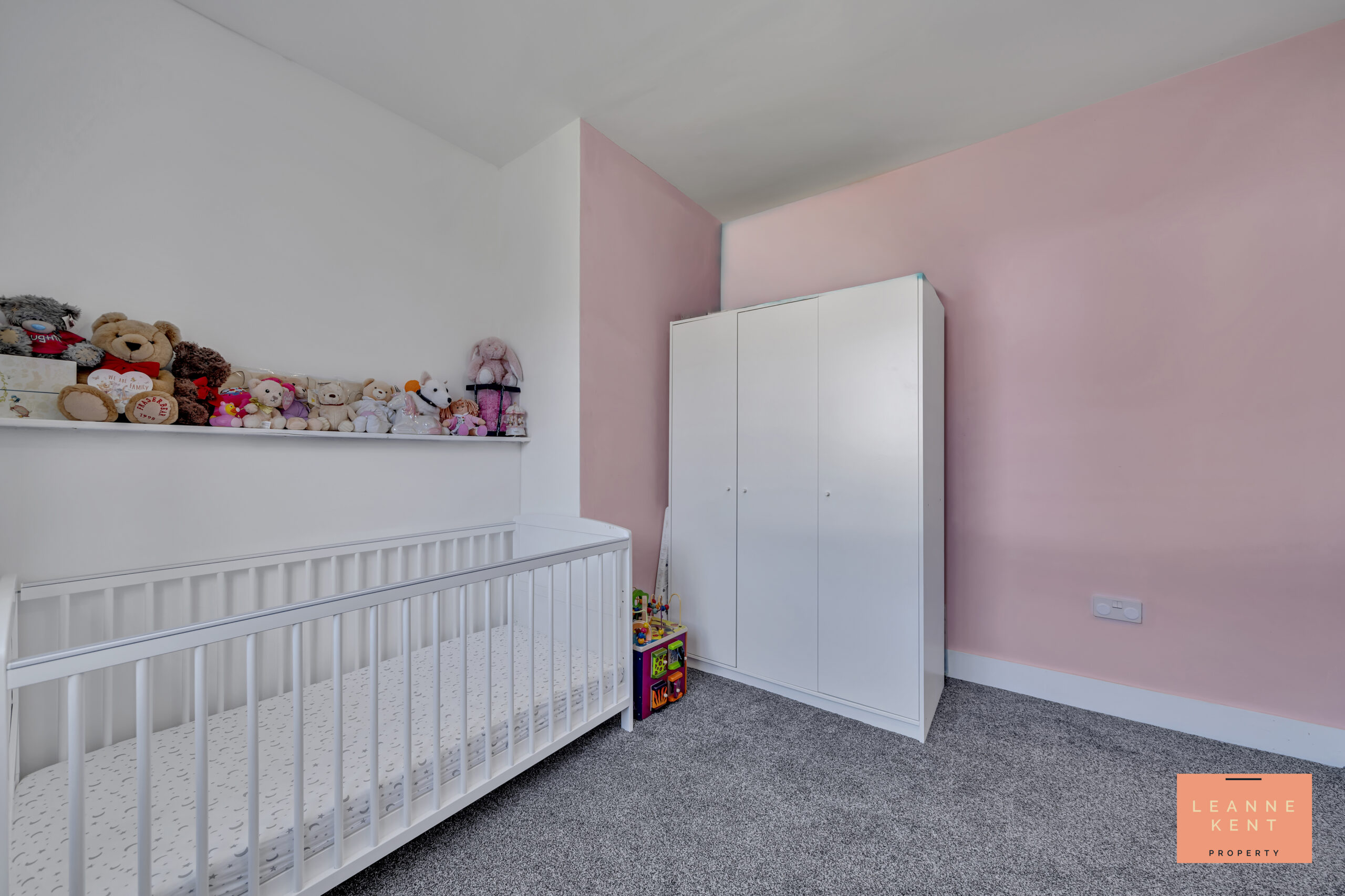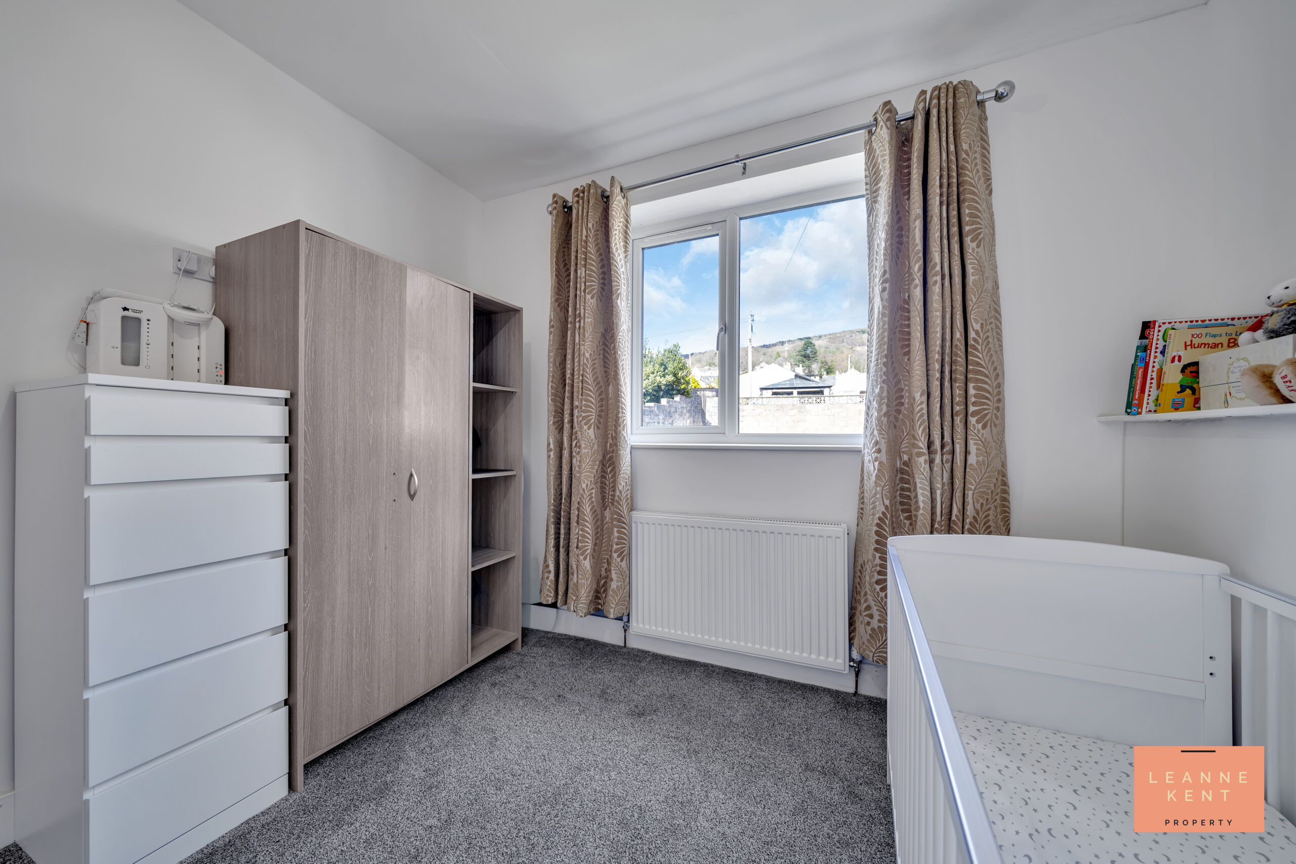 Bedroom two is located at the rear of the property and is a good-sized room. The room is tastefully finished with a modern grey carpet and a combination of soft pink and light cream walls. A window overlooks the garden and also provides views over the surrounding hills. The room further benefits from a radiator and multiple power sockets.