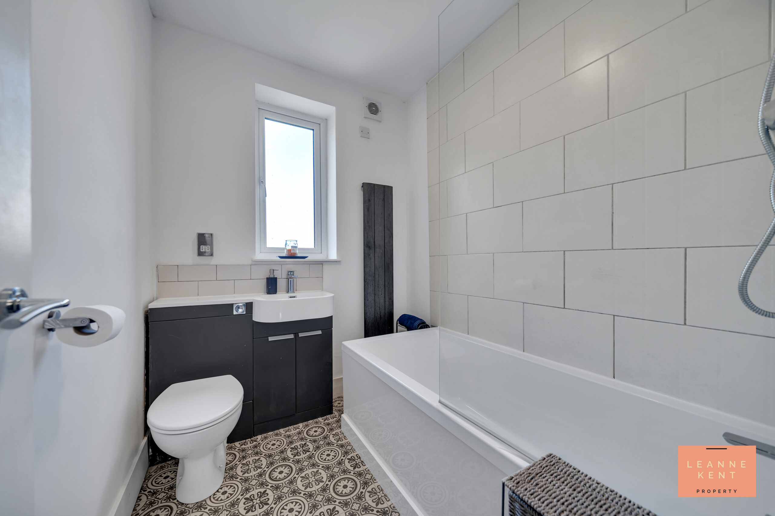 The bathroom is modern and stylish, and finished with mosaic-style flooring and two-tone soft grey walls. A stylish bath sits to one side and is complemented with an overhead shower and a glass shower screen. A toilet and hand basin are integrated into a sleek grey unit. A stylish vertical radiator sits beside the unit.