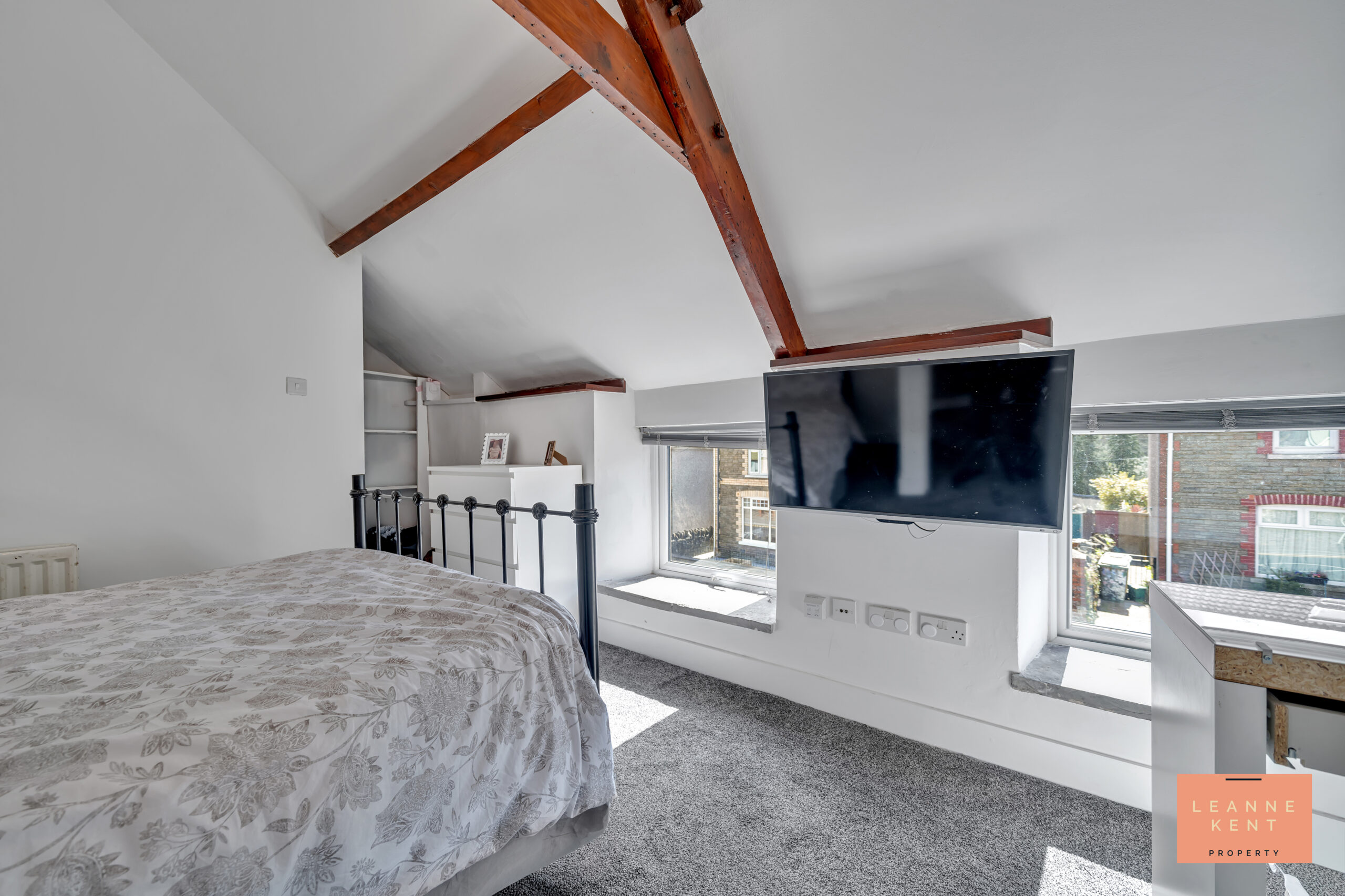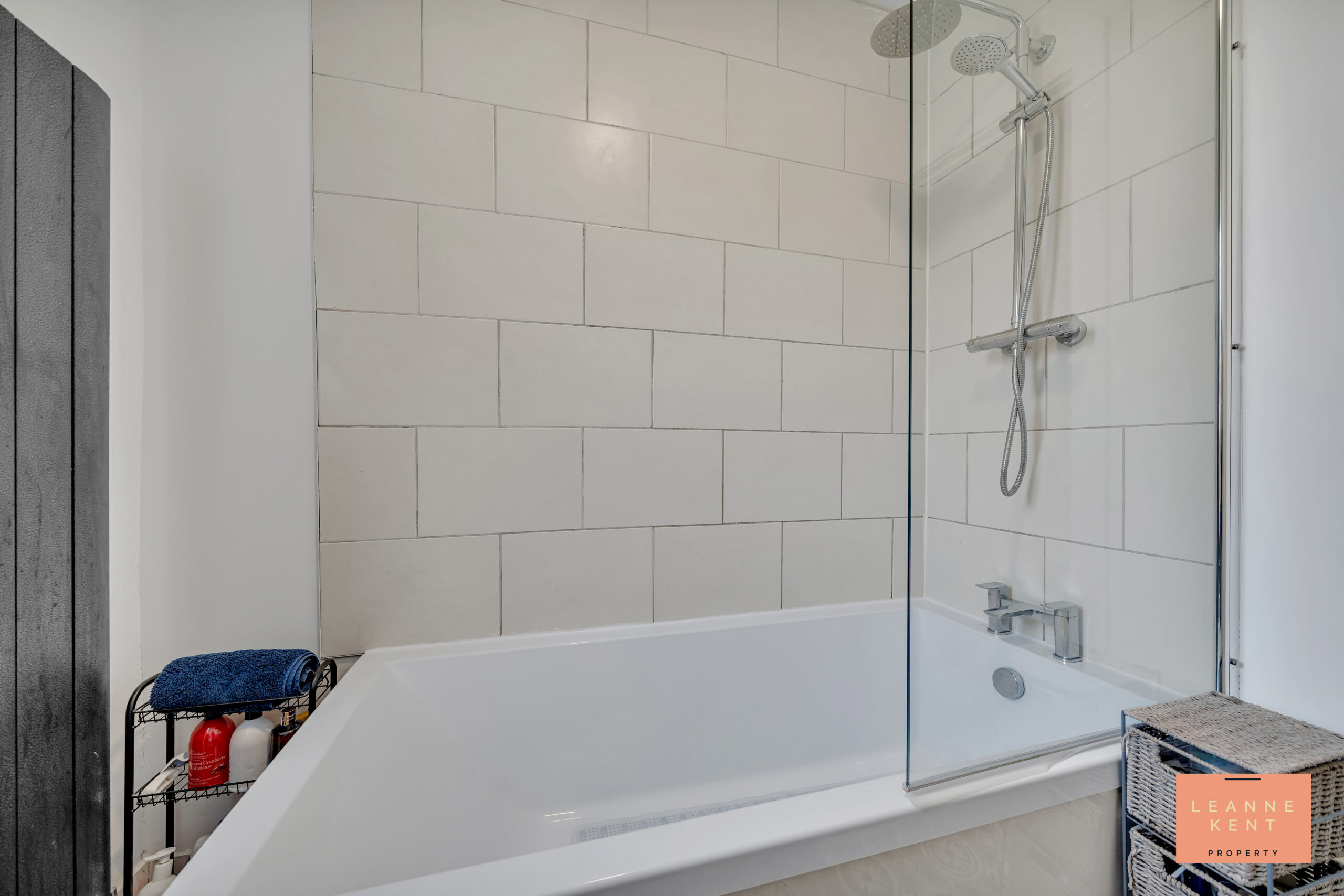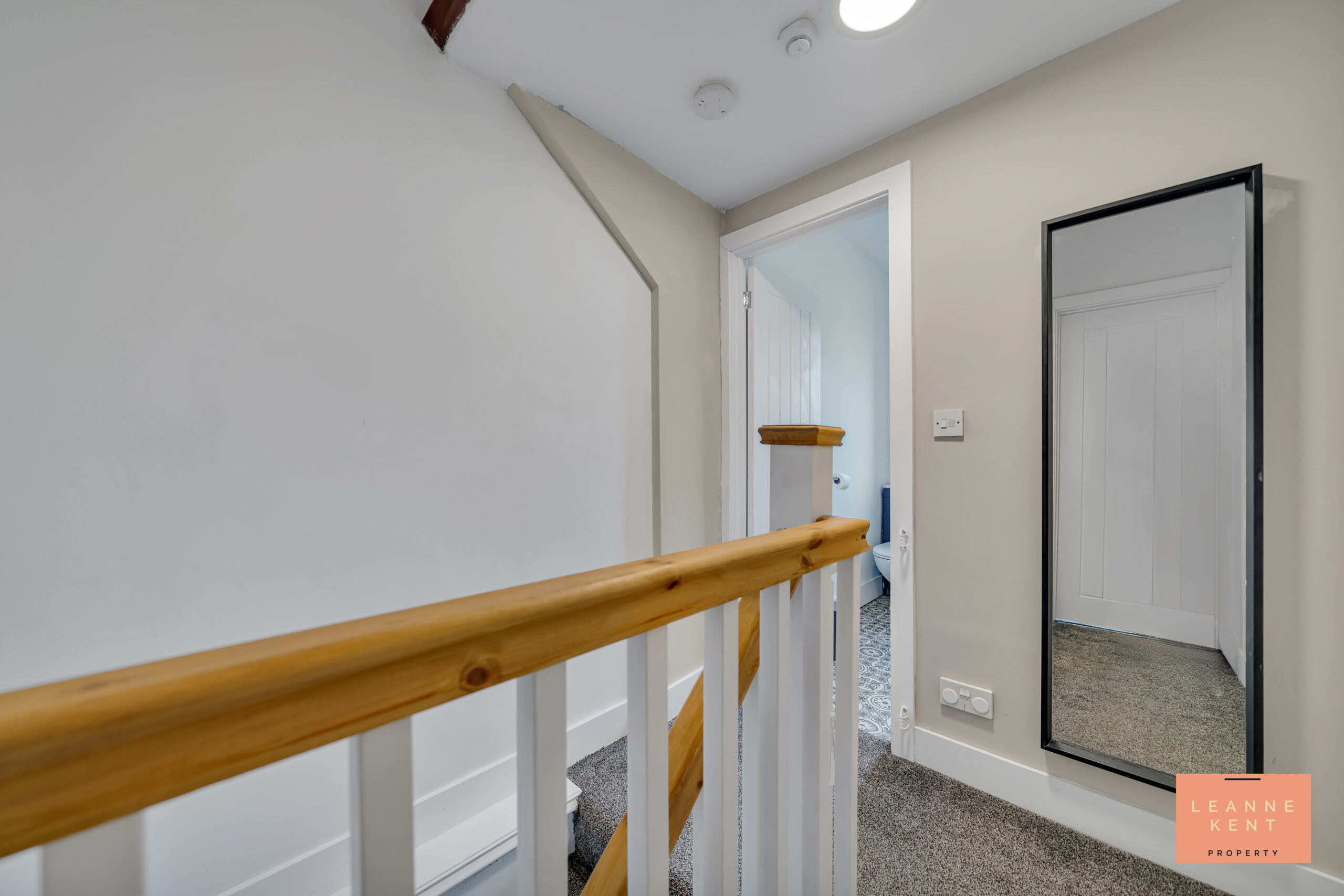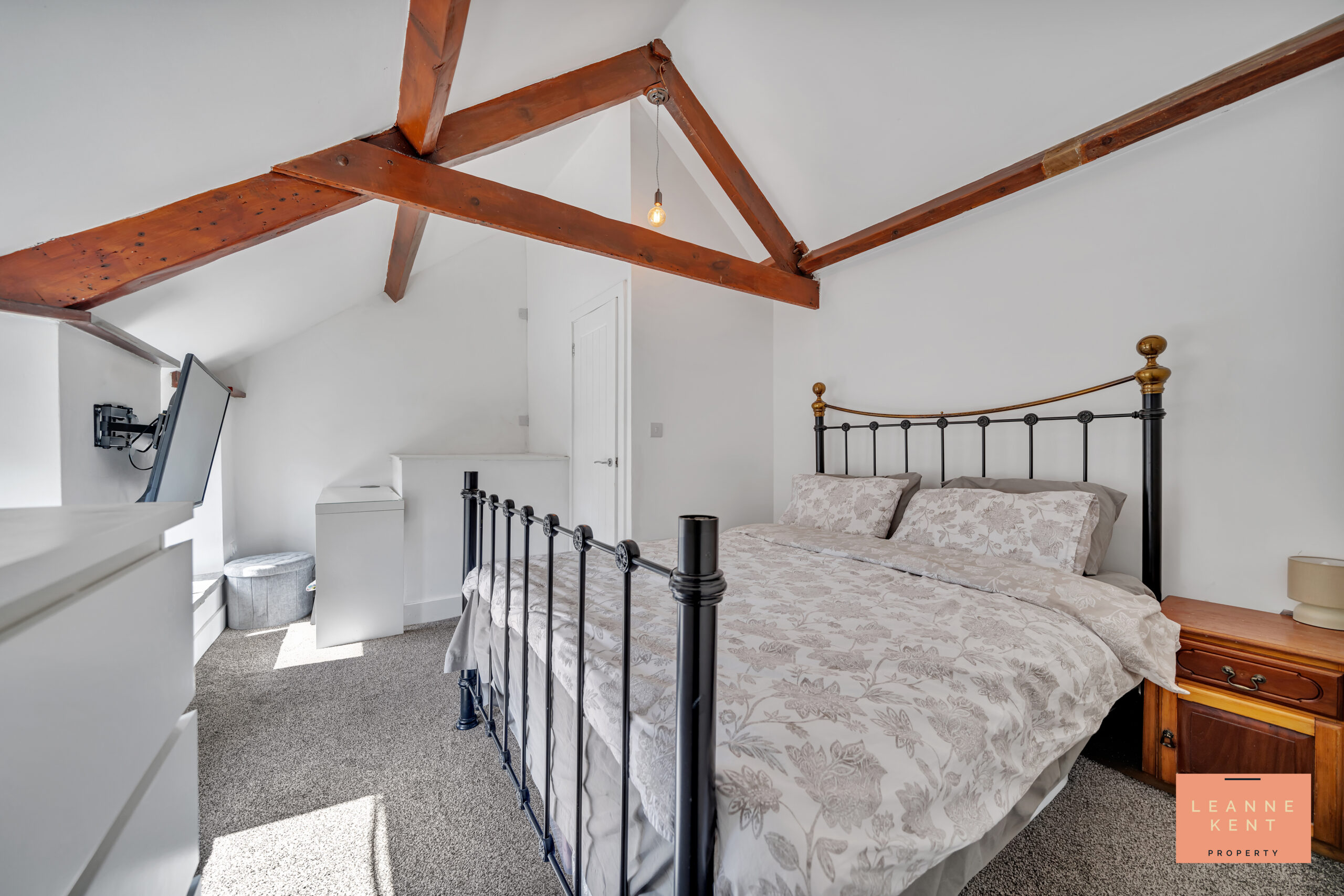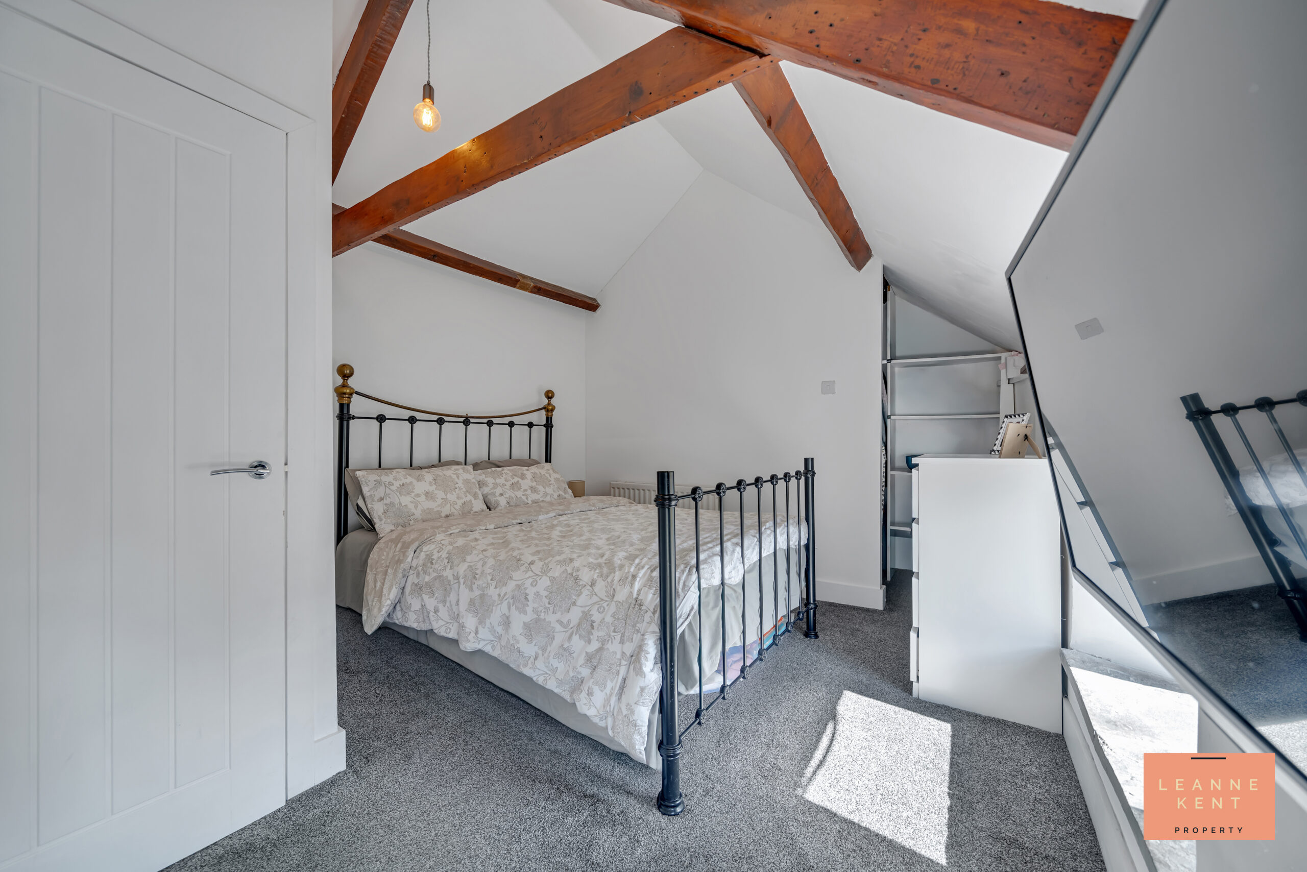 Bedroom one is located at the front of the property and is a good-sized room. The room is tastefully finished with a modern grey carpet and white walls. Two windows to the front allow natural light to flood the room. Wooden beams zigzag the ceiling and add character and charm to the room. On one side is an inset which is being cleverly used as a wardrobe. The room further benefits from a radiator and multiple power sockets.