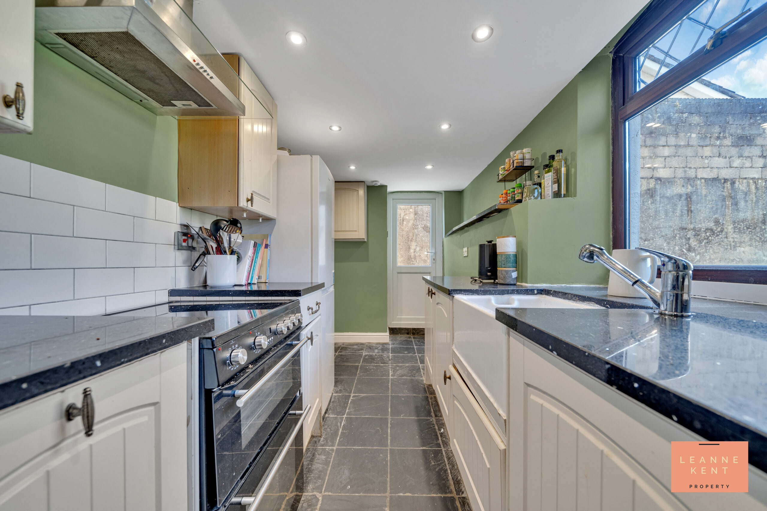 The kitchen is finished with grey slate tiled flooring and soft green walls. The shaker-style kitchen cabinets are complemented by a black speckled worktop. Sitting under one window is a beautiful Belfast sink, which acts as a feature in this room. Opposite is a cooker which is complemented by white splashback tiles and an extractor hood. For convenience, a door leads into a downstairs WC. Another door leads to the side of the house and the garden.