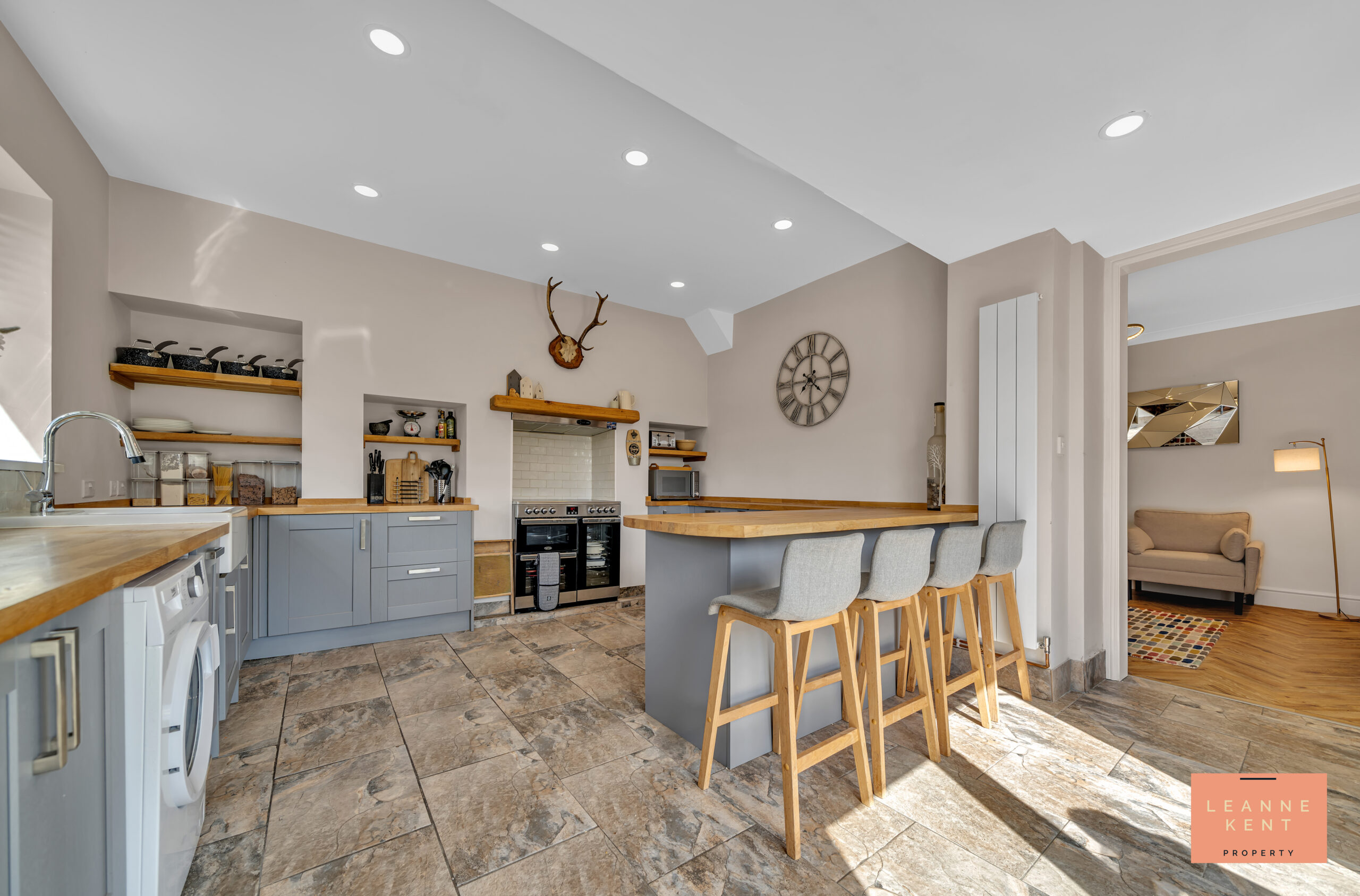 The beautiful kitchen-diner is the heart of the home, finished with natural stone-coloured slate flooring and neutral decor. The shaker-style kitchen cabinets are finished in a stylish grey and feature a wooden worktop. Sitting proudly on one wall is a Belling range cooker with a ceramic hob, a hidden extractor hood, and a tiled splashback. Across from this is Belfast sink, which sits below a large window offering views of the surrounding countryside. A dishwasher is integrated into the cabinetry, whilst next to it is room for a washing machine and a dryer. There is also an integrated fridge freezer. The room also benefits from a breakfast bar, ideal for morning coffee or entertaining. French doors lead into the beautiful garden and the epic games room.