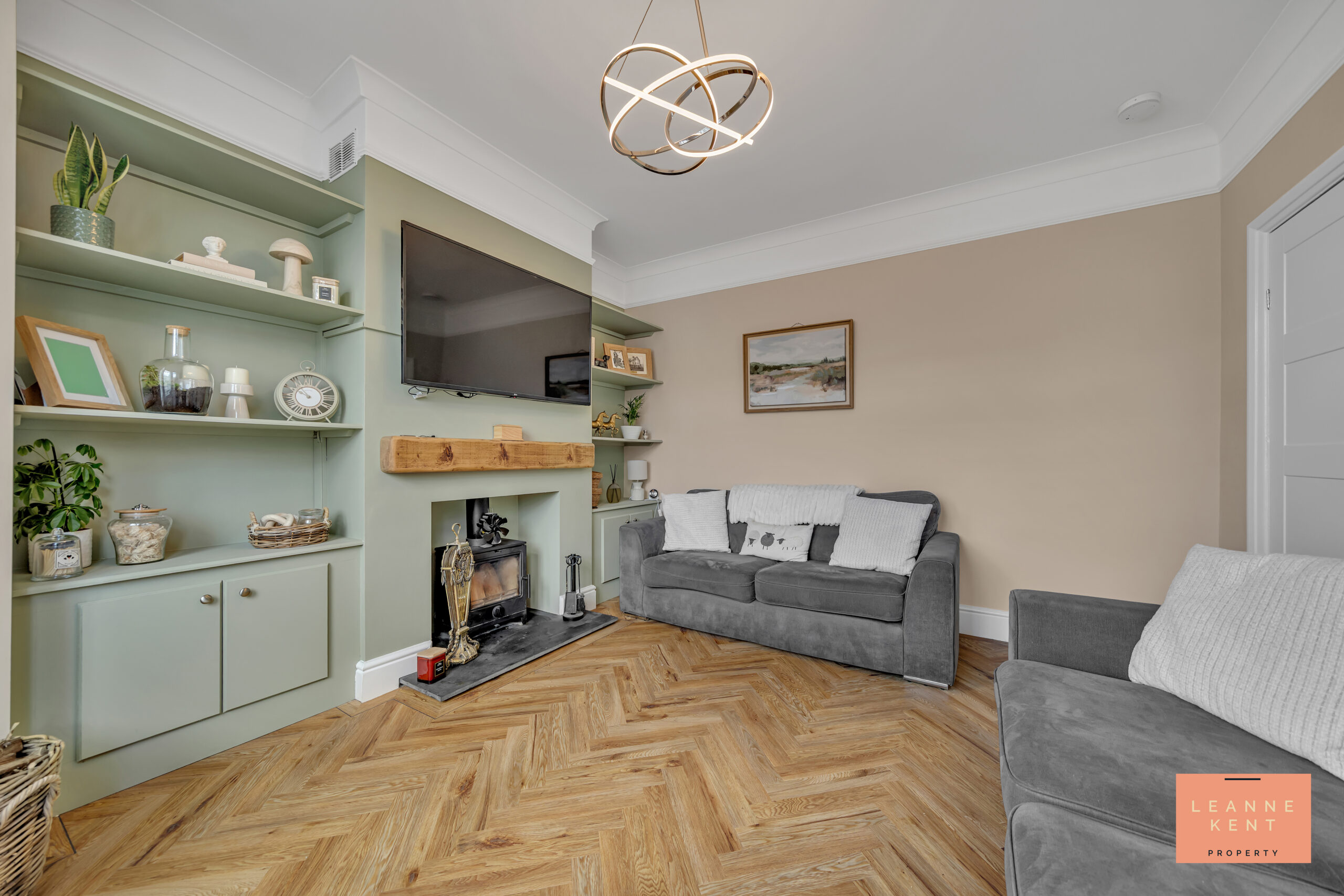 The spacious lounge is beautifully presented and finished with herringbone-style LVT flooring and soft neutral decor. The wall which contains the chimney is finished in a beautiful green and includes shelving and cabinets on each side of the chimney breast. A standout feature is the real wood burner, complete with a slate hearth and an oak-effect floating shelf. A large bay window at the front ensures plenty of natural light during the day. The room further benefits from a radiator and multiple power sockets.