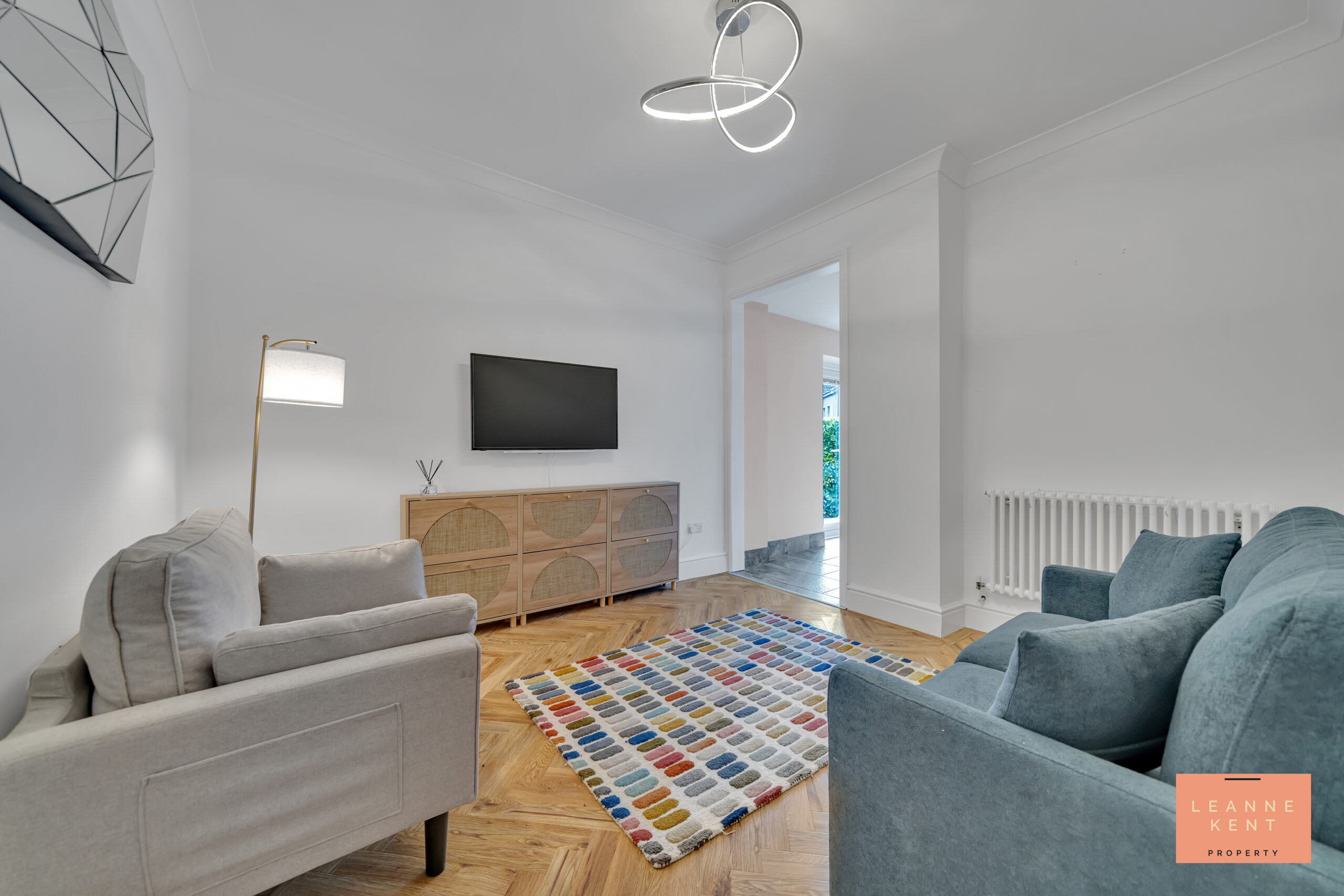 The entrance hall of this beautifully renovated property really sets the stage for what lies within. The floor is laid with beautiful wood-effect herringbone luxury vinyl tile (LVT), and the walls are neutral. On one side is a character radiator opposite the door to the spacious lounge; then there are stairs to the first floor, laid with a modern carpet. Doors also lead into the second reception room and the downstairs toilet/cloakroom.