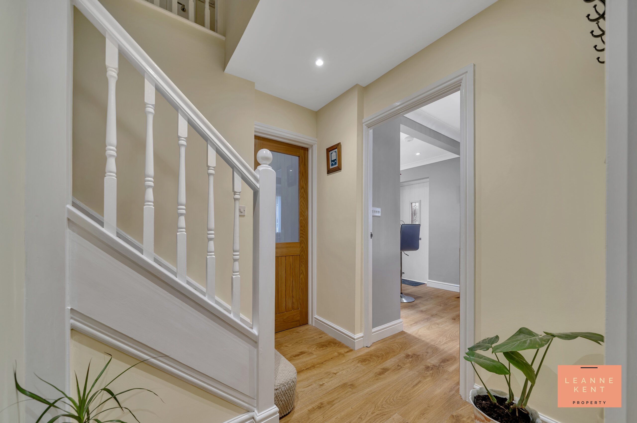 The entrance hall sets the stage for this amazing detached property and provides a warm welcome. As you step inside, you are greeted with beautiful golden oak luxury flooring and soft yellow decor. The flooring and decor blend well with the newly fitted oak veneer doors. These doors provide access into the downstairs WC, the stylish kitchen diner, the spacious lounge and the garage. Stairs lead up to the first floor and are finished with a neutral carpet and a white balustrade.