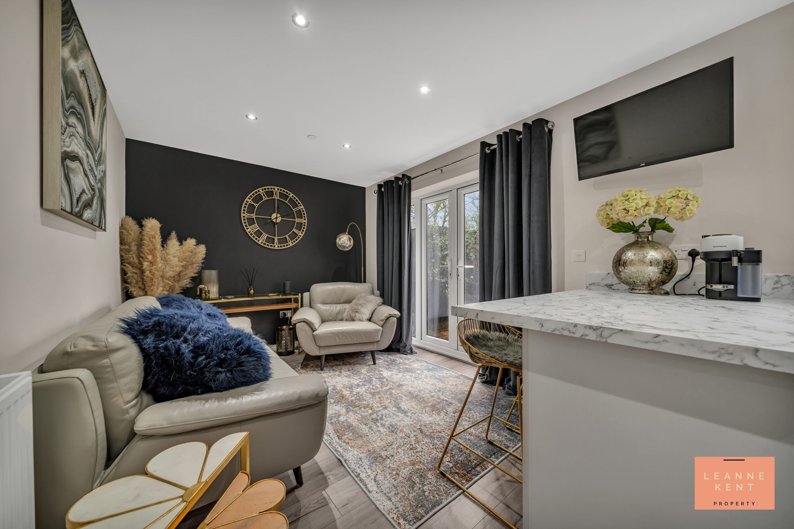 The dining/family area is finished with the same flooring and decor as the main kitchen, ensuring this room integrates well with the open plan layout. One wall is finished in black, which creates a beautiful contrast. Double doors lead out to the beautiful garden. A breakfast bar is also provided, ensuring a space to eat meals, entertain or for morning coffee. There is also a radiator.