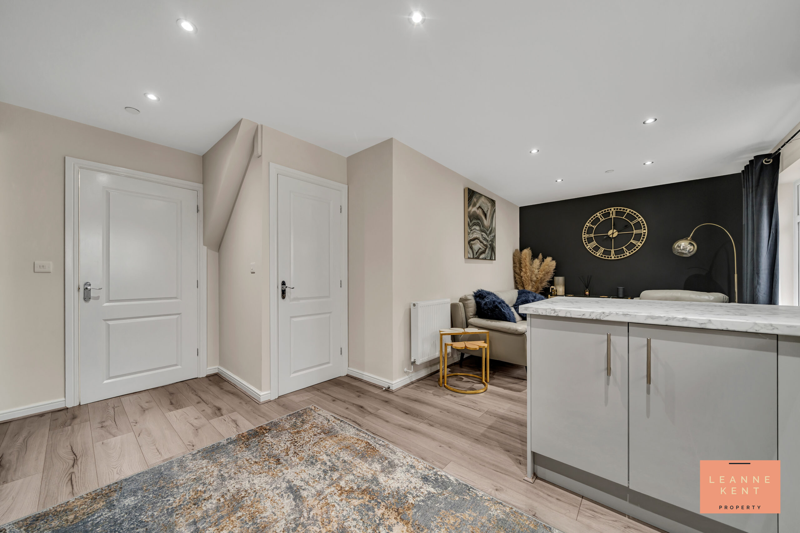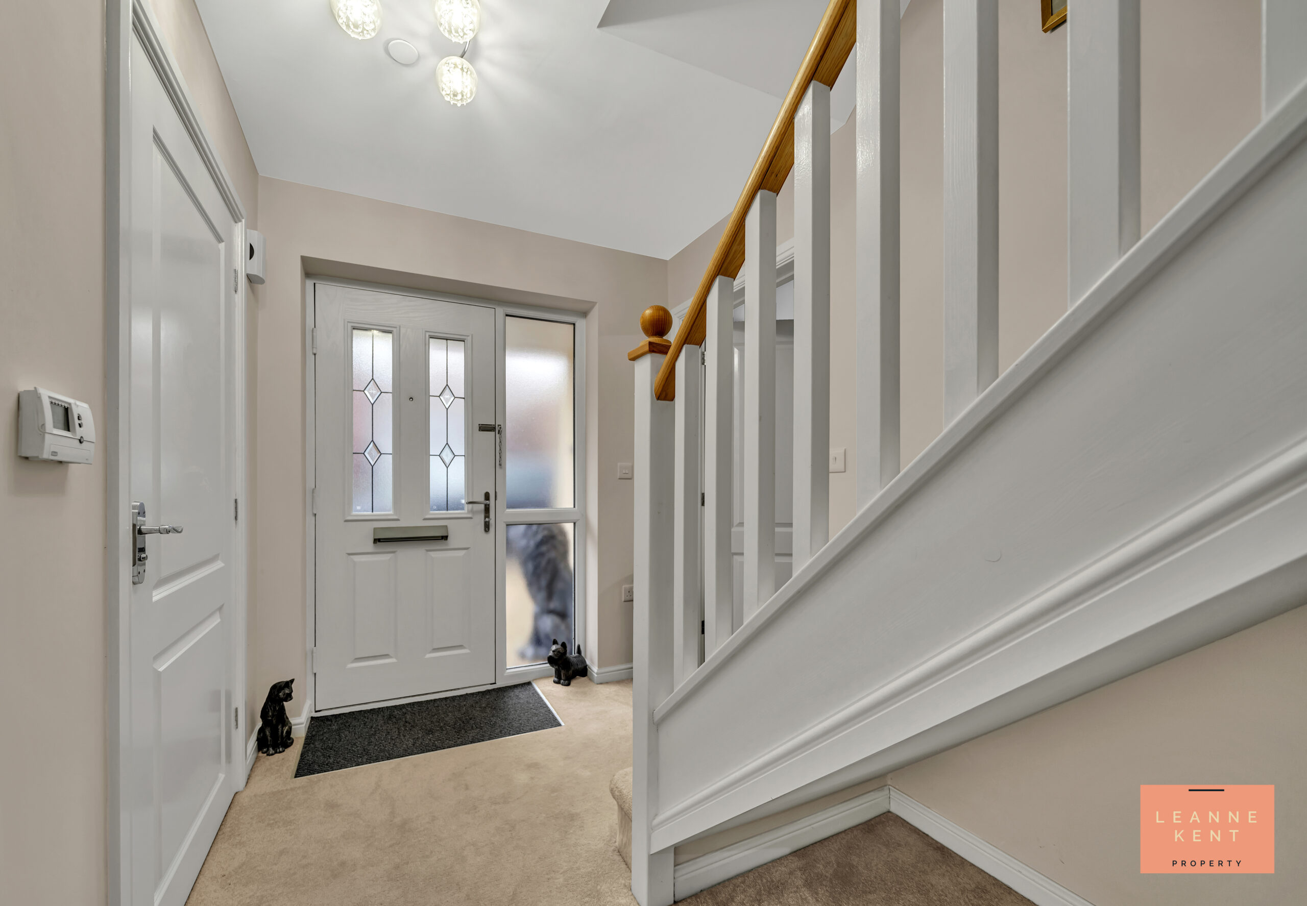 The entrance hall sets the stage for the rest of this beautiful property. As you step inside, you are met with an oatmeal carpet and soft neutral decor. To the left is a door leading into the spacious lounge, whilst on the other side is access to the downstairs WC, and there is also a double cupboard. Stairs on one side lead up to the first floor and are finished with an oatmeal carpet and a white wooden balustrade. The space is modern and stylish, as with the rest of the home.
