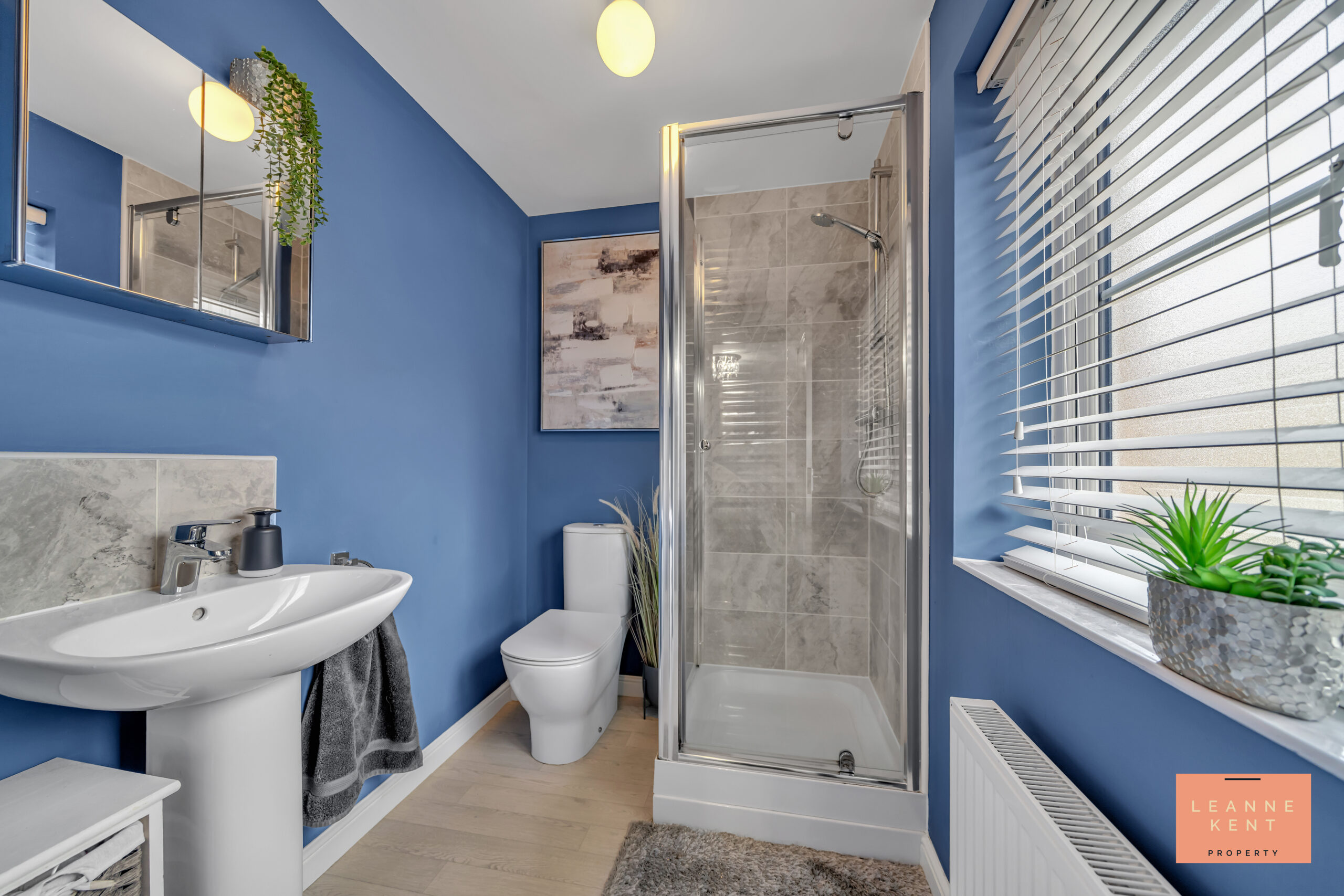 The en suite is tastefully finished with wood-effect flooring and blue walls. In one corner is a large walk-in shower complete with stylish marble-effect wall tiles. Next to this is a modern toilet, and then there is also a hand basin. The room further benefits from a frosted window, a radiator and a large storage cupboard.