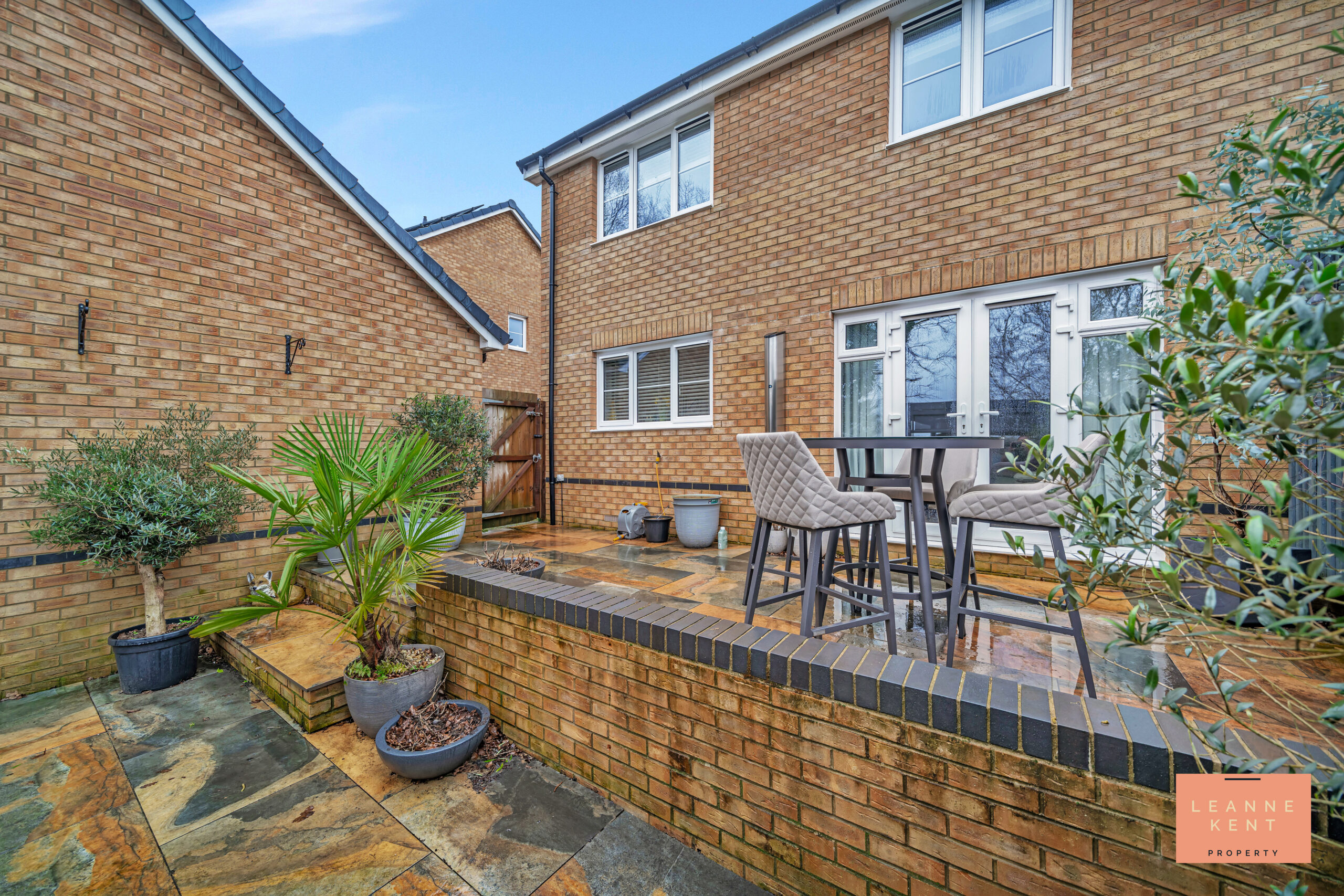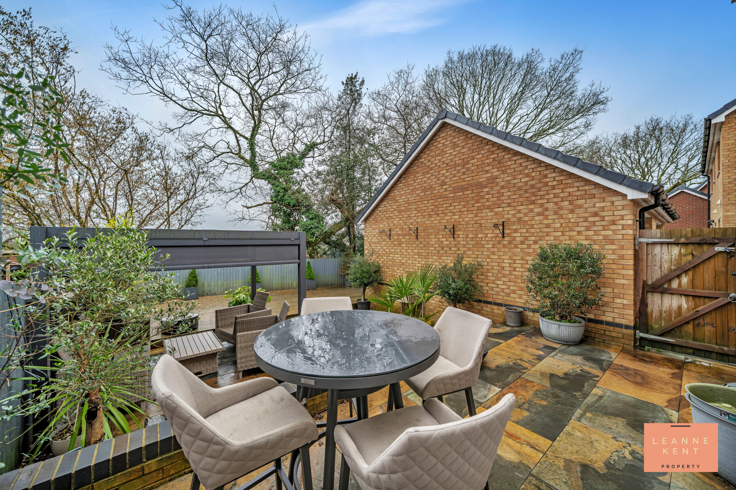 The beautiful south-facing garden offers a low-maintenance and private outdoor space, which is ideal for relaxing with family or entertaining. As you step from the back door, you are greeted with stunning rustic copper patio tiles which span the width of the house. From here, a step leads down into the main garden where more of the same patio tiles are laid, creating a large entertaining area. To one side is a stylish anthracite pergola complete with a retractable roof and pull-down sides. To the rear of the garden is a large decked area, offering another great place to sit and enjoy this amazing outdoor space. Behind the garage, there is space which is ideal for a shed or other storage. A low-slung wooden fence provides views over the fields behind and promises the odd visit from the horses, which is a great touch. A gate leads to the driveway for convenience.