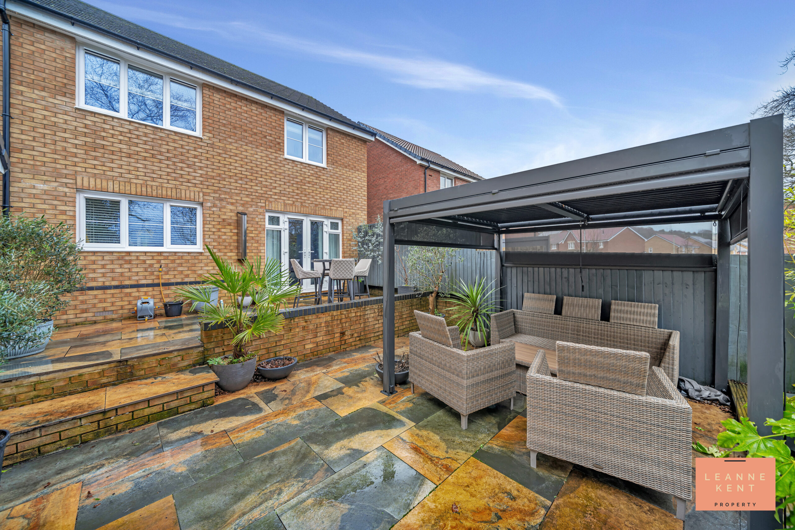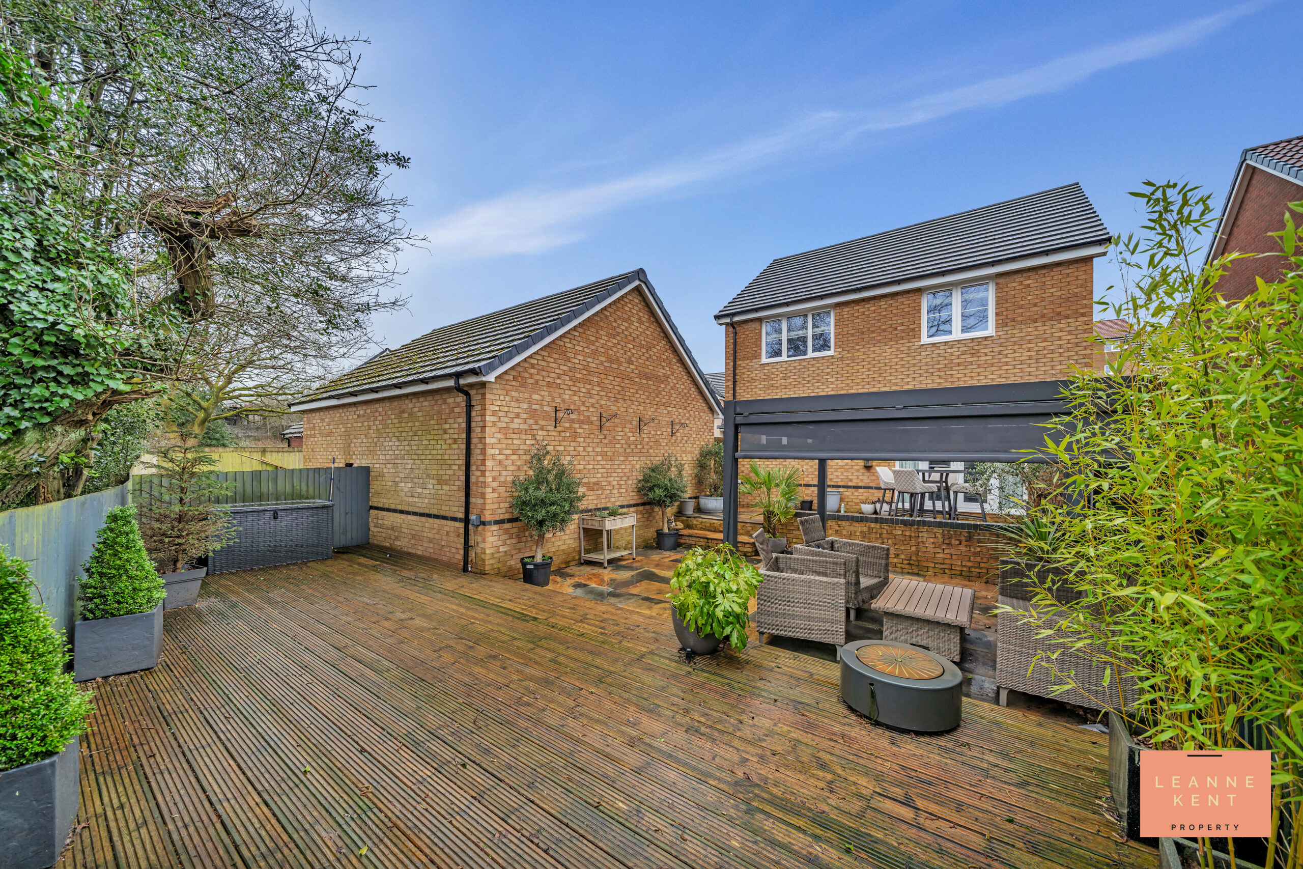 Stepping outside, the beautiful south-facing garden provides a private and low-maintenance outdoor retreat, perfect for both relaxation and entertaining. Immediately from the back door, you are welcomed by rustic copper patio tiles that span the width of the house, creating a striking first impression. A step leads down to the main garden, where additional patio tiles form a large entertaining area, seamlessly blending style and functionality. To one side, a contemporary anthracite pergola with a retractable roof and pull-down sides offers a sheltered space to enjoy the outdoors in any weather. At the rear, a generous decked area provides another inviting spot to sit and unwind, while behind the garage, there is useful space for a shed or additional storage. A low-slung wooden fence frames views over the fields behind, with the occasional visit from horses adding a charming rural touch. For added convenience, a gate leads directly to the driveway. The property also benefits from a detached garage with lighting and power, as well as a well-presented driveway offering parking for two vehicles. This outstanding outside space perfectly complements the stylish interior, making this property a truly exceptional place to call home.