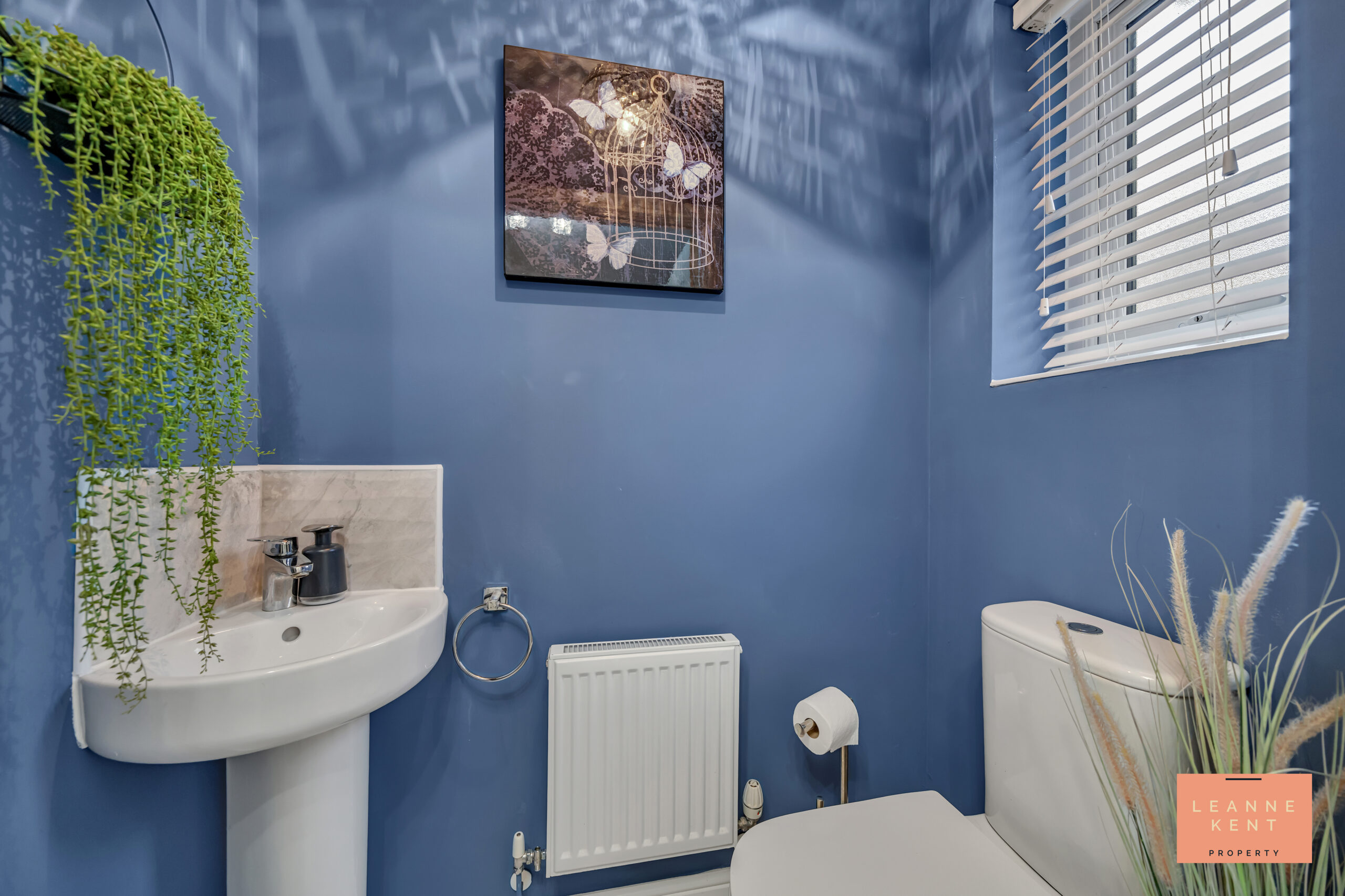 The downstairs WC is beautifully presented and finished in a beautiful blue colour. A modern hand basin sits in one corner, complete with a stylish splashback, whilst a modern toilet sits across from this. There is also a window and a radiator.