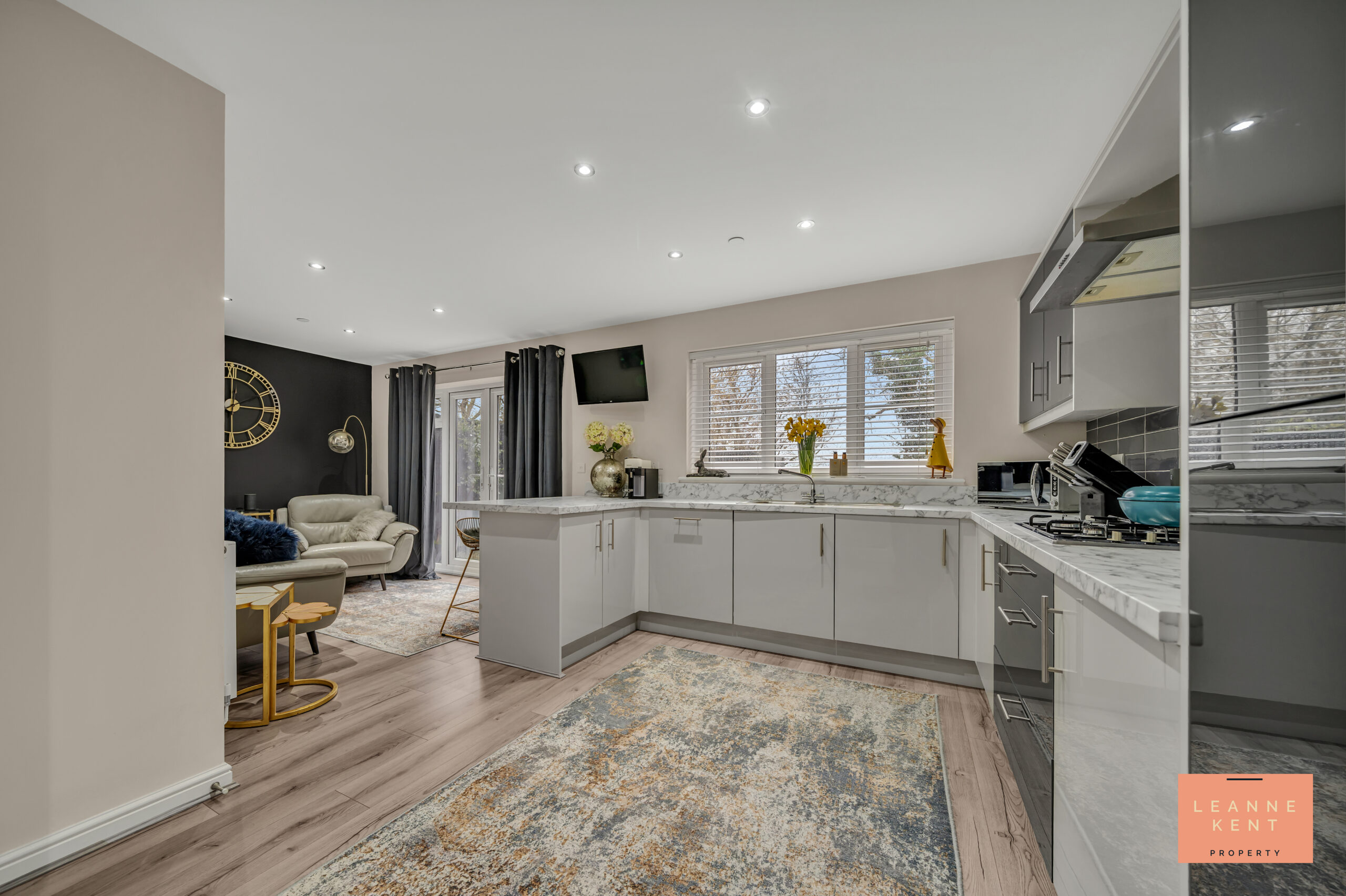 The beautiful kitchen is modern and stylish, and open-plan with the dining area. The floor is laid with stunning wood-effect flooring, whilst the walls are finished in a soft neutral colour. The kitchen cabinets are finished in a light grey gloss and contrasting dark grey gloss colour, and complemented with a white marble effect worktop. Some of the cupboard doors are finished in a contrasting gloss black colour, which really works in this modern kitchen. A hob sits below a modern extractor hood and also includes stylish grey splashback tiling. Close to this is a double oven, which is expertly integrated into the cabinetry. The fridge-freezer, dishwasher, and washing machine are integrated. A sink sits below a large window, which offers views of the garden and the countryside beyond. Across the room is the beautiful dining area, which is currently used as an additional family area. There is also a cupboard for storage.