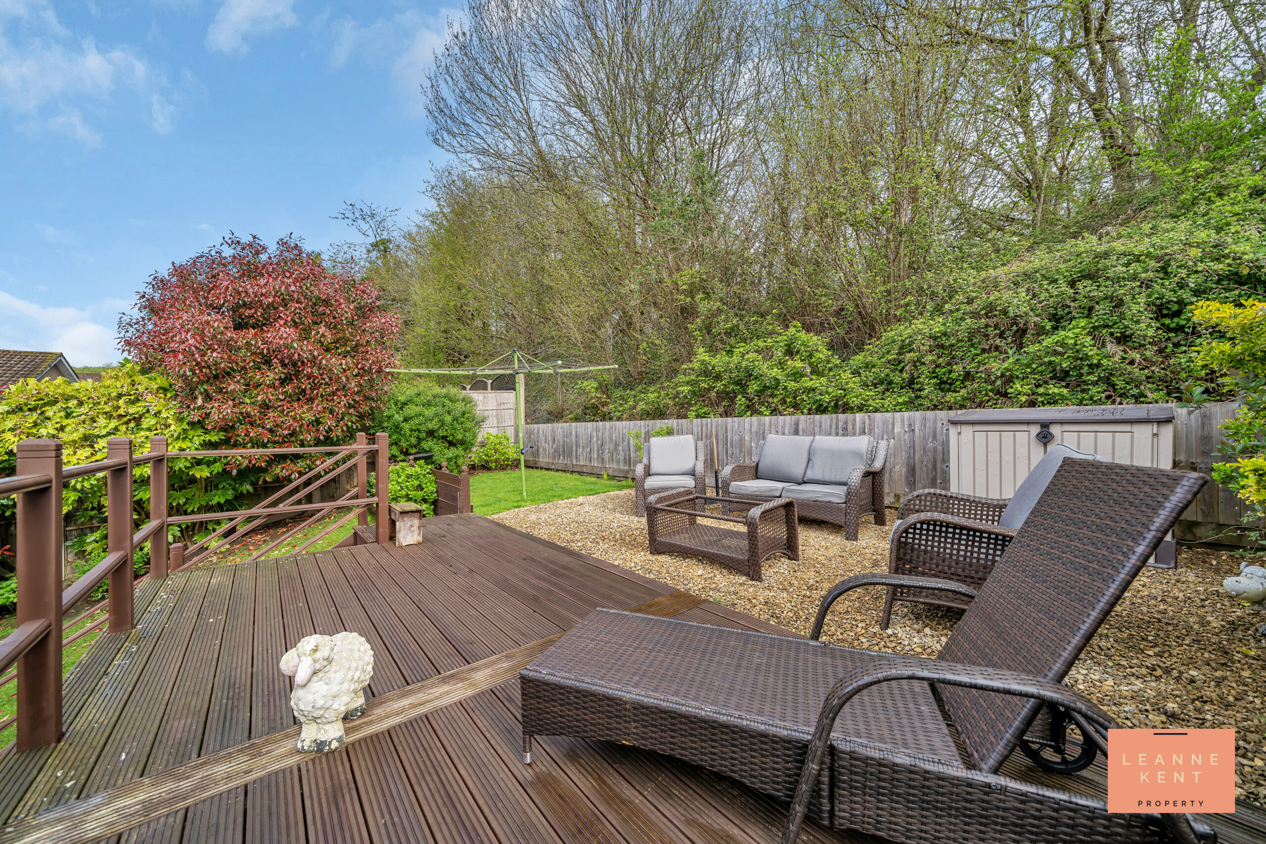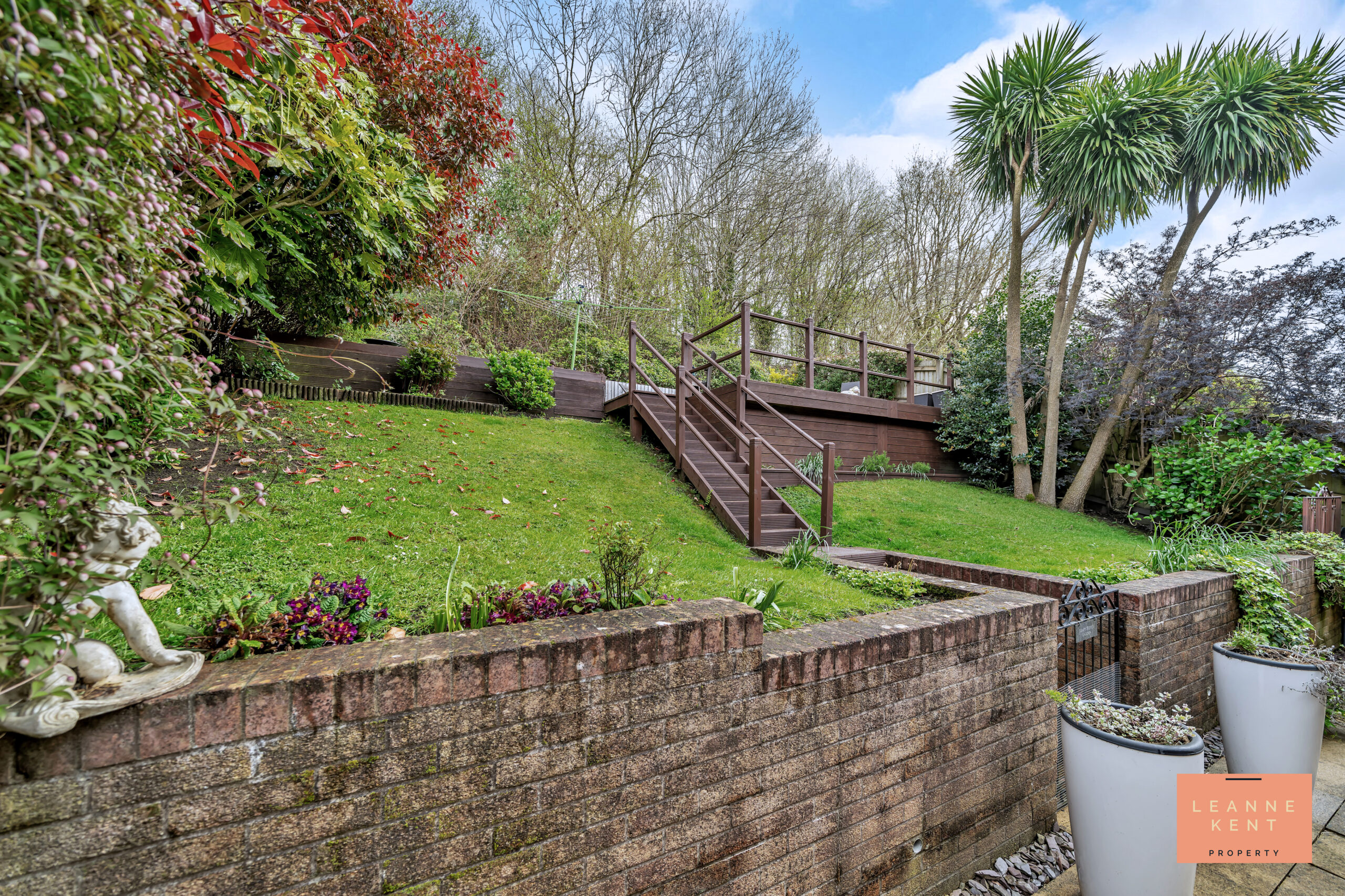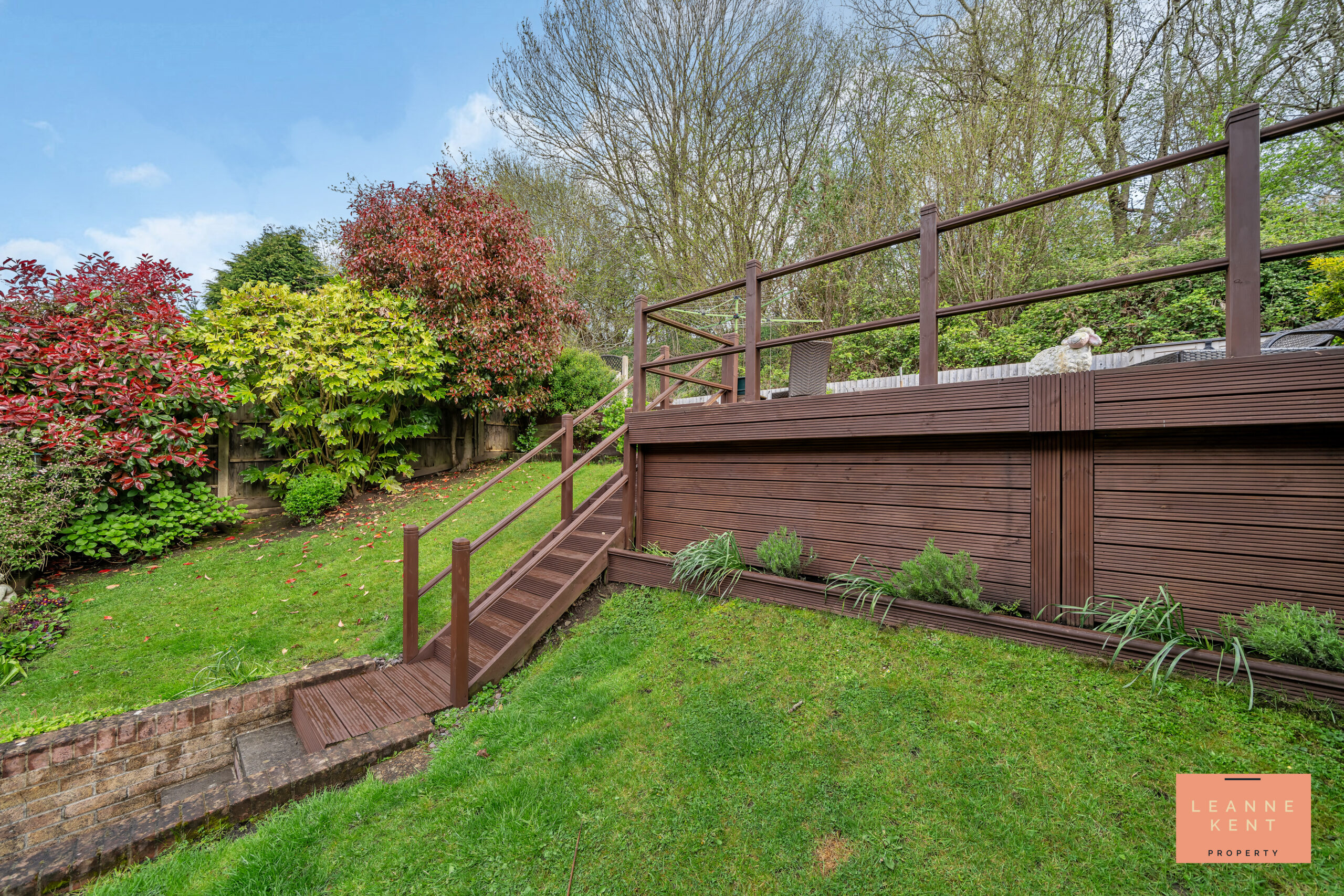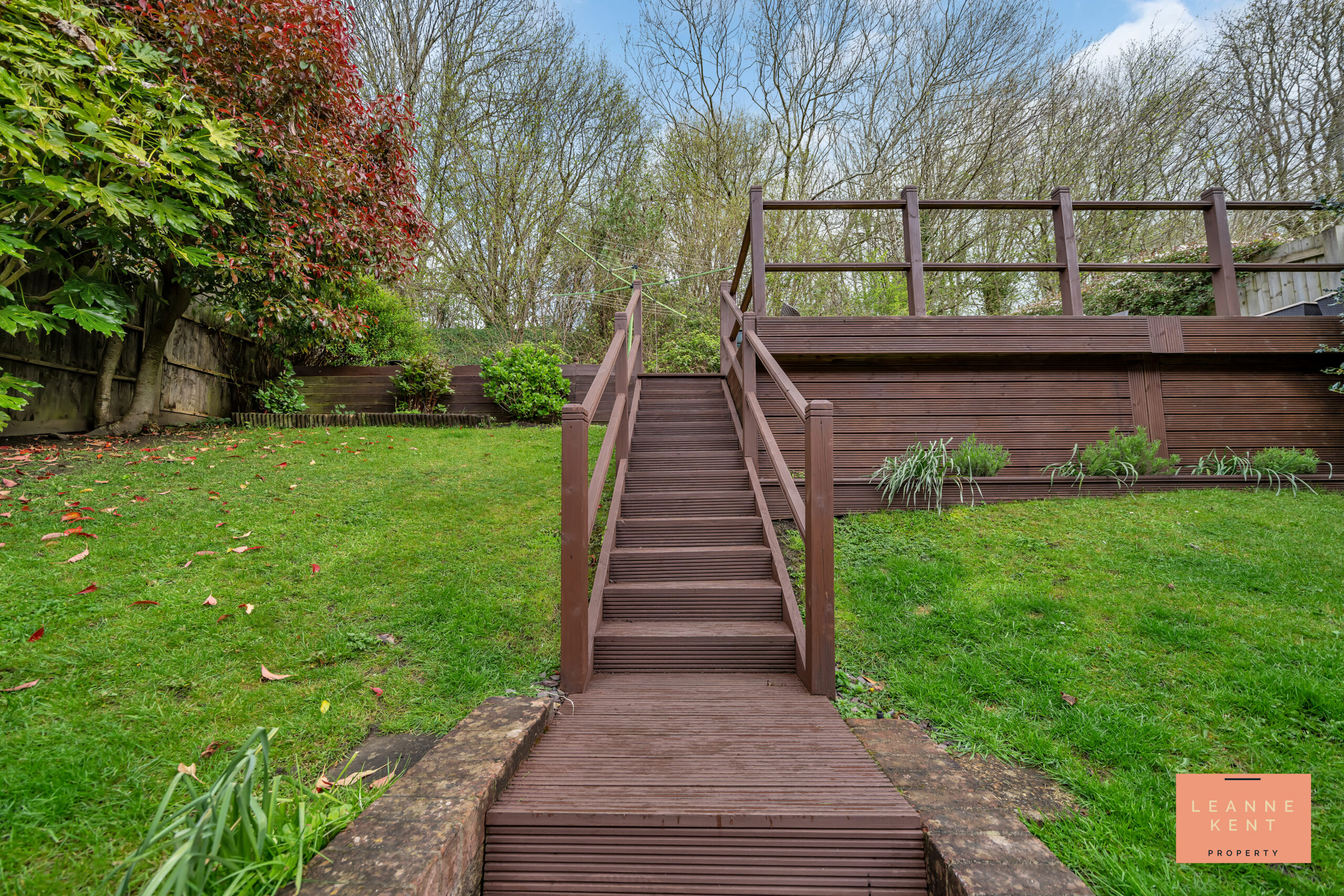 The spacious garden is beautifully presented and offers an amazing outdoor space. As you step out of the back of the house, you are greeted by a large patio that spans the width of the property. This is a great area for a table-and-chair set and entertaining. From here, wooden steps lead upwards with a grassed area on each side. At the top is a beautiful wooden deck area that offers amazing views and is a great space to enjoy this garden. On one side is an area with grass, and then on the other side is the decked area, complete with decorative stones next to it. To the rear are mature trees and bushes, and beyond that are fields, ensuring this garden is very private.