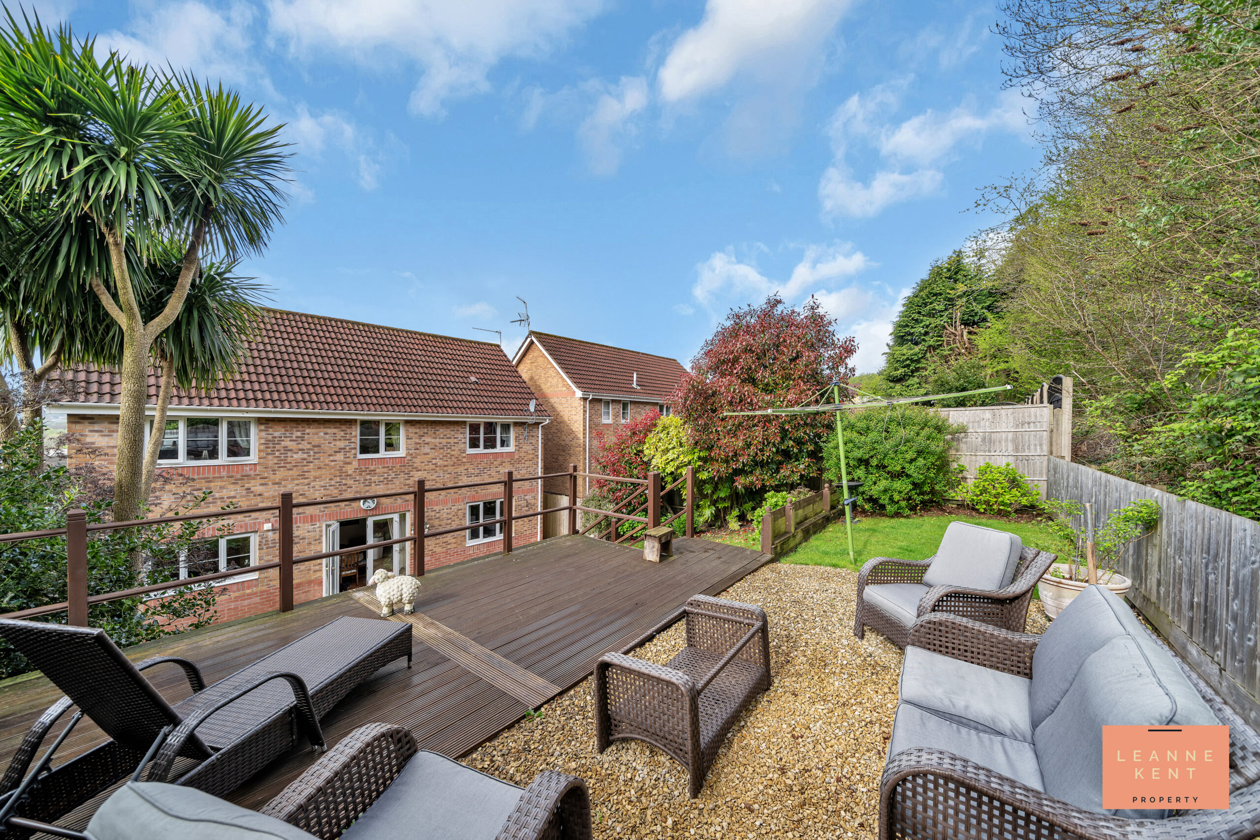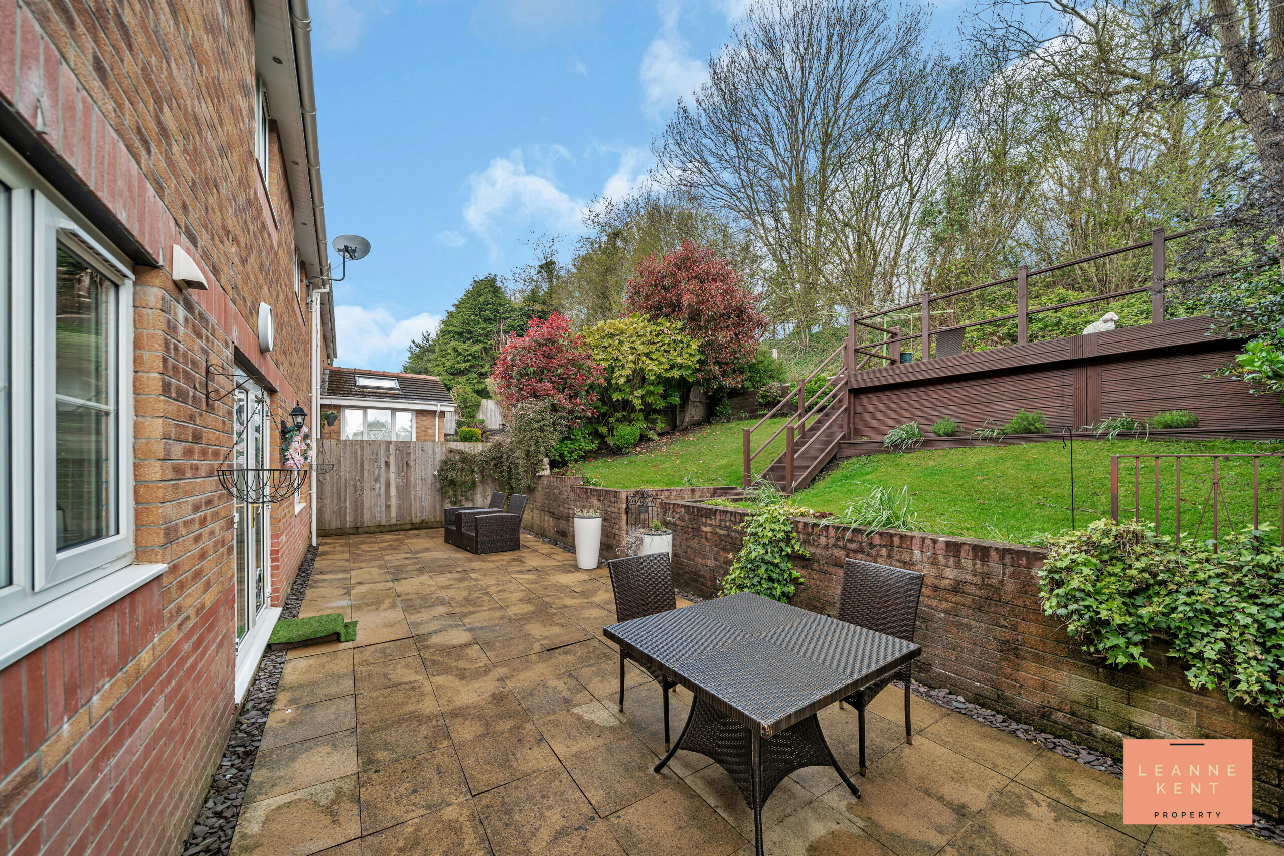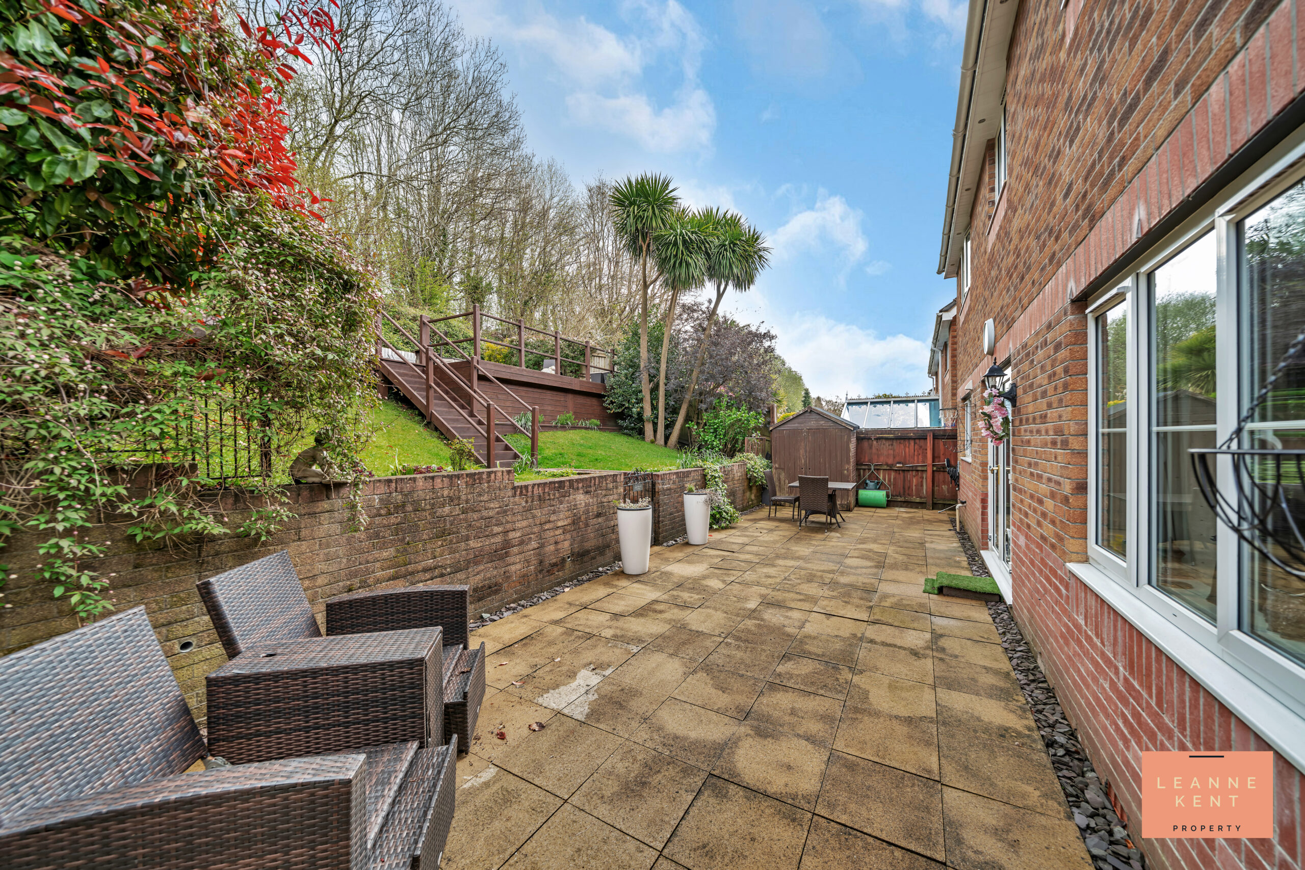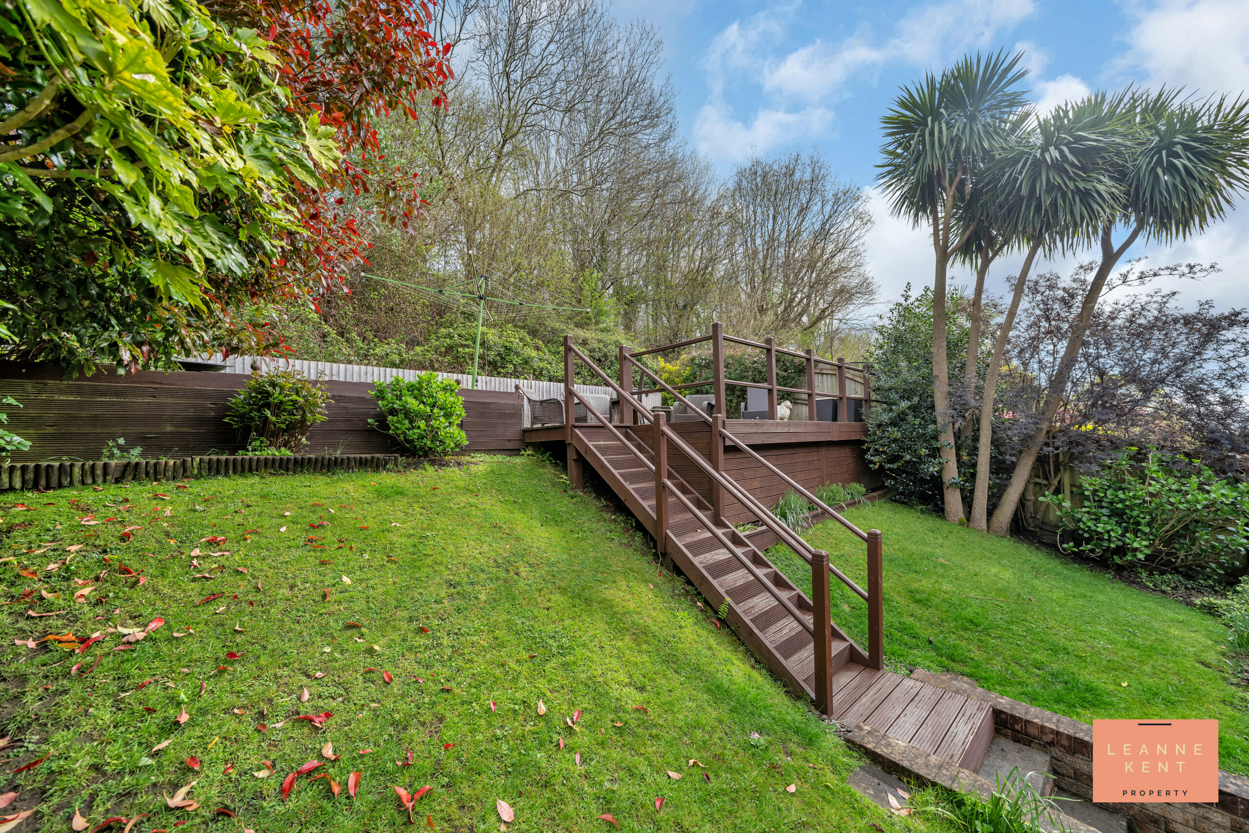 The spacious garden is beautifully presented and offers an amazing outdoor space. As you step out of the back of the house, you are greeted by a large patio that spans the width of the property. This is a great area for a table-and-chair set and entertaining. From here, wooden steps lead upwards with a grassed area on each side. At the top is a beautiful wooden deck area that offers amazing views and is a great space to enjoy this garden. On one side is an area with grass, and then on the other side is the decked area, complete with decorative stones next to it. To the rear are mature trees and bushes, and beyond that are fields, ensuring this garden is very private.