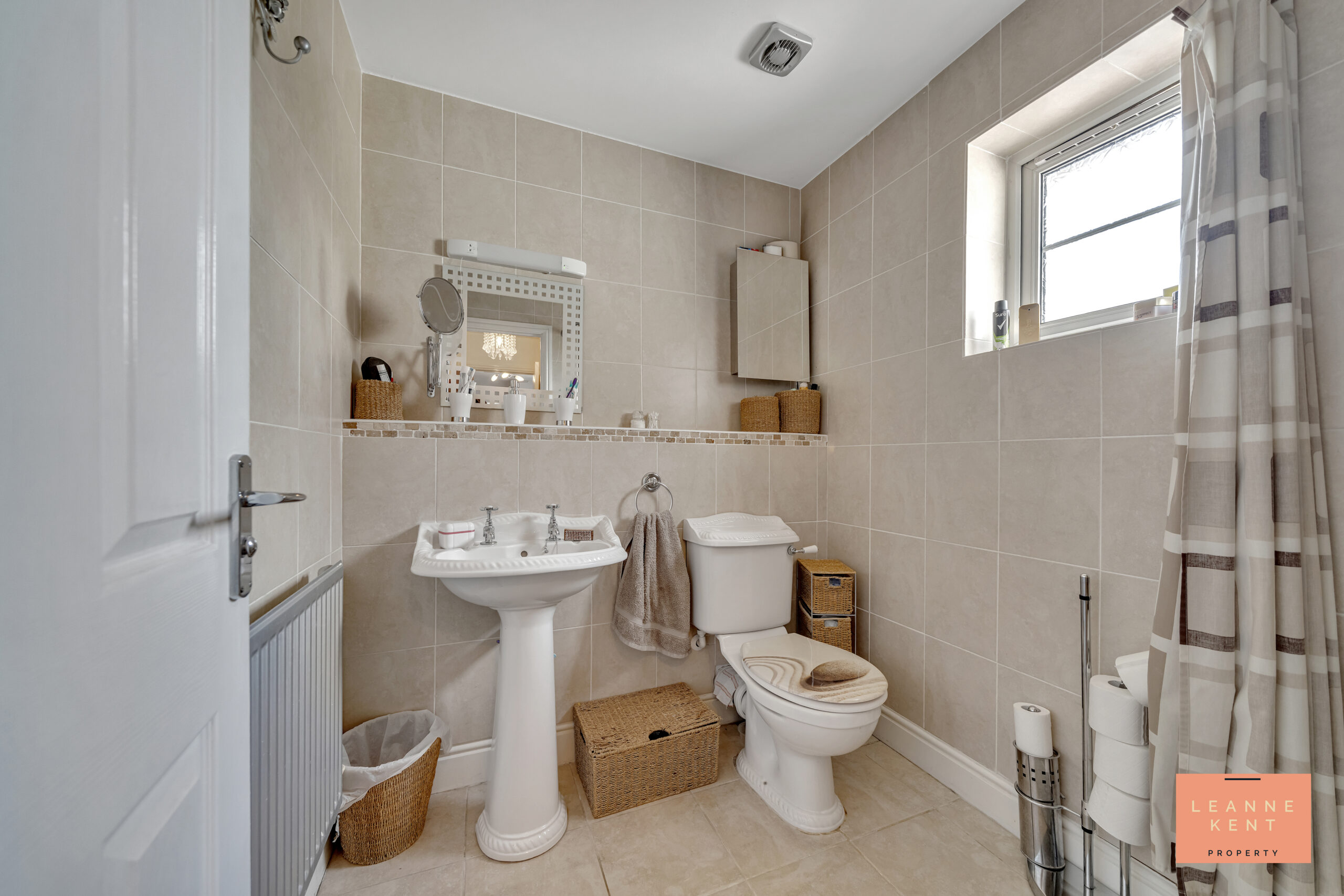 The en suite bathroom is tastefully finished with cream wall and floor tiles. In one corner is a walk-in shower, whilst opposite is a modern toilet and a hand basin. The room further benefits from a radiator and a frosted window.
