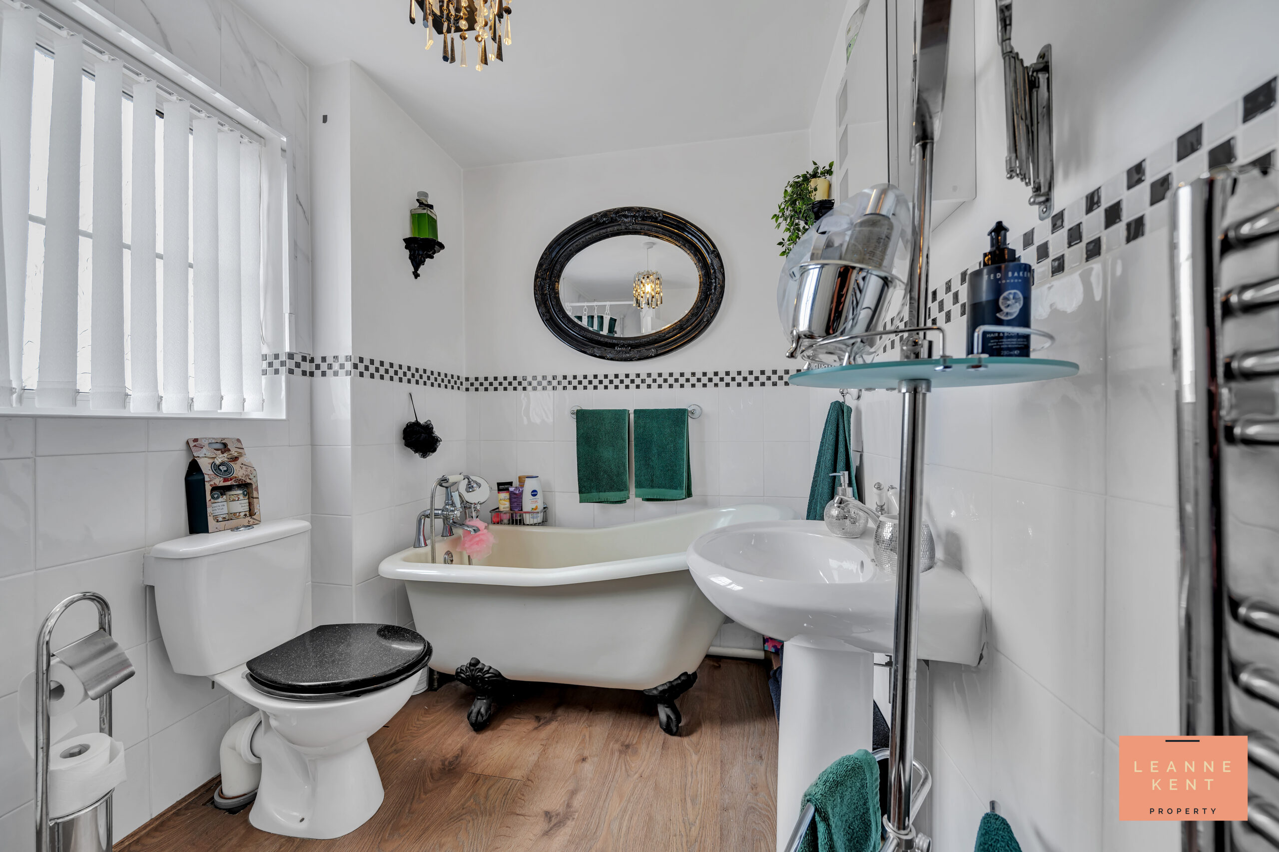 The family bathroom is tastefully finished with stylish wood-effect flooring, white walls, and white tiling. At the far end is a freestanding roll-top bath so you can bathe in luxury. Next to this is a modern toilet and a hand basin, whilst in the corner is a walk-in shower. There is also a frosted window and a chrome heated towel rail.