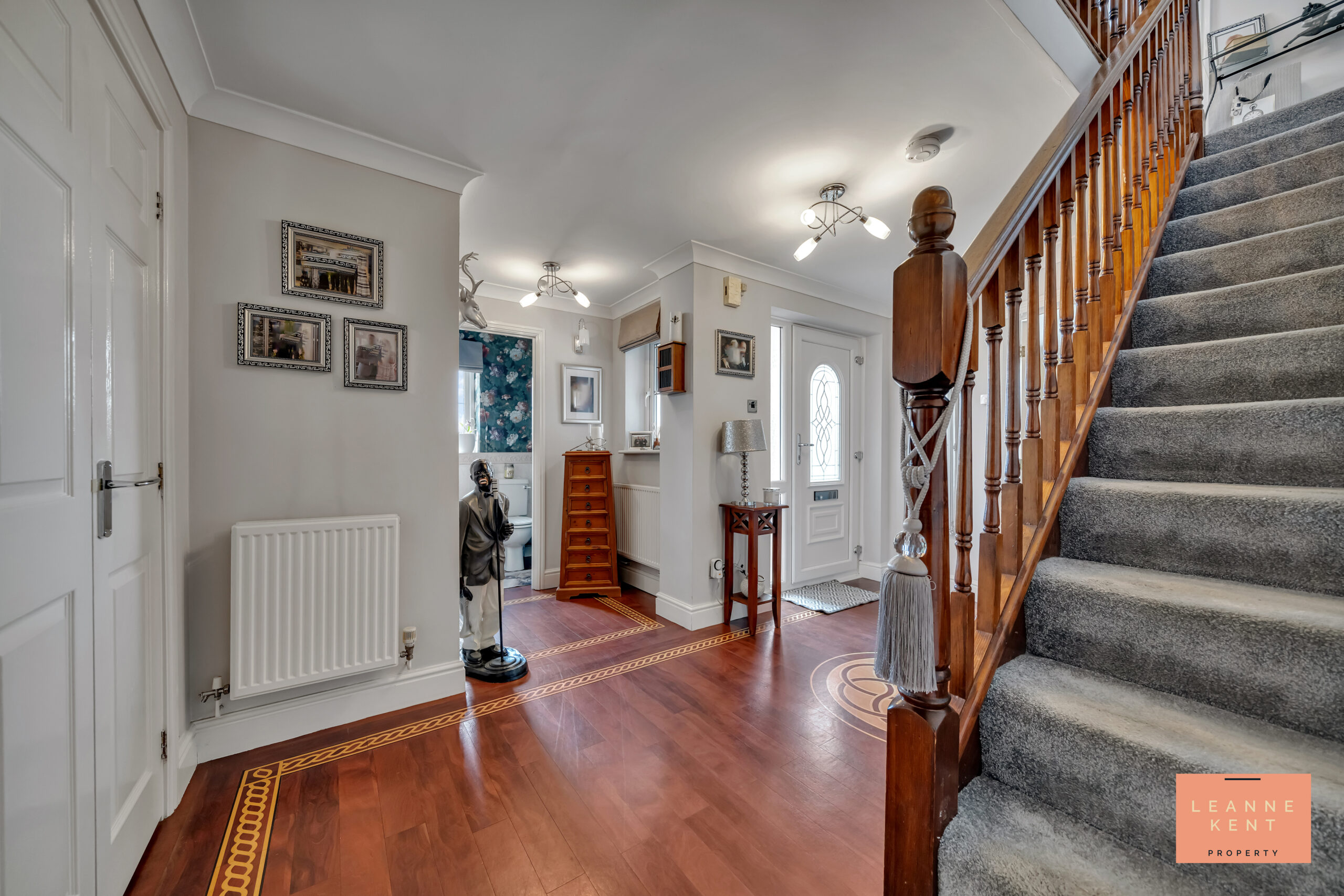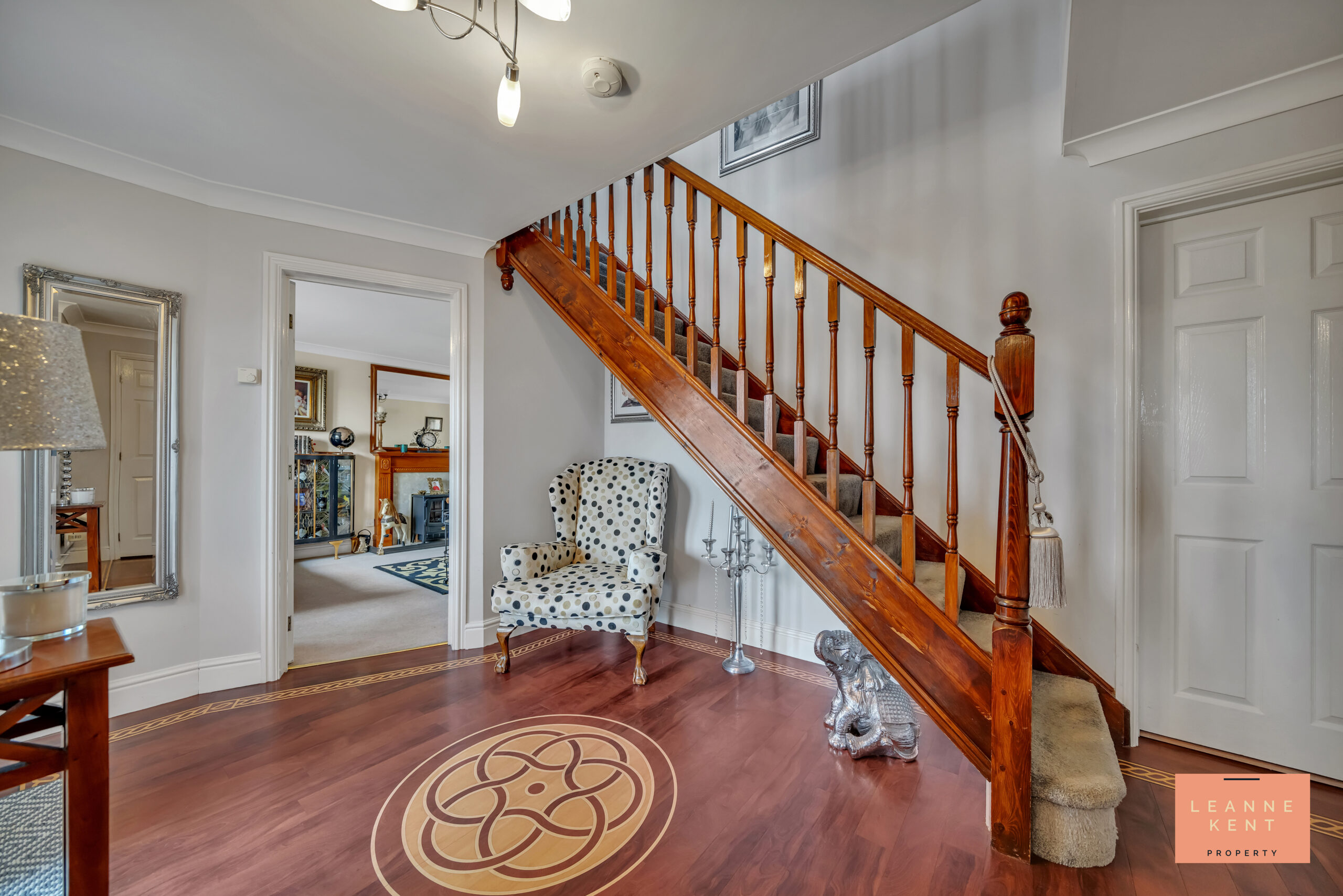 The impressive entrance hall is beautifully presented and sets the stage for the rest of this amazing property. The space is finished with stunning wood-effect flooring, which includes intricate detailing. To the front is a grand staircase leading to the first floor, whilst doors lead into the large kitchen diner, the spacious lounge and the front reception room. There is also a double cupboard for storage.