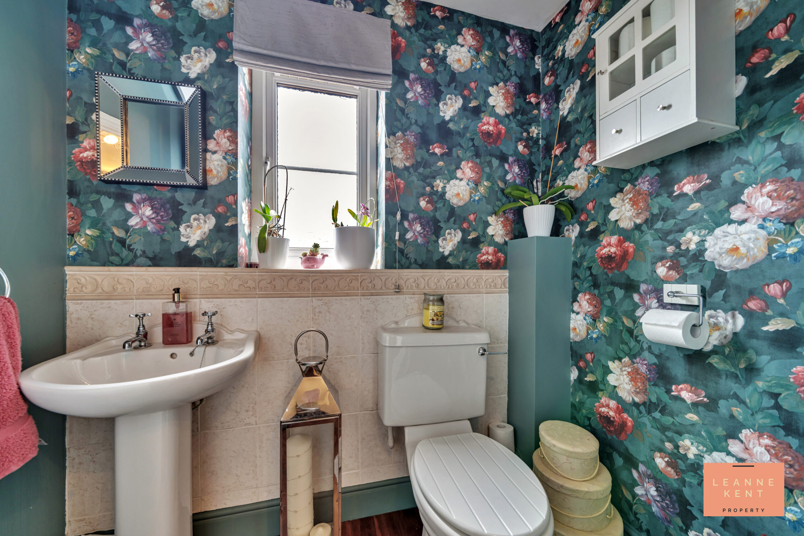 The property benefits from a downstairs WC which is tastefully finished with wood-effect flooring and stylish flower-inspired wallpaper. The room includes a modern toilet and a hand basin.